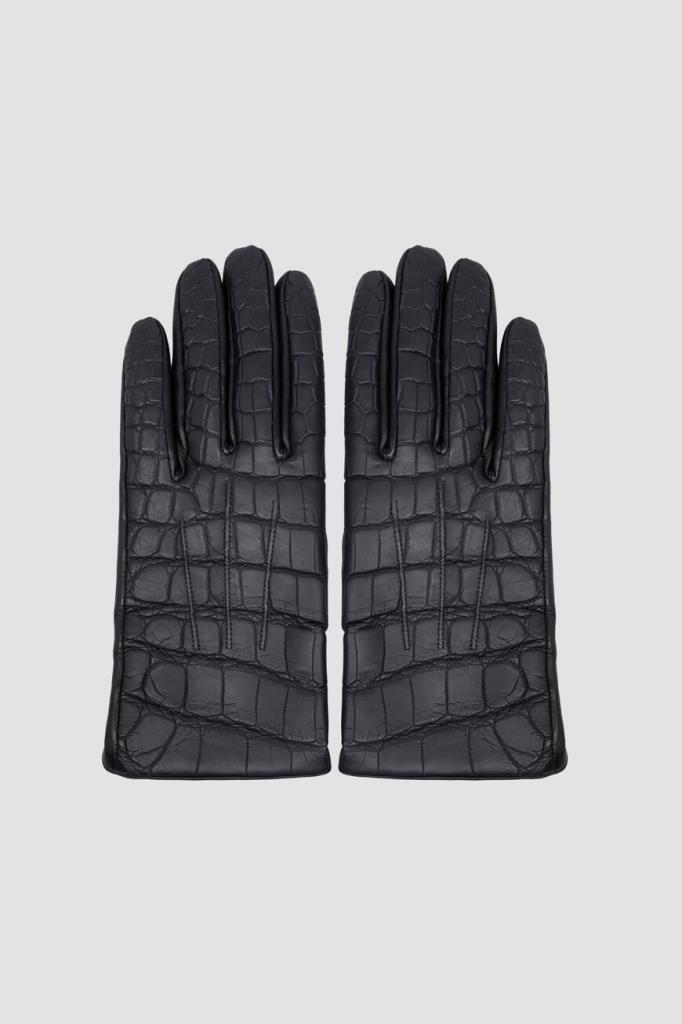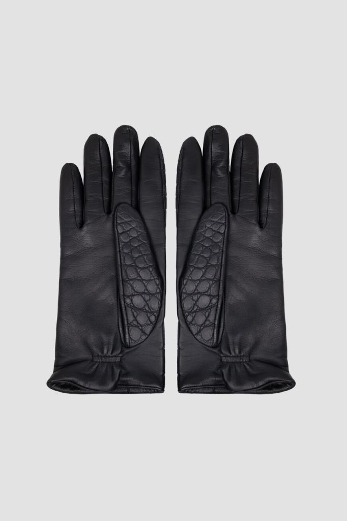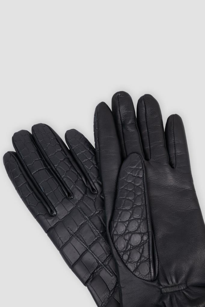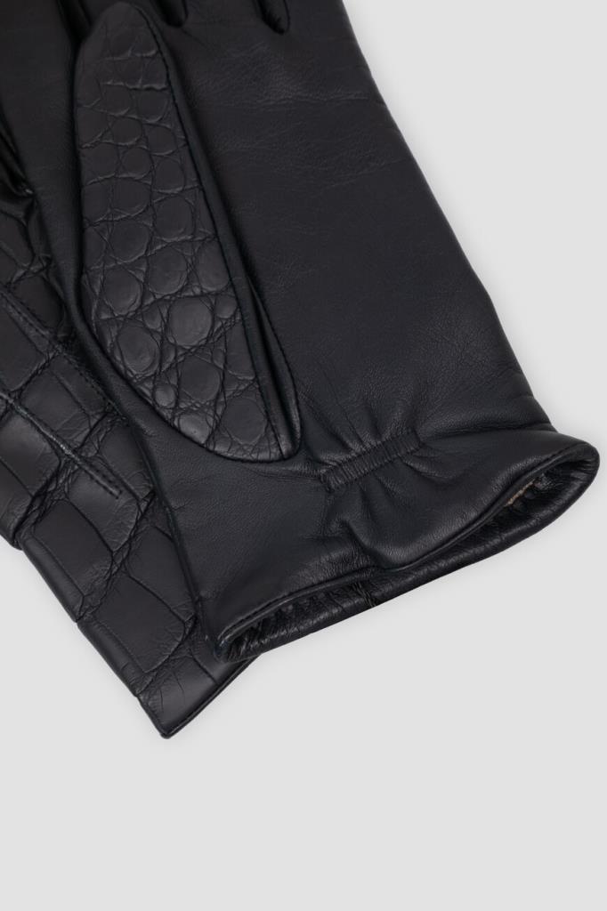 Тёмно-синие перчатки Bardini плотно облегают кисть, но не сковывают её движения. Для изготовления комбинированной модели выбраны гладкая кожа ягнёнка и фактурная кожа крокодила с уникальным природным узором, который никогда не повторяется. Выполненный вручную аксессуар характеризуется небольшой сборкой на запястье.