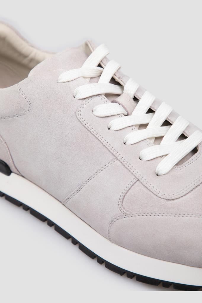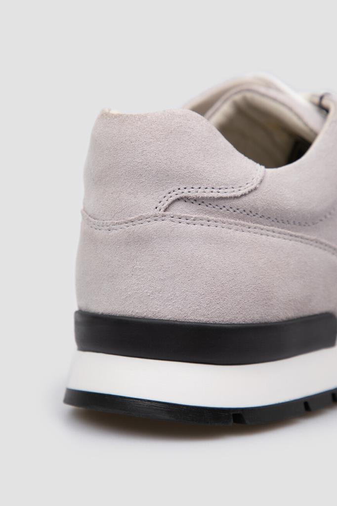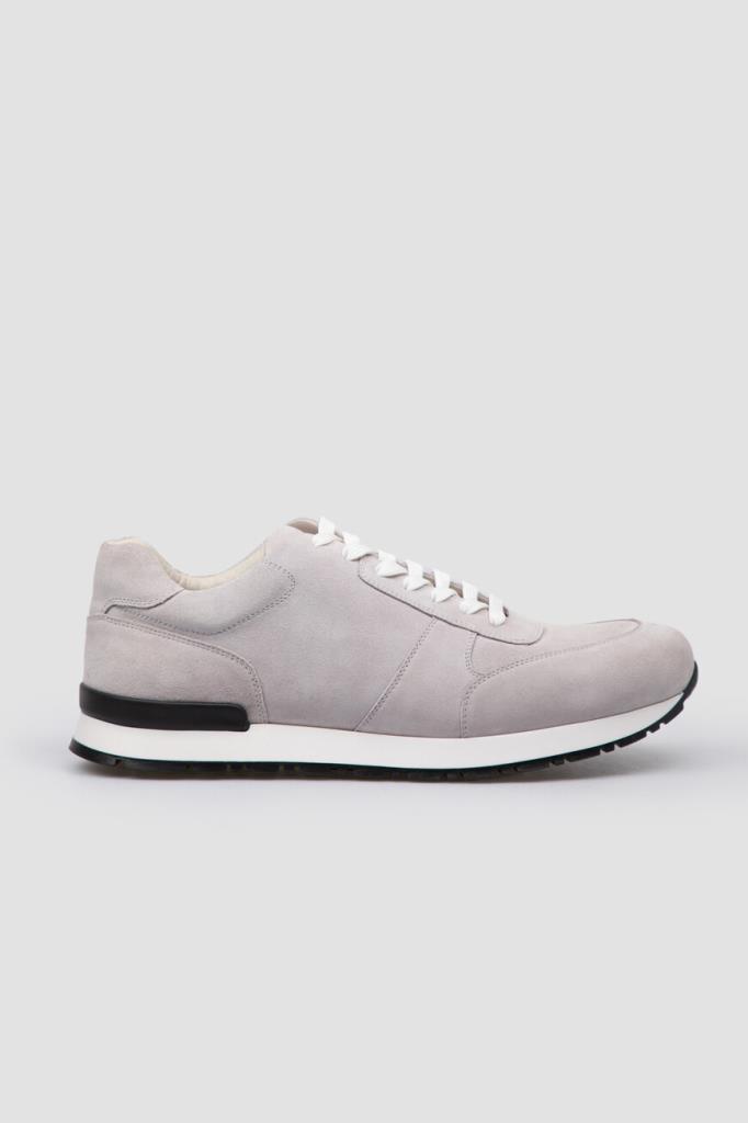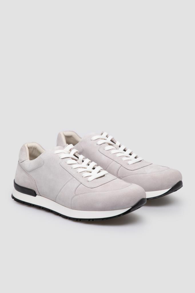 Выполненные вручную кроссовки Bardini с укреплёнными носком и задником. Пара из мягкой бархатистой замши окрашена в нейтральный серый оттенок и дополнена амортизирующей резиновой подошвой в чёрно-белой гамме с протектором для надёжного сцепления с дорогой. Удобную посадку изделия на ноге обеспечивает перекрёстная многорядная шнуровка, а комфорт внутреннего пространства достигается благодаря подкладке из тонкой кожи телёнка.
