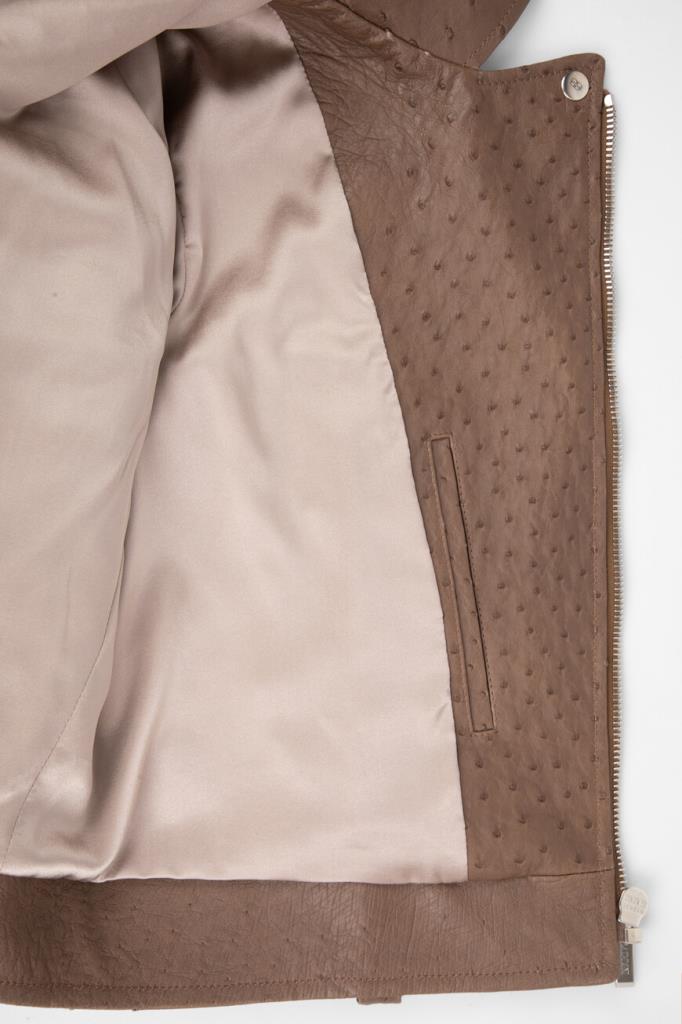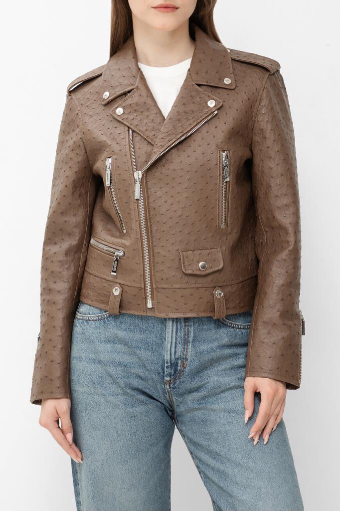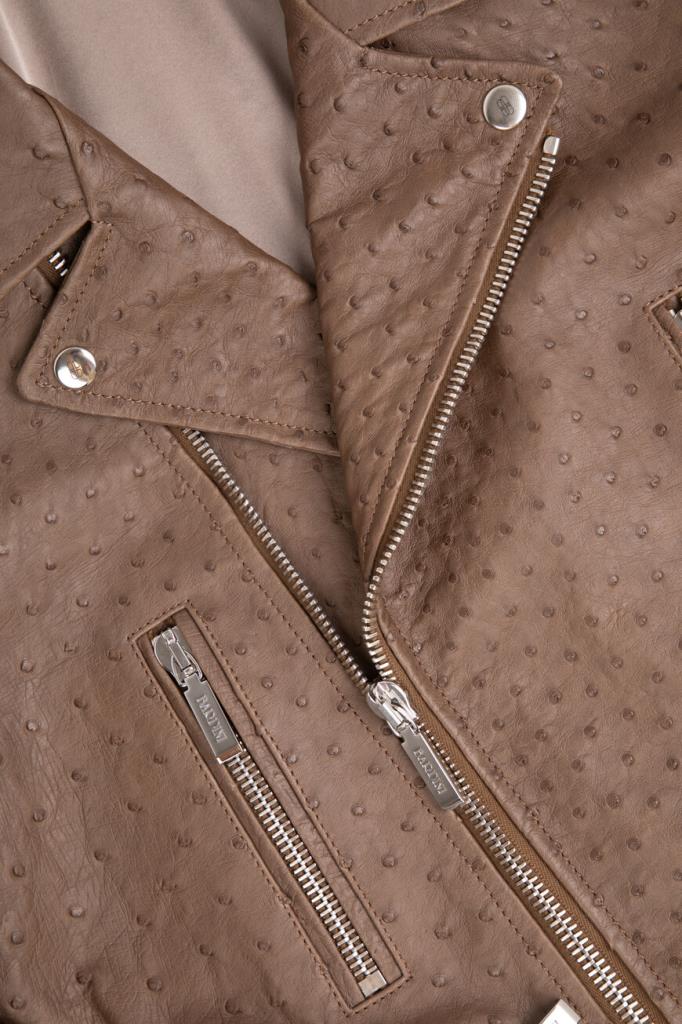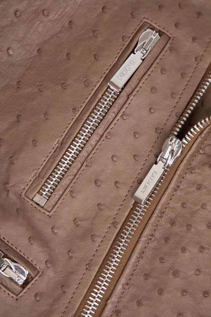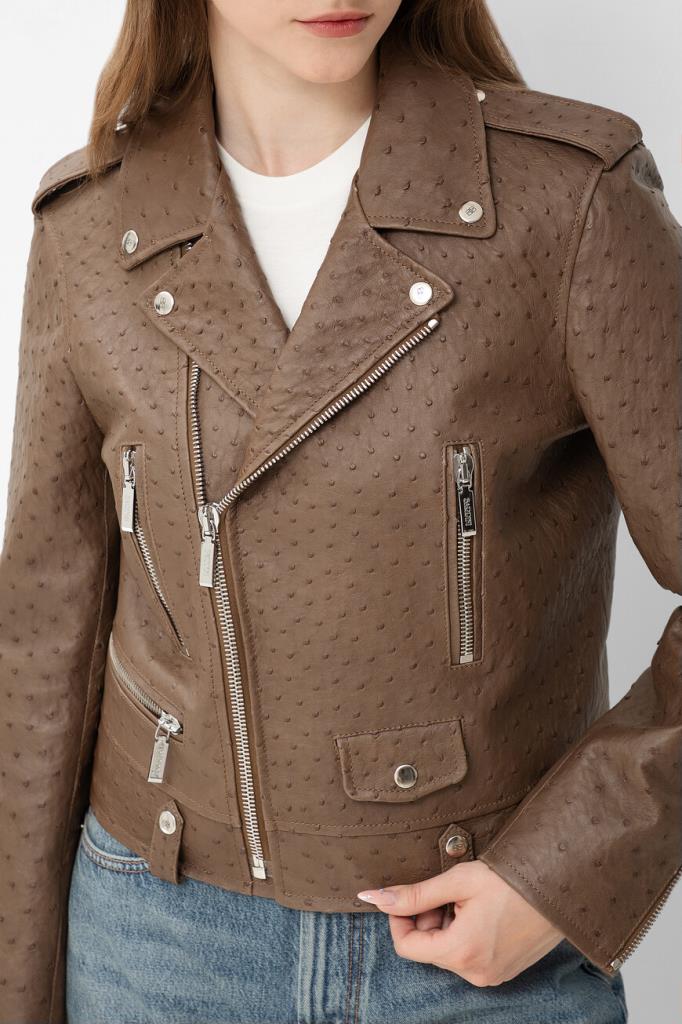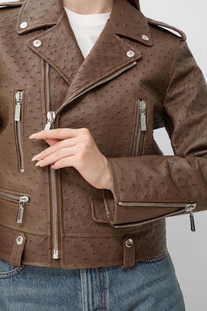 Куртка-косуха Bardini выполнена из мягкой фактурной кожи страуса. Изделие коричневого цвета застёгивается на серебристую молнию с брендированным металлическим бегунком и отличается четырьмя прорезными карманами. Отличительными особенностями модели прямого силуэта стали изящные разрезы на молнии снизу на рукавах и декоративные металлические детали-заклёпки сзади.