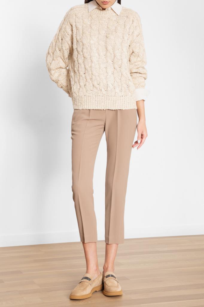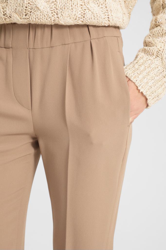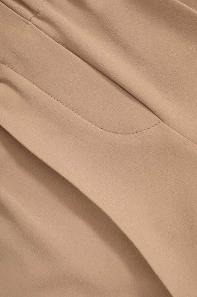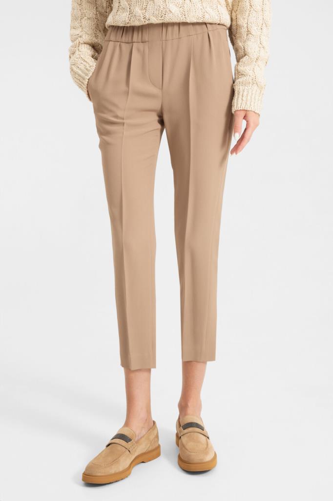 Лёгкие брюки Tailored Jogger от BRUNELLO CUCINELLI. Изделие выполнено из шелкового крепа-кади и ацетата светло-коричневого оттенка - классической тканью коллекций бренда, которая характеризуется слегка помятым видом. Укороченную модель можно носить с вязаным свитером и светло-коричневыми пенни-лоферами BRUNELLO CUCINELLI.