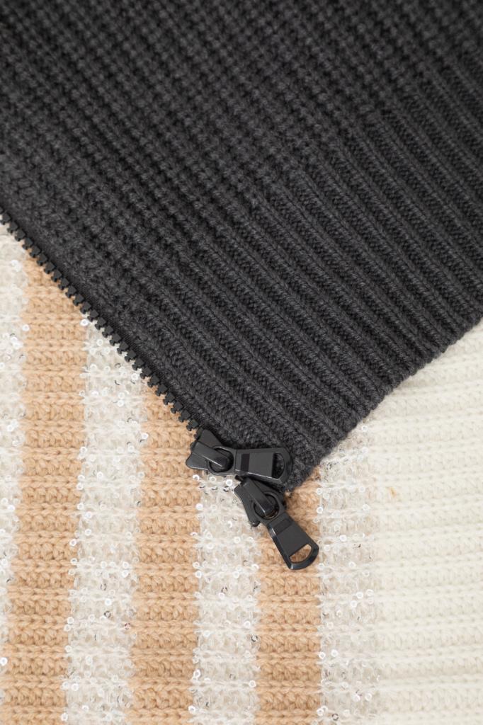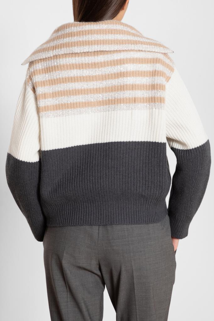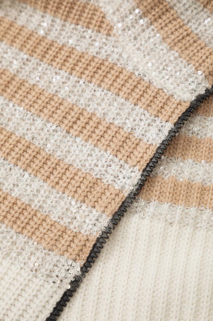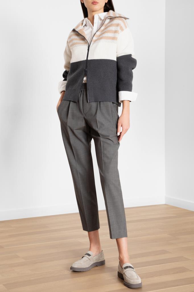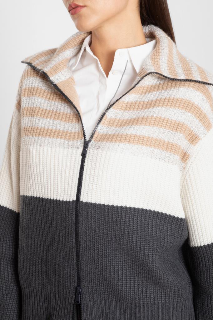 Полосатый кардиган Brunello Cucinelli изготовлен из двух видов пряжи. Верхняя часть модели выполнена из легкой блестящей ткани с добавлением мохера и шерсти, а нижняя — из трикотажа на основе шерсти Virgin, кашемира и шелка. Отличительной особенностью является ажурная вязка.