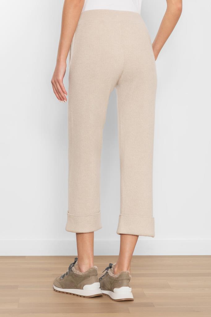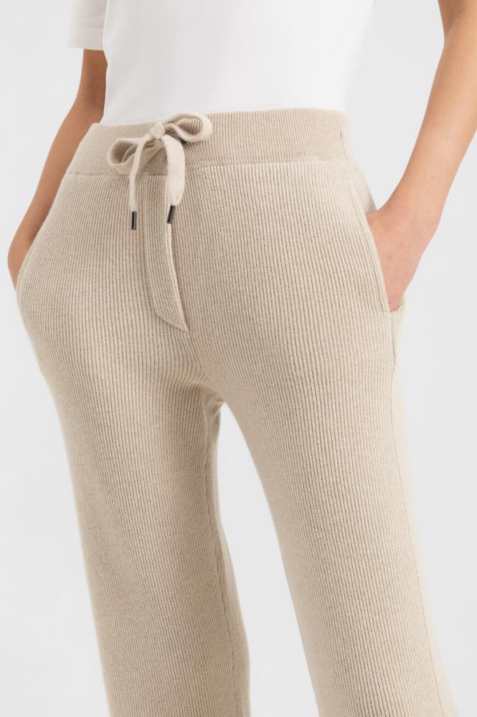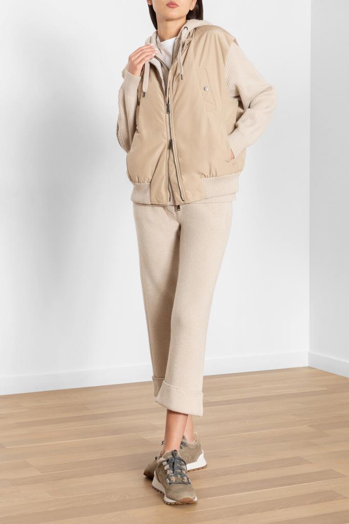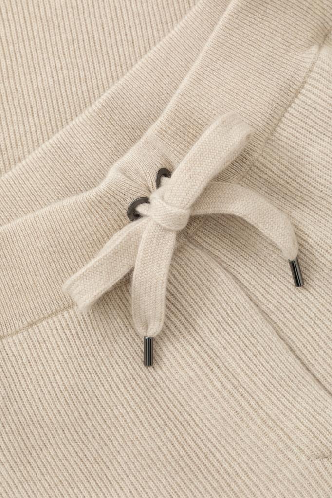 Брюки в спортивном стиле от BRUNELLO CUCINELLI. Фасон светло-бежевой модели из мягкого кашемира предполагает свободный силуэт и пояс-кулиску. Отличительной особенностью изделия стала вязка английской резинкой. Брюки можно носить в комплекте с кардиганом и жилетом из той же коллекции.