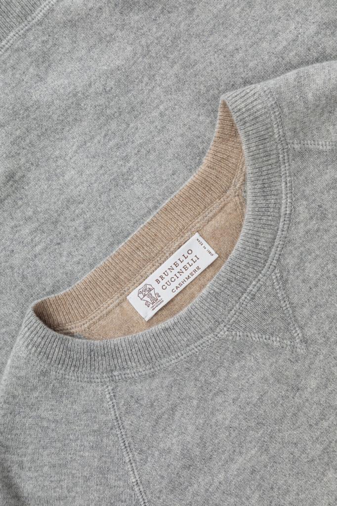 Кашемировый свитер с круглой горловиной от BRUNELLO CUCINELLI. Тонкая пряжа почти ничего не весит и при этом отлично согревает. Изделие комфортно садится по фигуре и не ограничивает свободу движений. Модель отличается характерным для свитшотов треугольником спереди и культовым декором коллекций бренда - бежевой окантовкой на уровне манжет.