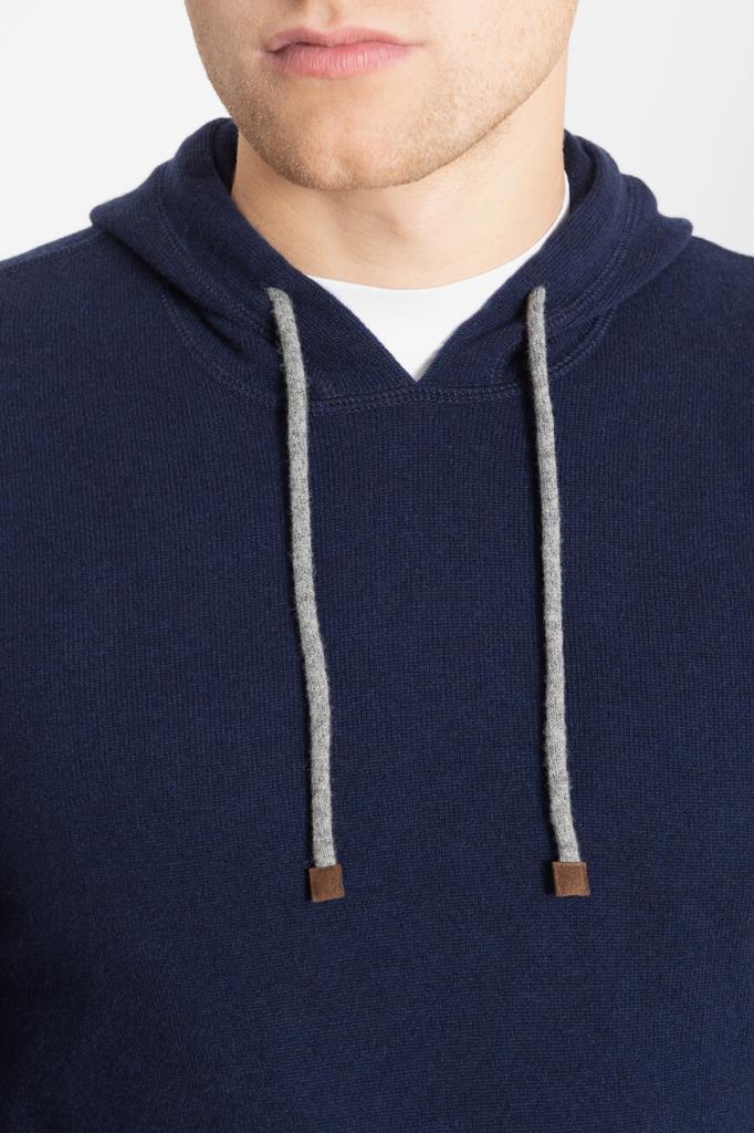 Тёмно-синее худи чулочной вязки от BRUNELLO CUCINELLI.  В тонком материале сплелись воедино отборная шерсть молочных ягнят, дышащий шёлк и облегченный кашемир. Такой микс окутывает тело тёплым облаком и создаёт идеальный микроклимат как на прогулке в прохладный день, так и у камина в загородном доме. Модель будет гармонично смотреться в тандеме с синими джинсами с эффектом делаве и комбинированными сникерами того же бренда.