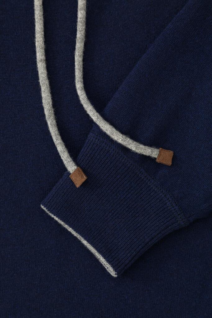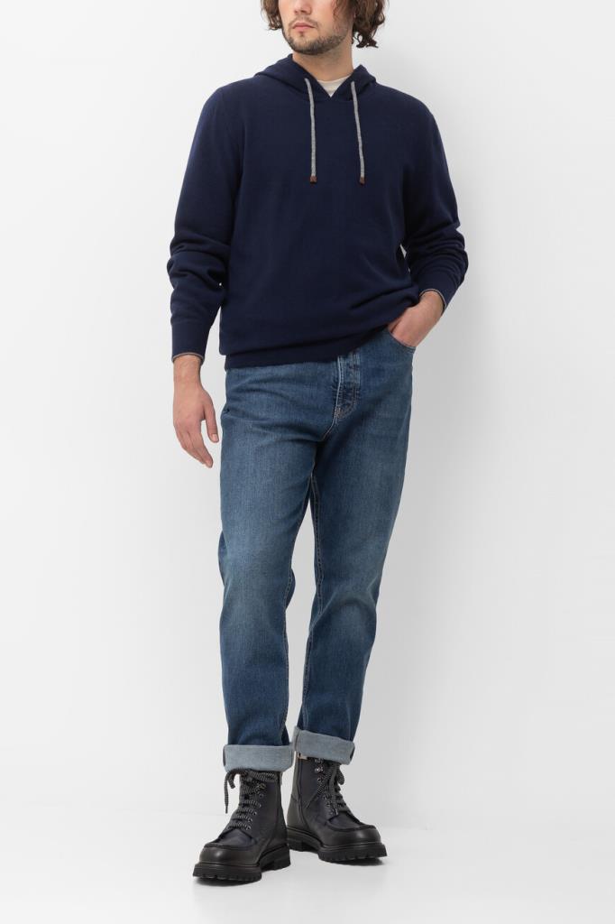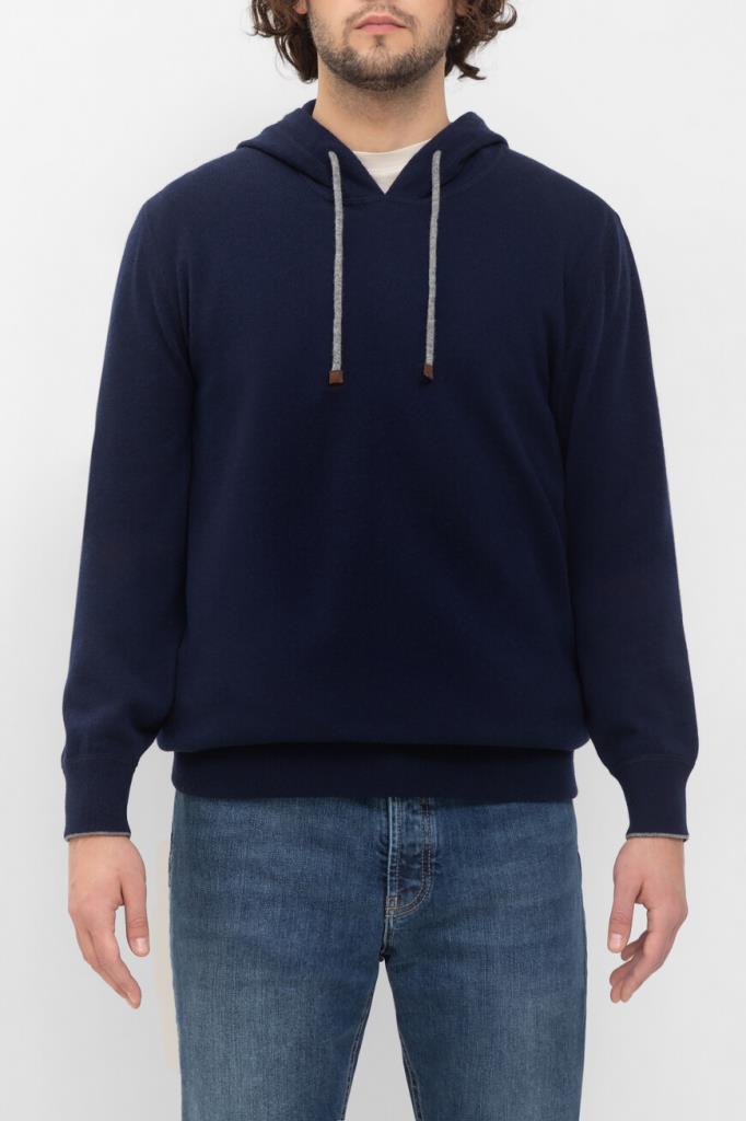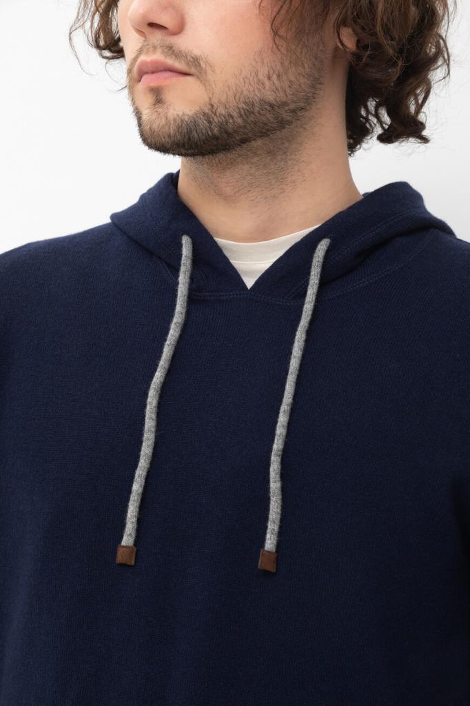 Тёмно-синее худи чулочной вязки от BRUNELLO CUCINELLI.  В тонком материале сплелись воедино отборная шерсть молочных ягнят, дышащий шёлк и облегченный кашемир. Такой микс окутывает тело тёплым облаком и создаёт идеальный микроклимат как на прогулке в прохладный день, так и у камина в загородном доме. Модель будет гармонично смотреться в тандеме с синими джинсами с эффектом делаве и комбинированными сникерами того же бренда.