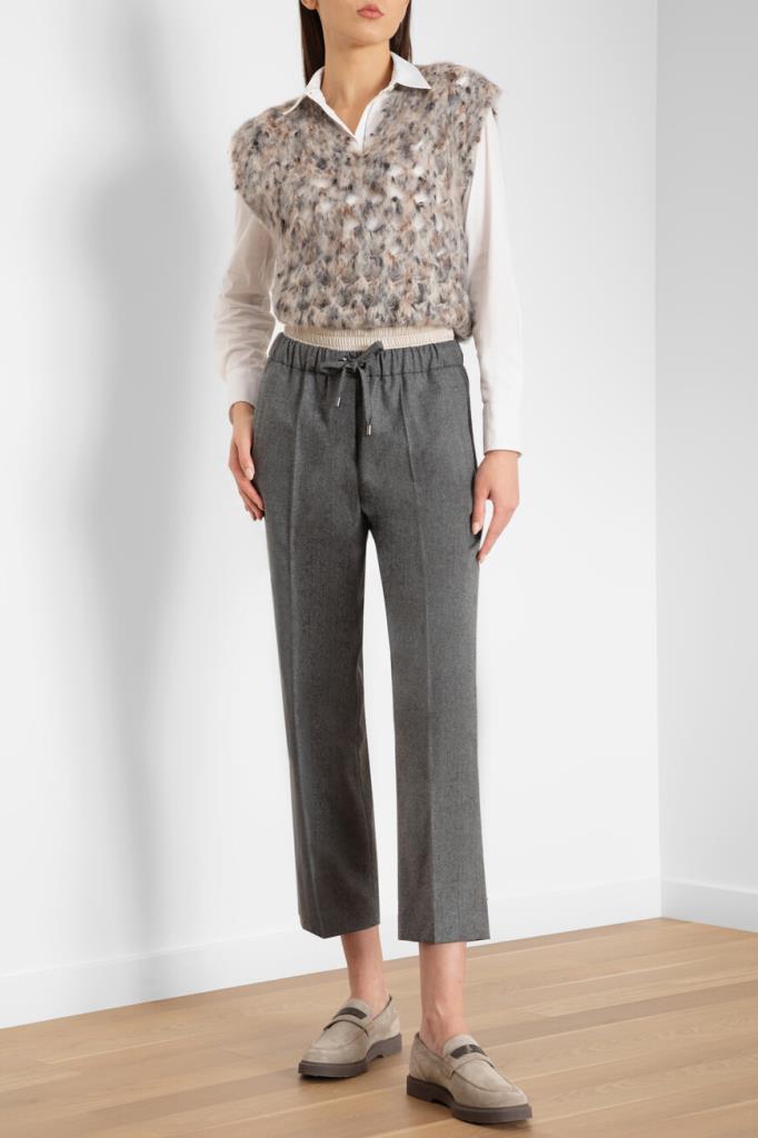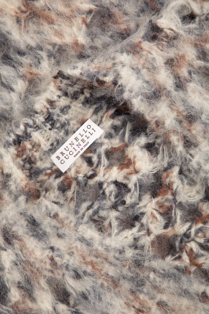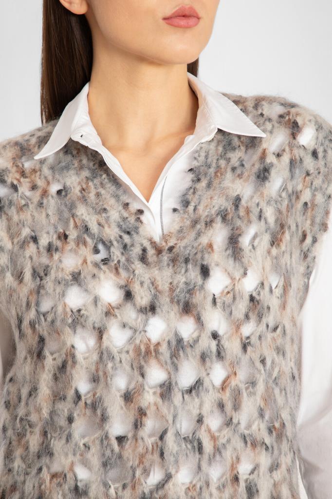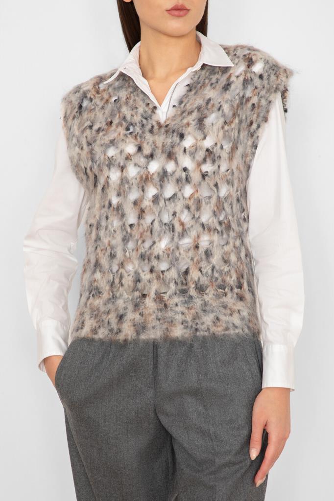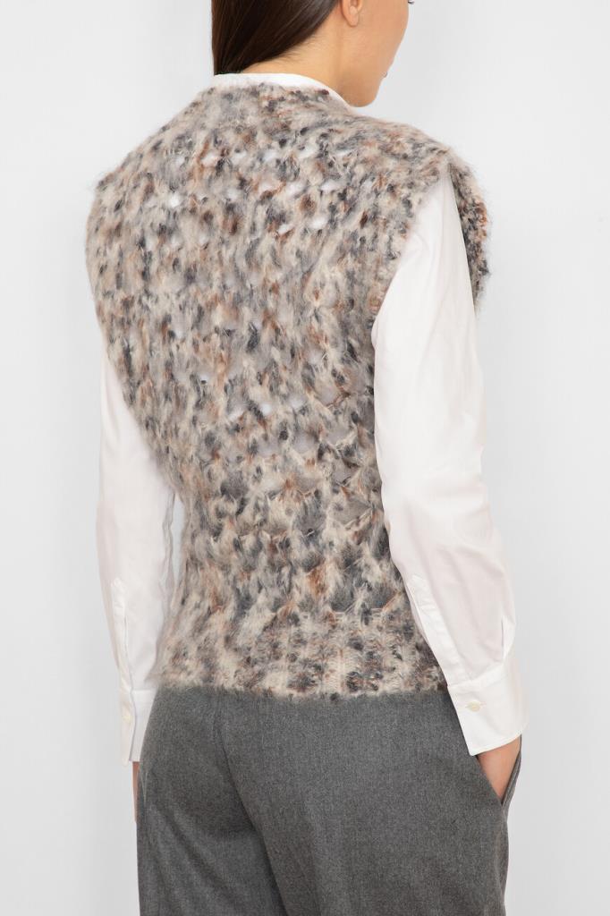 Жилет Brunello Cucinelli с ажурным сетчатым узором ромбами. Модель изготовлена из мягкой фактурной пряжи на основе нежного мохера и тёплой шерсти, укрепленной волокнами прочного нейлона и хлопка. Изделие смотрится органично в комплекте с белой рубашкой и брюками того же бренда.