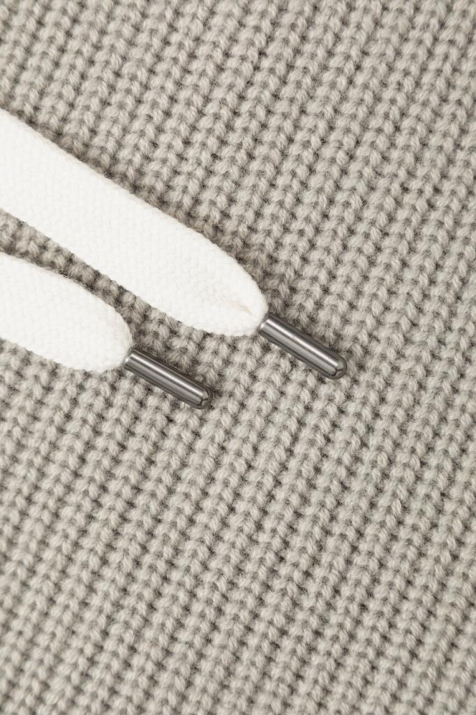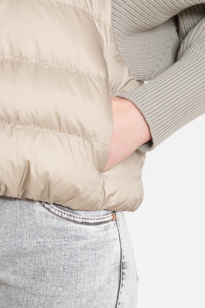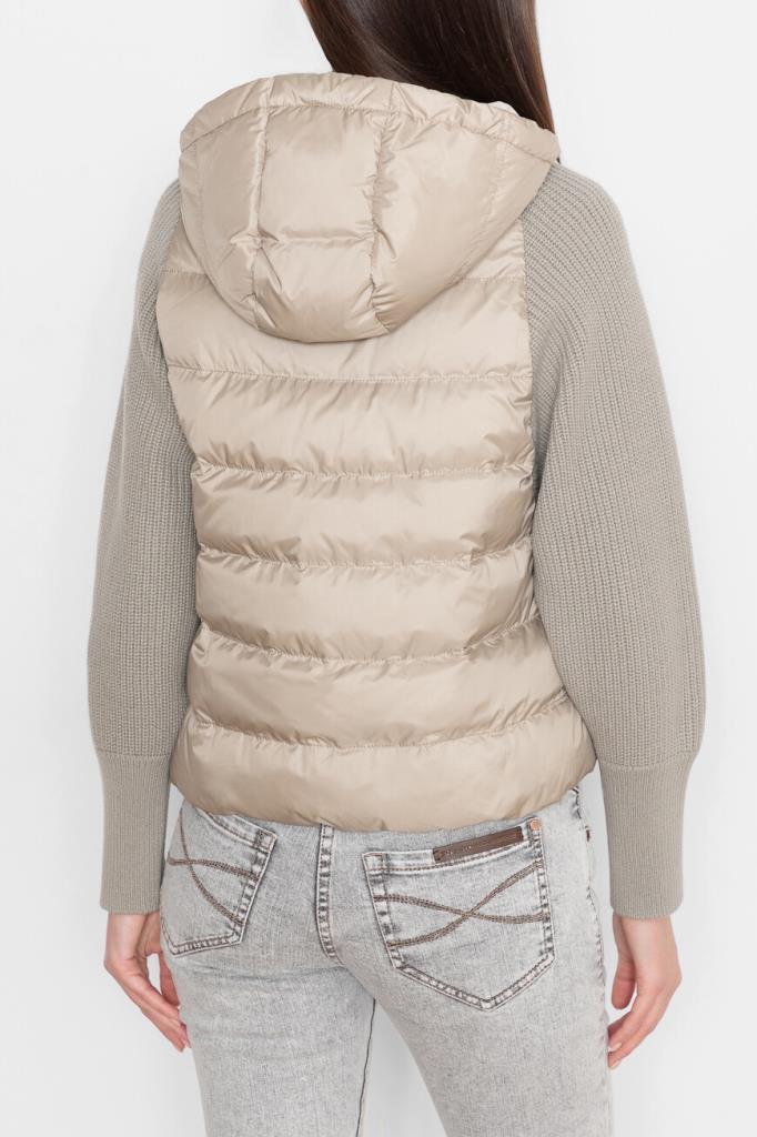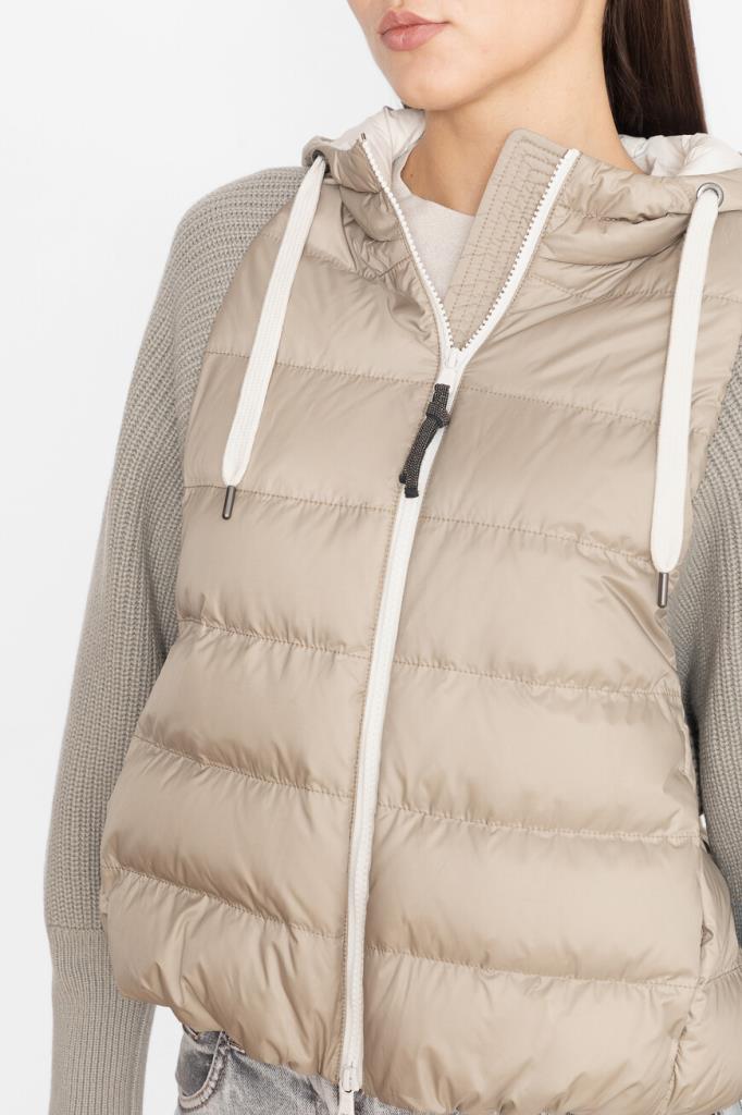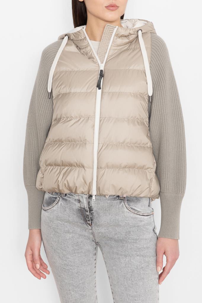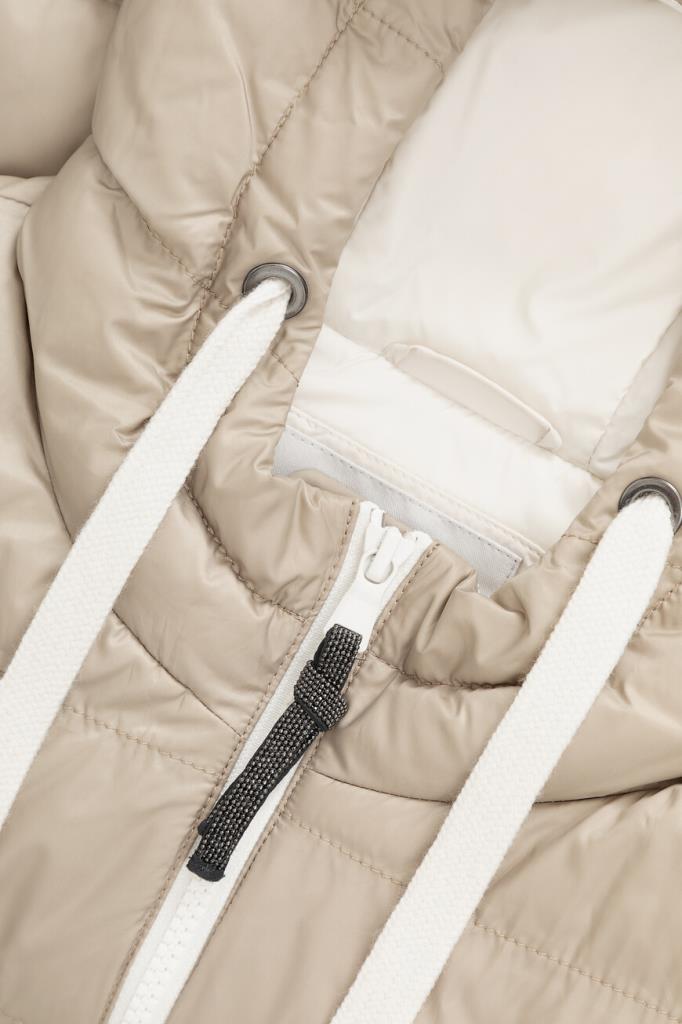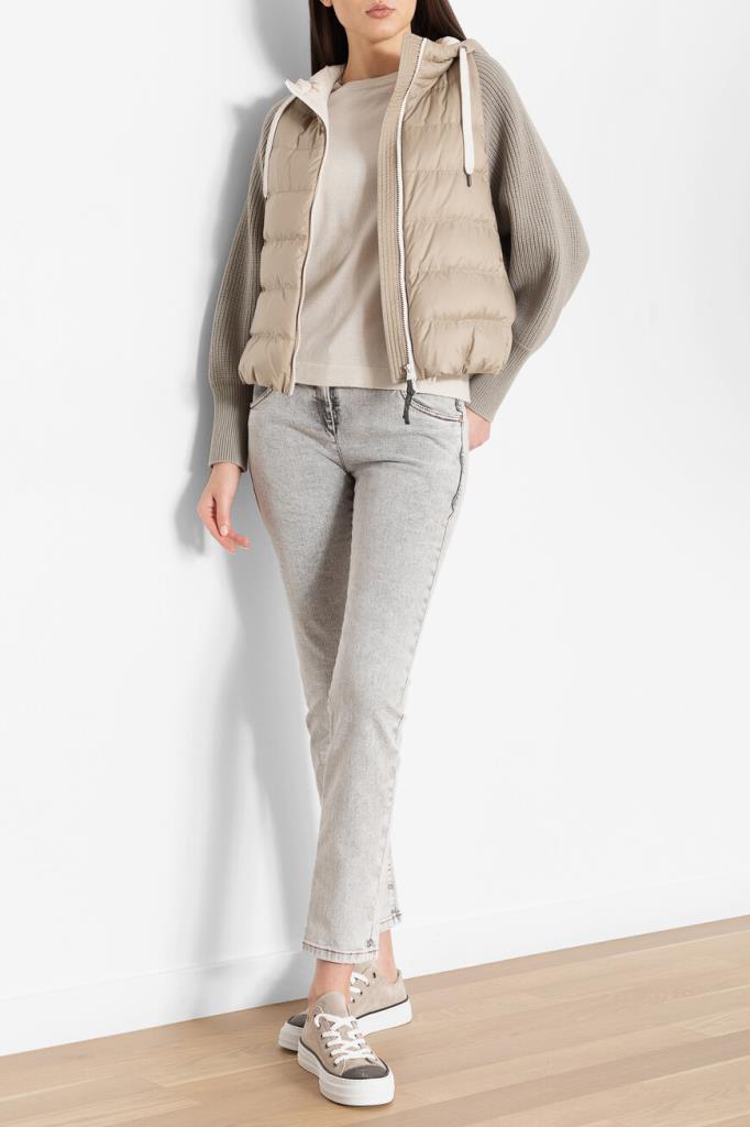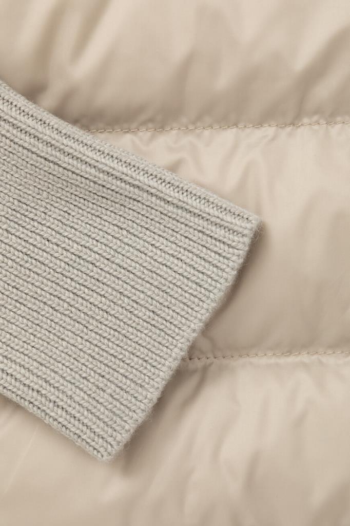 Короткая куртка на молнии с двумя бегунками от BRUNELLO CUCINELLI. Модель изготовлена из водоотталкивающего матового нейлона со вставками из мягкой пряжи на основе шерсти, кашемира и гладкого шёлка на рукавах. Контраст текстур подчеркивают геометрическая стёжка полосами на основе и вязка рыбацкой резинкой на рукавах. Отличительной деталью стала вышивка из блестящей цепочки Мониль на пуллере белой молнии. Наполнитель из натурального пуха и пера высокого качества обеспечивает надёжную защиту от холода.