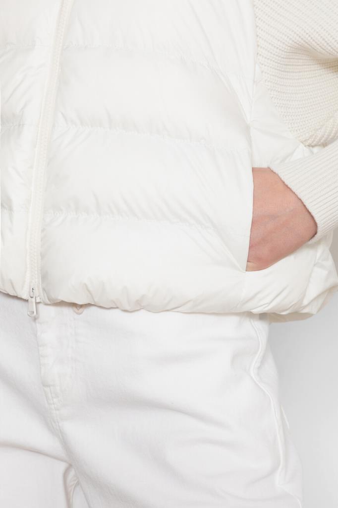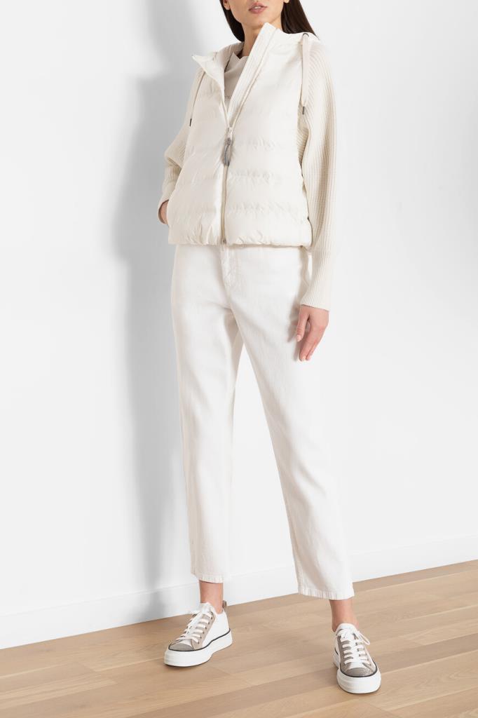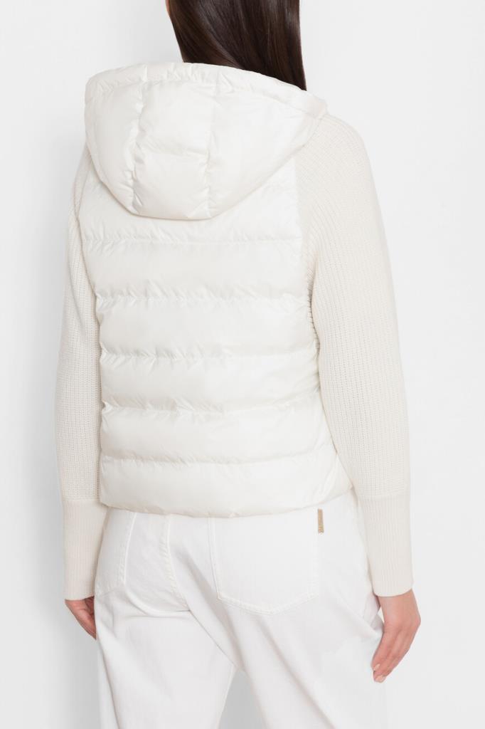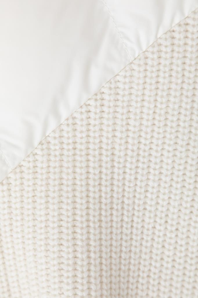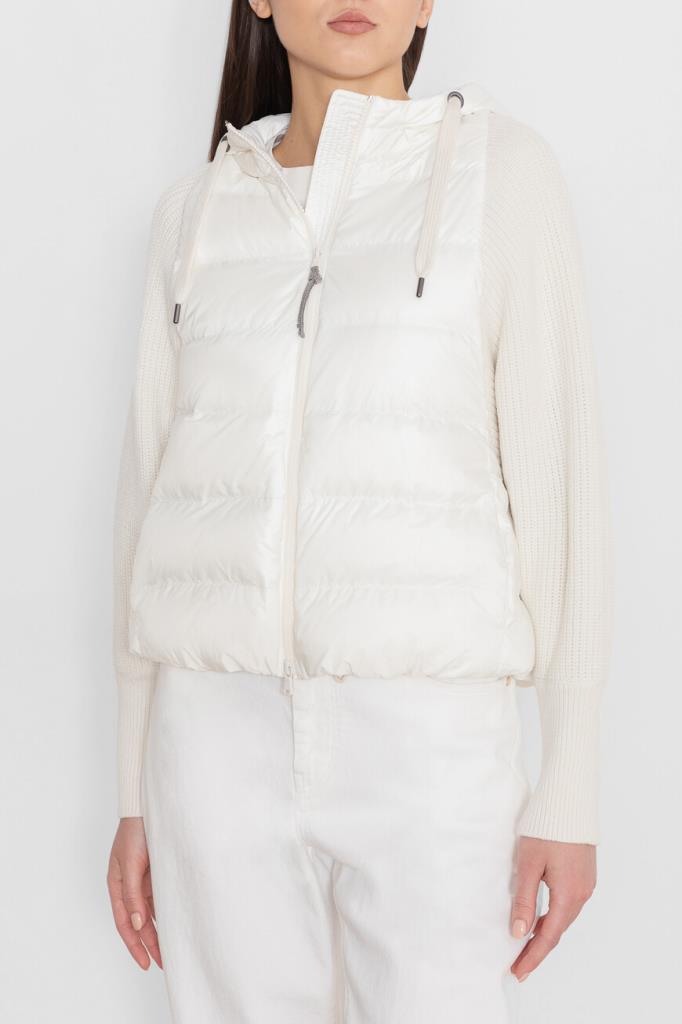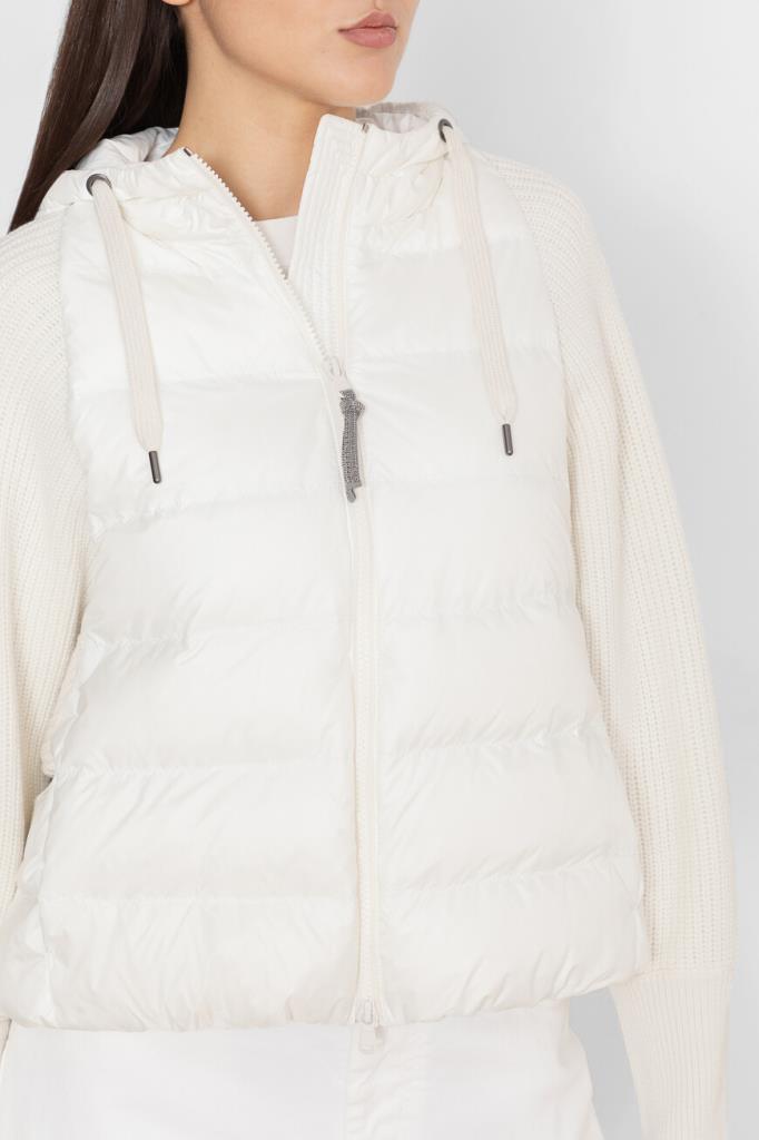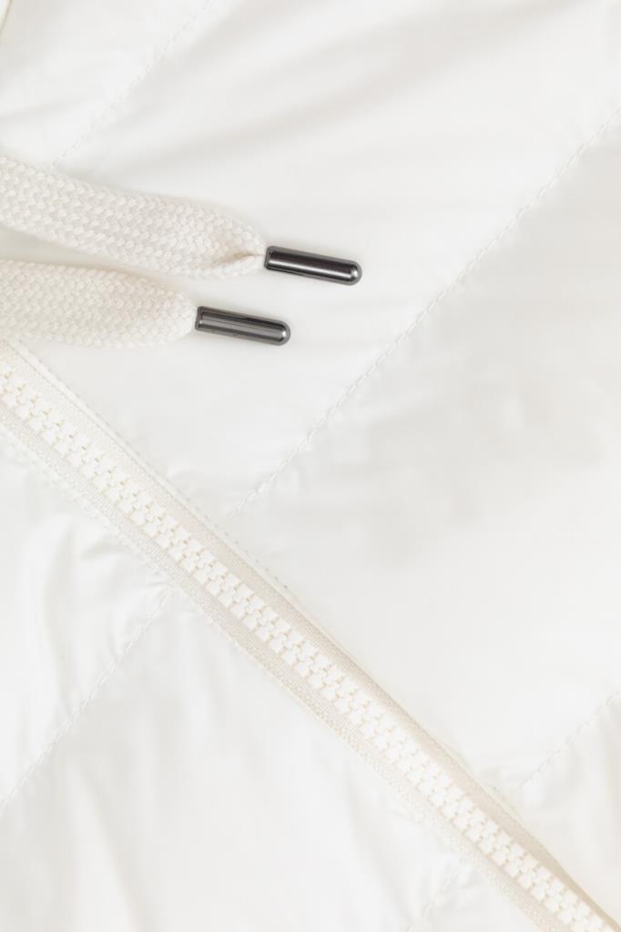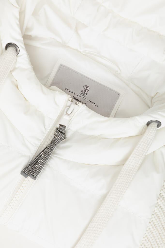 Куртка с практичным капюшоном на кулиске от BRUNELLO CUCINELLI. Изделие выполнено из прочного матового нейлона белого цвета - очень лёгкого и тонкого материала, гладкого на ощупь. Отделка помогает защитить ткань от контакта с водой. Стёганая часть пуховика сочетается с рукавами из мягкой пряжи на основе шерсти, кашемира и гладкого шёлка, создающей контраст текстур. Рукава украшает вязка рыбацкой резинкой, а вышивка из цепочки Мониль придаёт сияние пуллеру молнии, добавляя модели нежный блеск.
