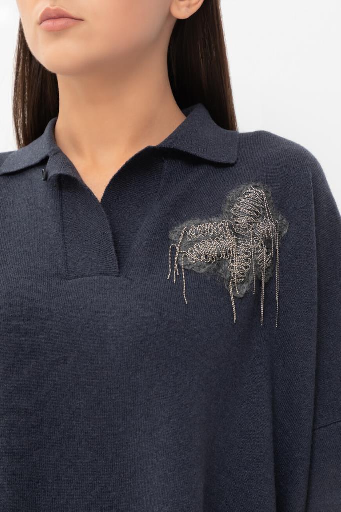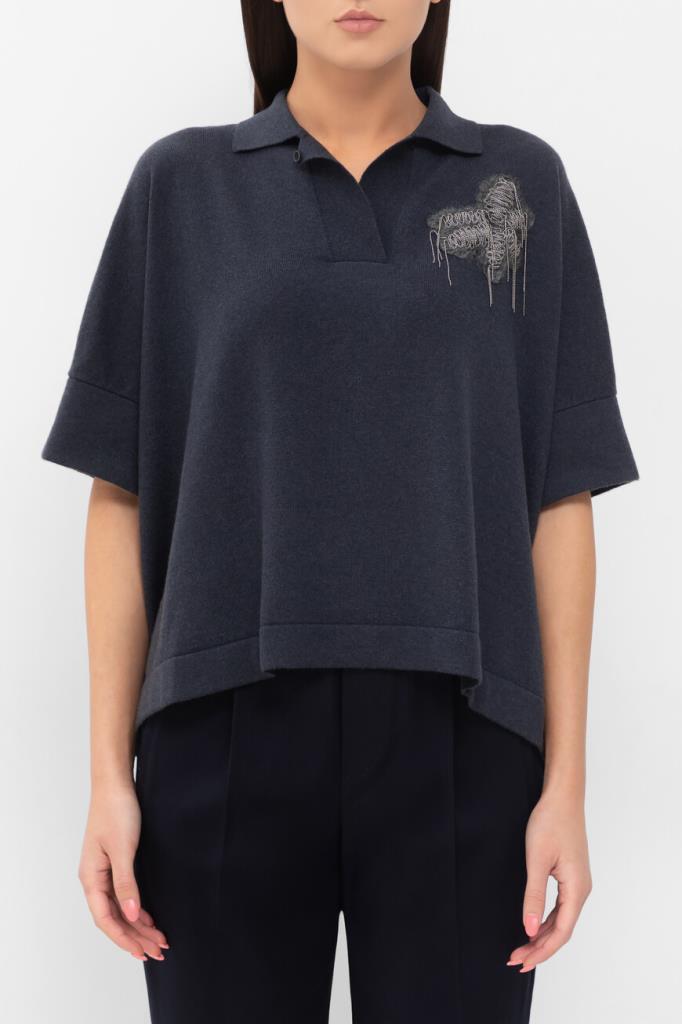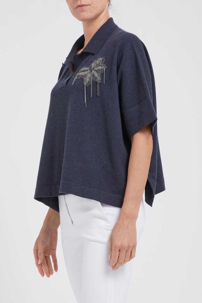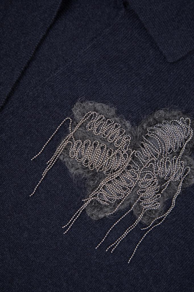 Поло свободного силуэта от BRUNELLO CUCINELLI. Изделие, выполненное из мягкого кашемира тёмно-синего цвета, интересно изящными неглубокими разрезами снизу по бокам. Повседневная модель с V-образным вырезом застёгивается на потайную пуговицу сверху и отличается ворсистой цветочной аппликацией, покрытой рядами блестящей серебристой цепочки Мониль и расположенной слева на груди. Создайте органичный комплект, сочетая поло с брюками в спортивном стиле из той же коллекции.