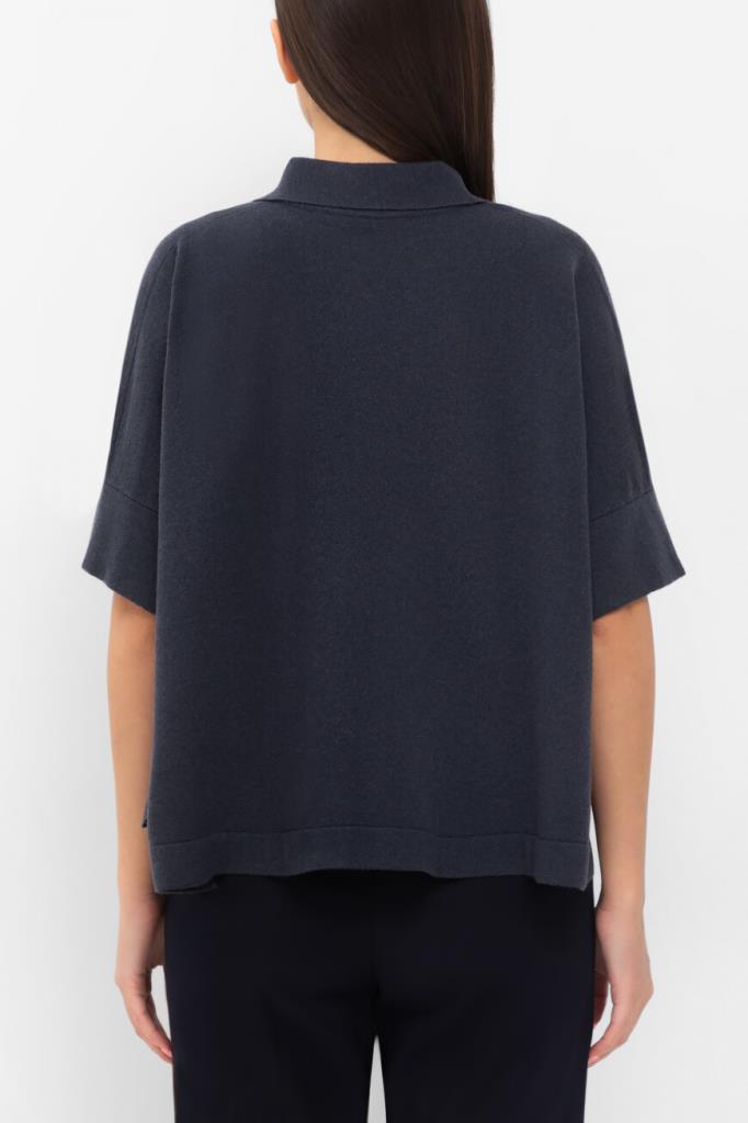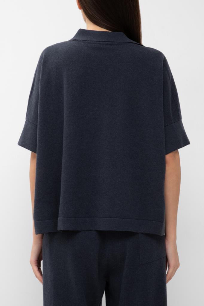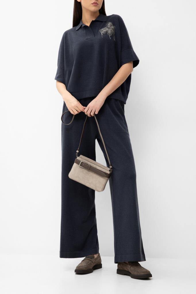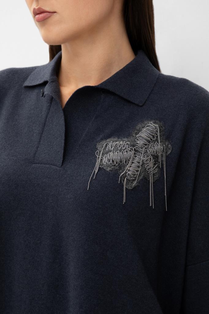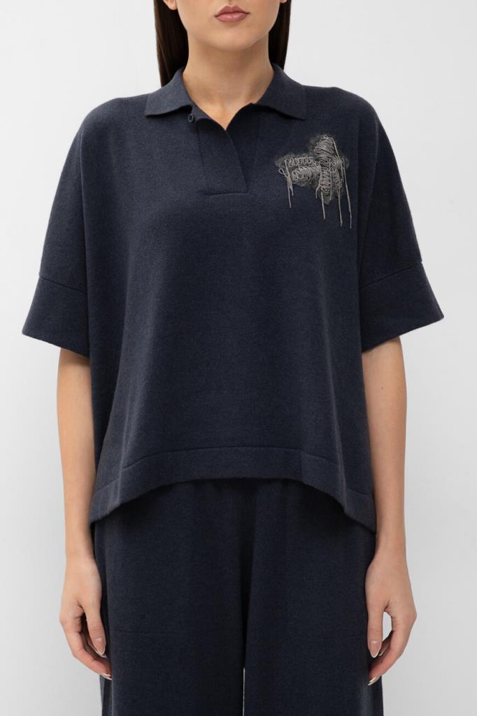 Поло свободного силуэта от BRUNELLO CUCINELLI. Изделие, выполненное из мягкого кашемира тёмно-синего цвета, интересно изящными неглубокими разрезами снизу по бокам. Повседневная модель с V-образным вырезом застёгивается на потайную пуговицу сверху и отличается ворсистой цветочной аппликацией, покрытой рядами блестящей серебристой цепочки Мониль и расположенной слева на груди. Создайте органичный комплект, сочетая поло с брюками в спортивном стиле из той же коллекции.