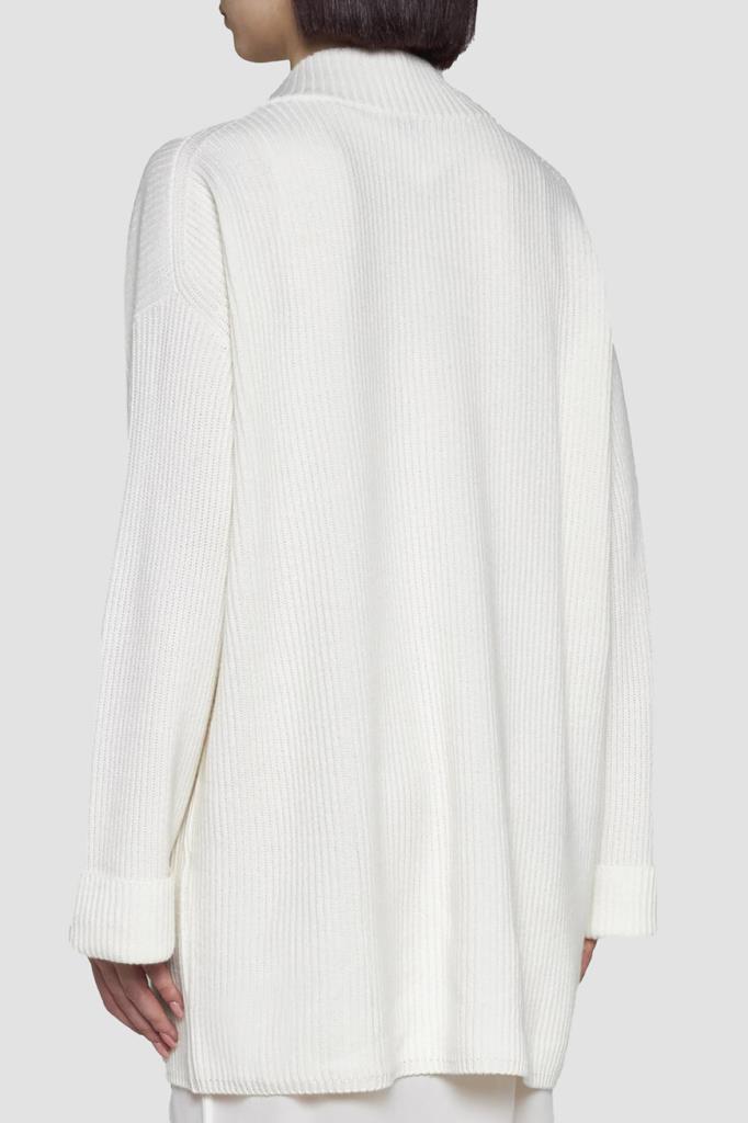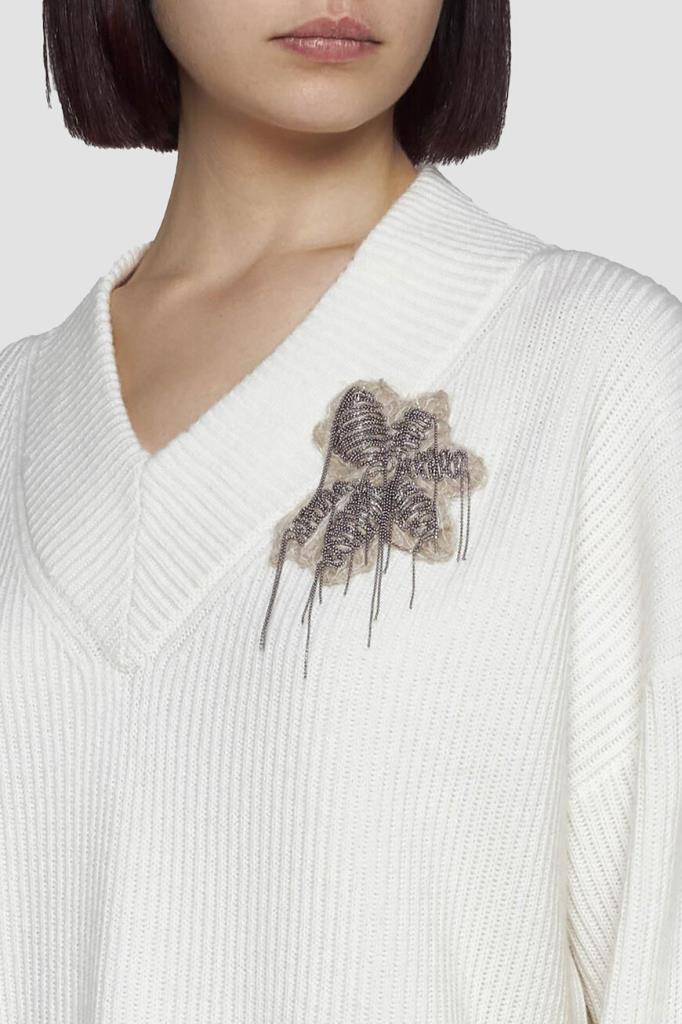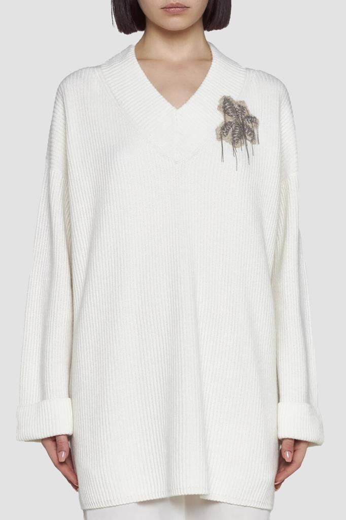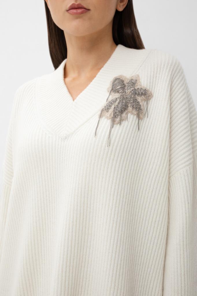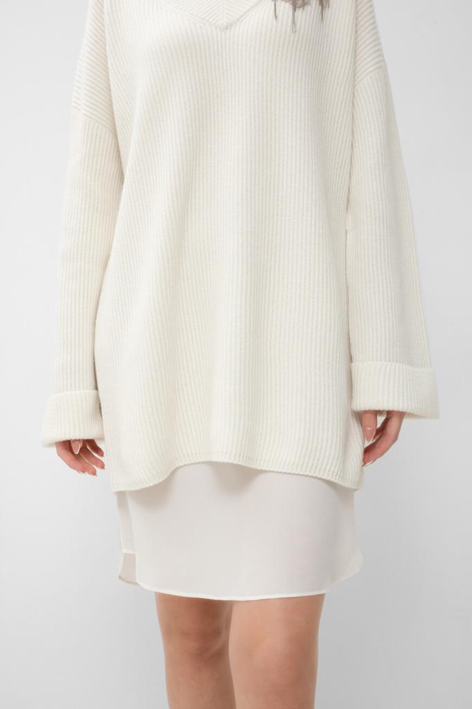 Вязаное платье белого цвета от BRUNELLO CUCINELLI. Для изготовления модели расслабленного силуэта выбран мягкий кашемир. Изделие характеризуется изящным V-образным вырезом горловины и длинными рукавами с подворотами снизу на уровне манжет. Модель также дополнена удлинённой внутренней подкладкой-комбинацией, выполненной из гладкого струящегося шёлка в тон. Декором выступает ворсистая цветочная аппликация, покрытая рядами блестящей серебристой цепочки Мониль и расположенная слева на груди.
