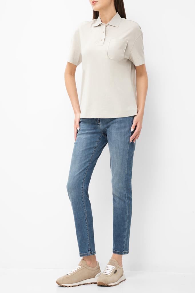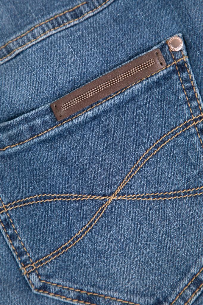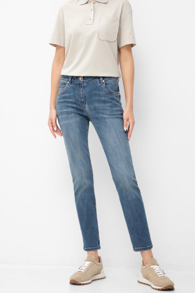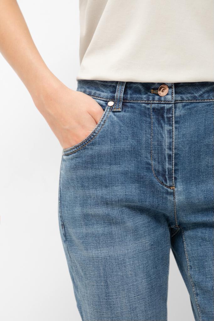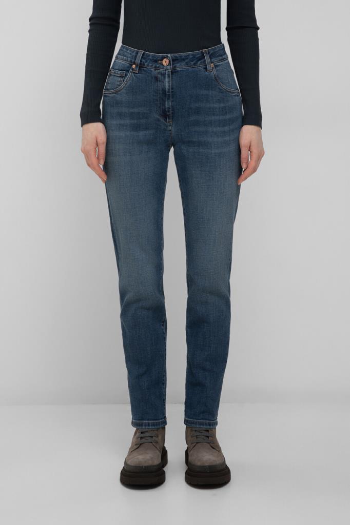 Облегающие джинсы синего цвета от BRUNELLO CUCINELLI. Изделие выполнено из эластичного хлопкового денима с эффектом делаве и оснащено застёжкой на потайную молнию и брендированную металлическую пуговицу золотого оттенка. Отличительными деталями стали небольшая кожаная нашивка с полосой из блестящей золотистой цепочки Мониль на правом заднем кармане и дизайнерская отстрочка-вышивка также на задних карманах.