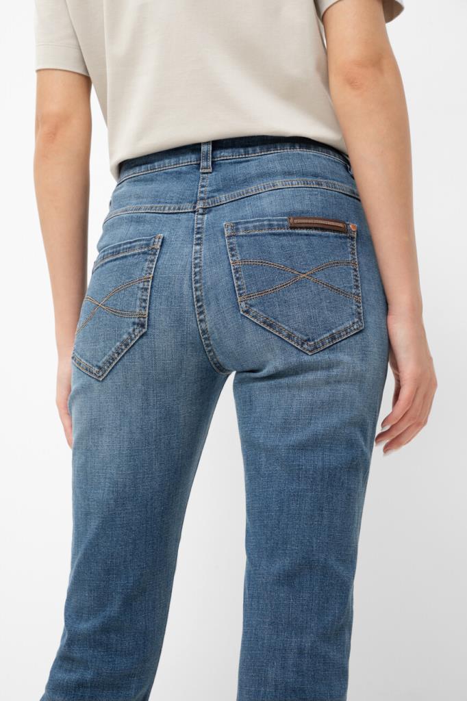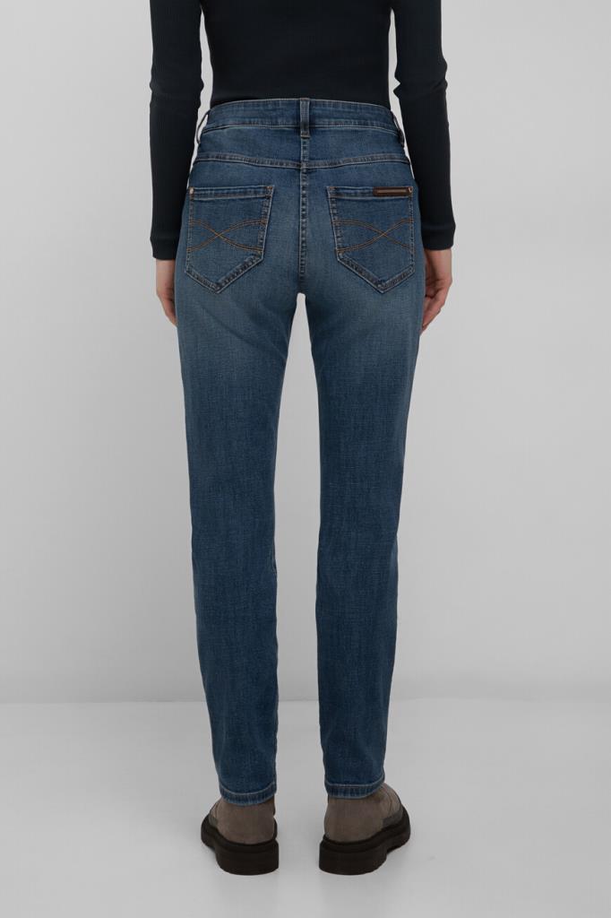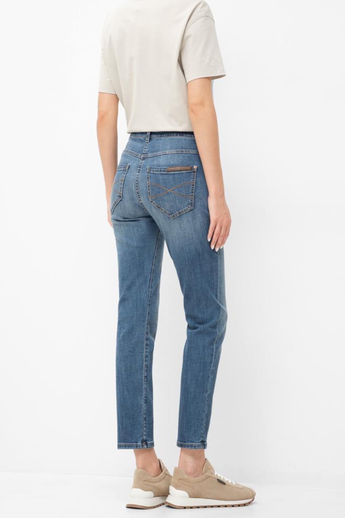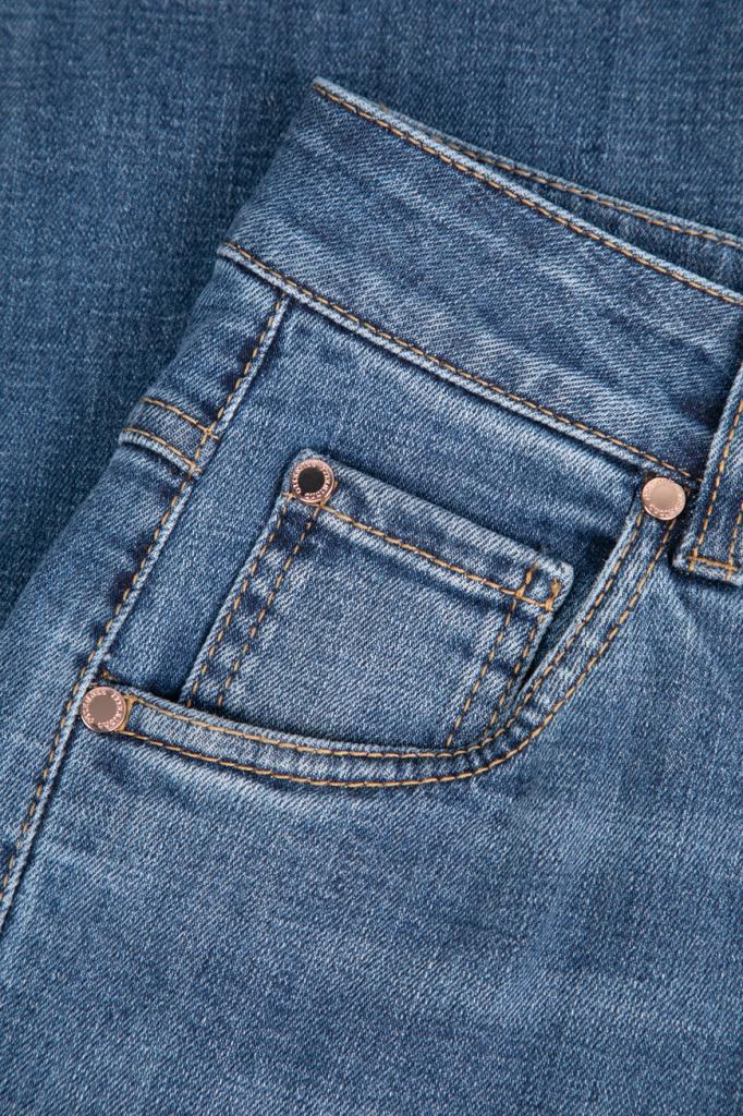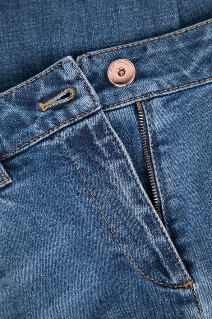 Облегающие джинсы синего цвета от BRUNELLO CUCINELLI. Изделие выполнено из эластичного хлопкового денима с эффектом делаве и оснащено застёжкой на потайную молнию и брендированную металлическую пуговицу золотого оттенка. Отличительными деталями стали небольшая кожаная нашивка с полосой из блестящей золотистой цепочки Мониль на правом заднем кармане и дизайнерская отстрочка-вышивка также на задних карманах.