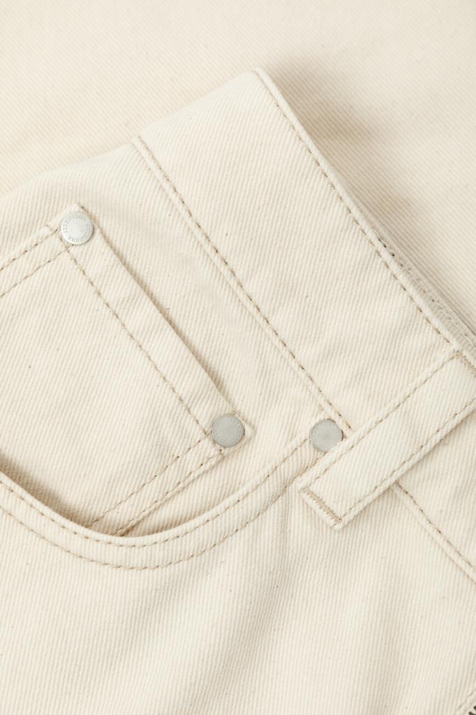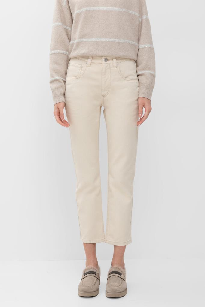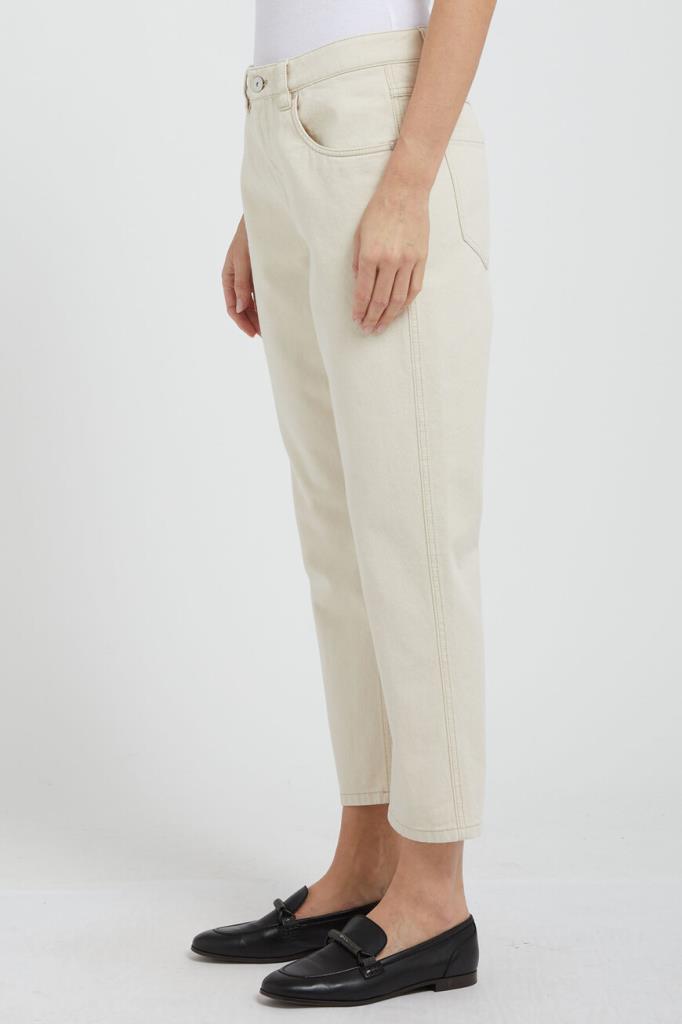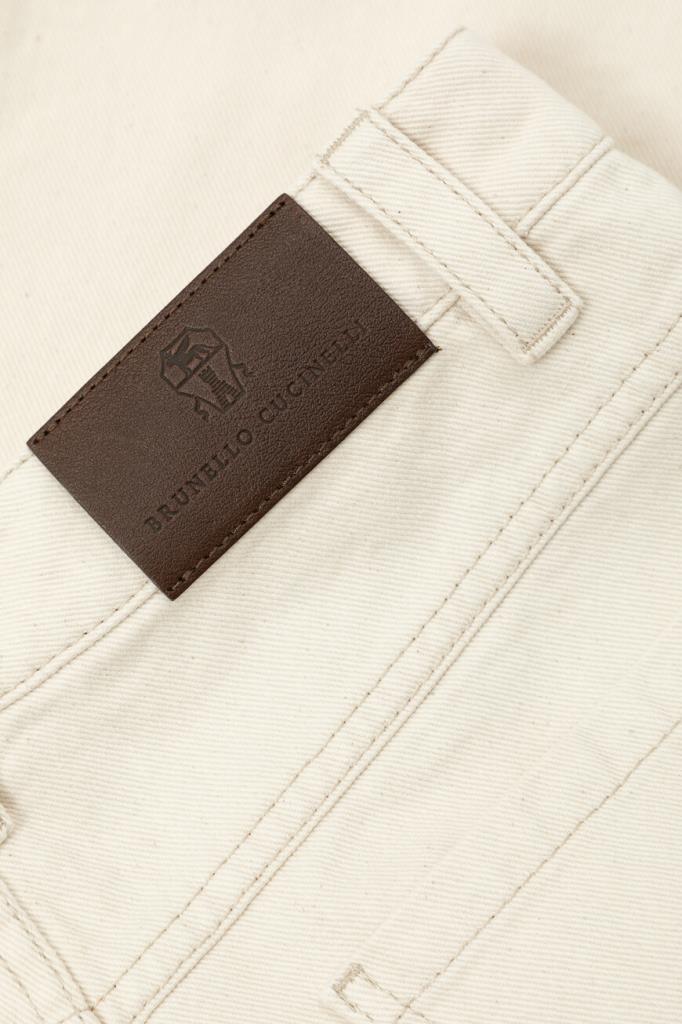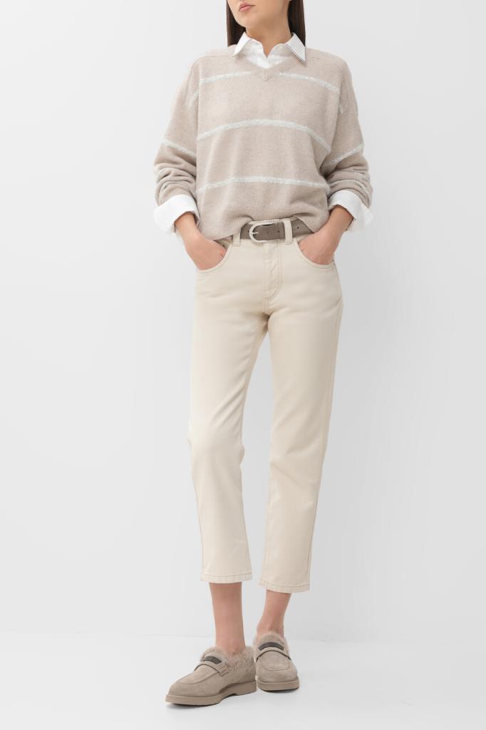 Укороченные брюки BRUNELLO CUCINELLI выполнены в оттенке экрю. Для пошива модели прямого силуэта выбран мягкий хлопковый трикотаж. Изделие застёгивается на потайную молнию и серебристую металлическую пуговицу с планкой и отличается пятью карманами. О принадлежности брюк Дому напоминают тёмно-коричневая кожаная нашивка с тиснёными лого и монограммой, а также узкая полоса из рядов знаковой цепочки Мониль на заднем кармане. Джинсы с прострочкой на швах станут идеальным дополнением образа с джемпером из той же коллекции.
