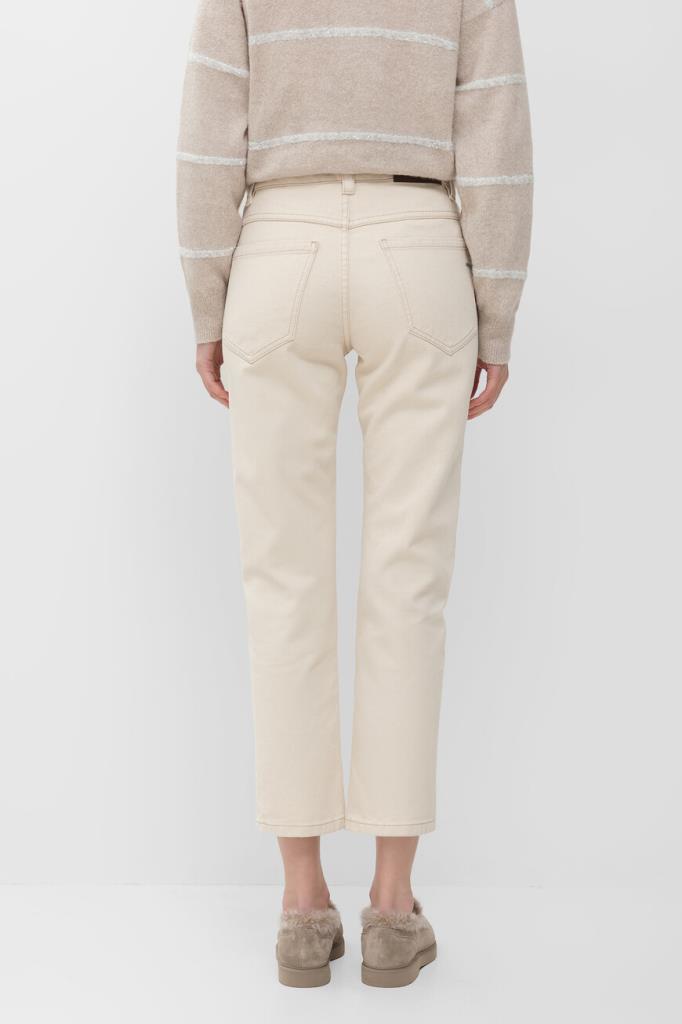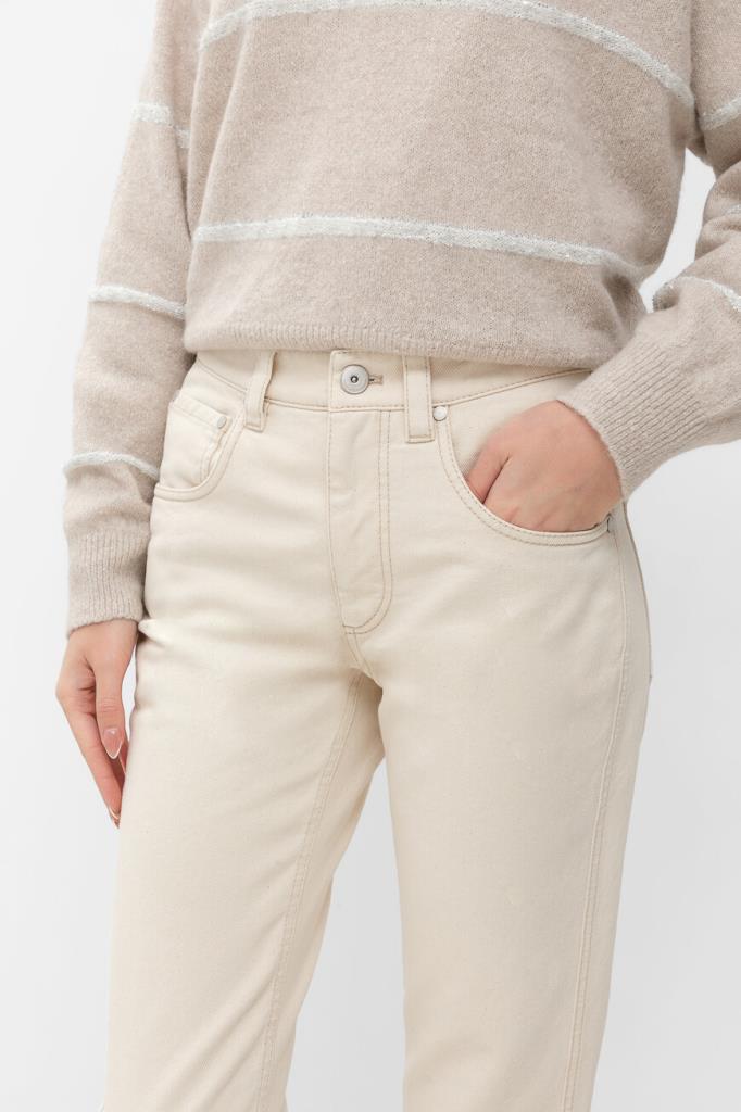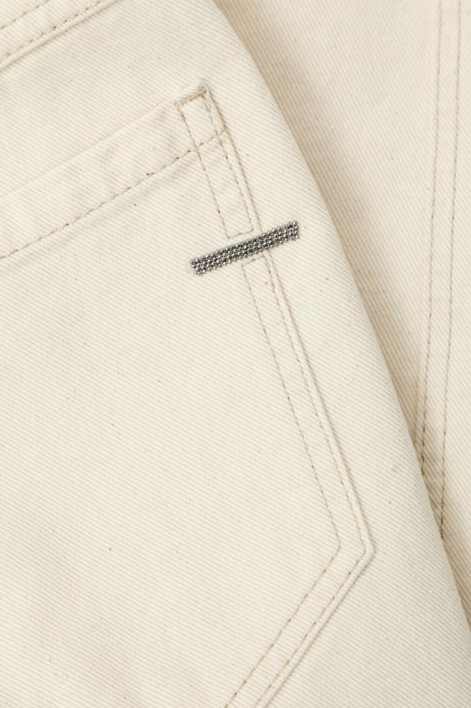 Укороченные брюки BRUNELLO CUCINELLI выполнены в оттенке экрю. Для пошива модели прямого силуэта выбран мягкий хлопковый трикотаж. Изделие застёгивается на потайную молнию и серебристую металлическую пуговицу с планкой и отличается пятью карманами. О принадлежности брюк Дому напоминают тёмно-коричневая кожаная нашивка с тиснёными лого и монограммой, а также узкая полоса из рядов знаковой цепочки Мониль на заднем кармане. Джинсы с прострочкой на швах станут идеальным дополнением образа с джемпером из той же коллекции.