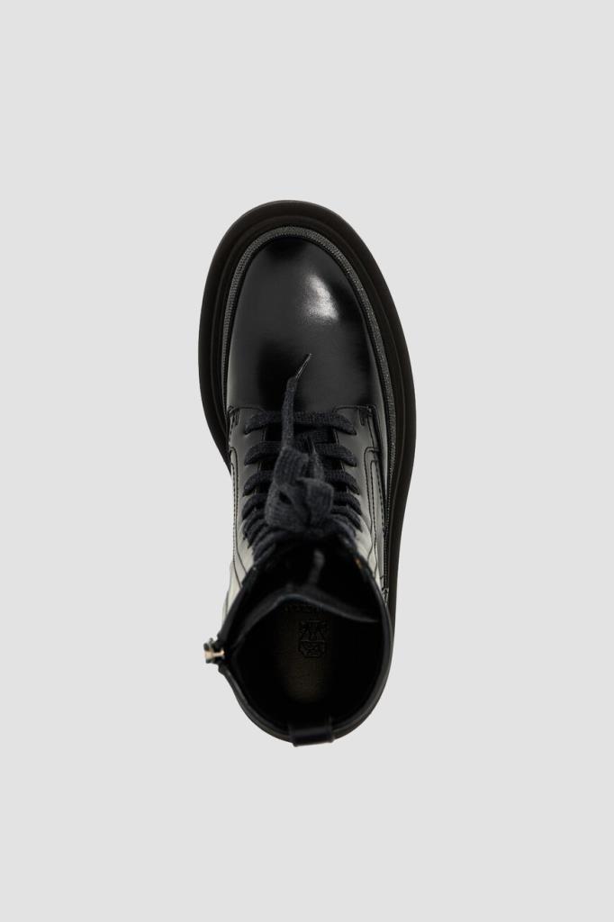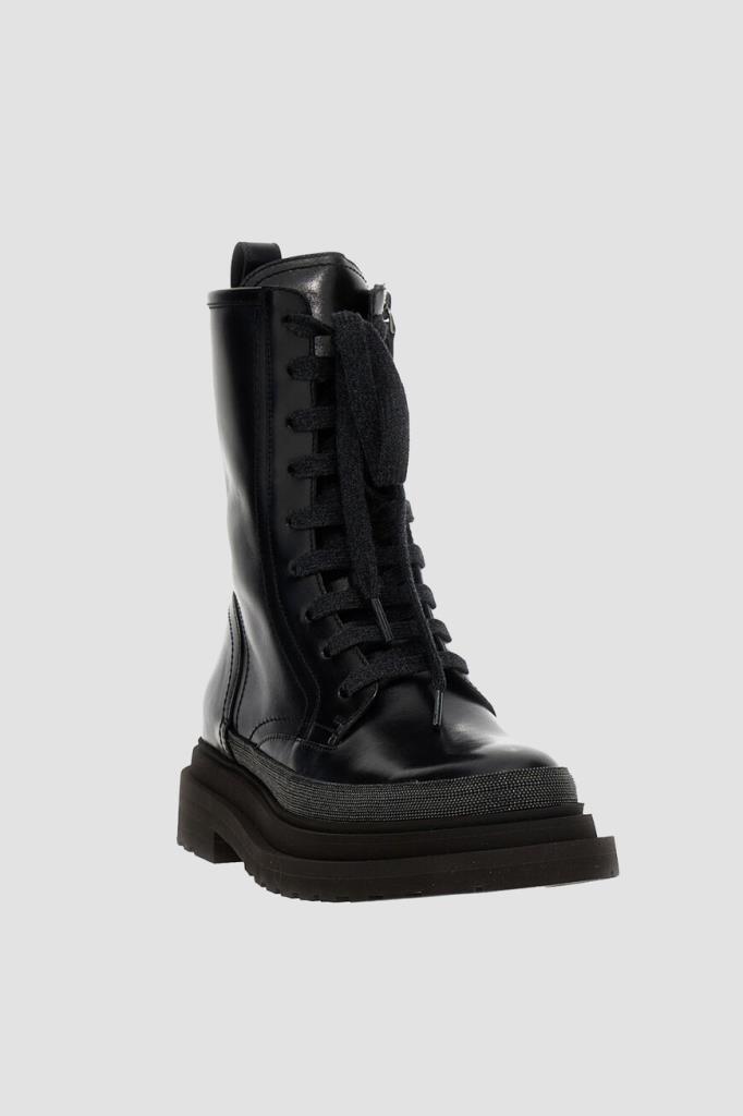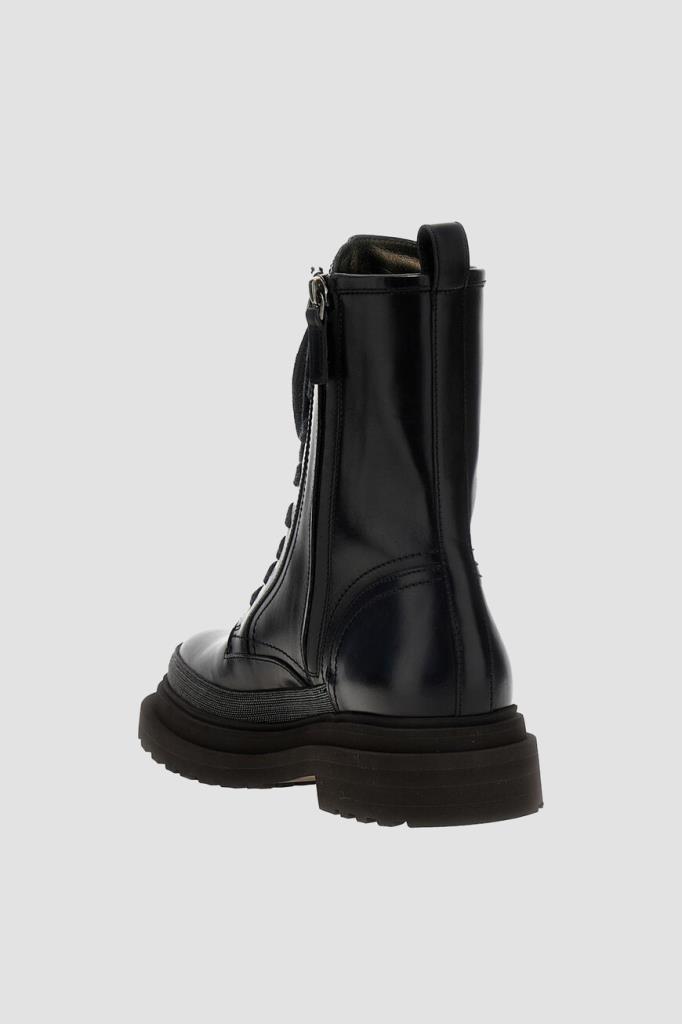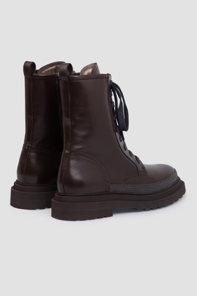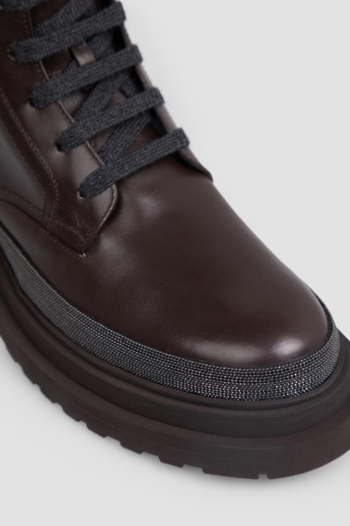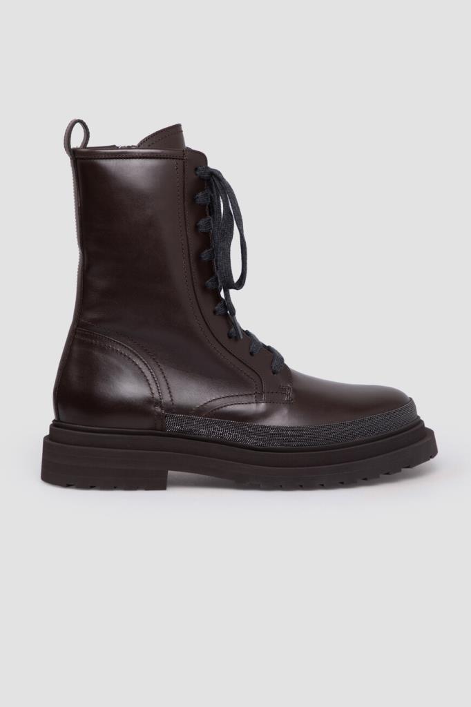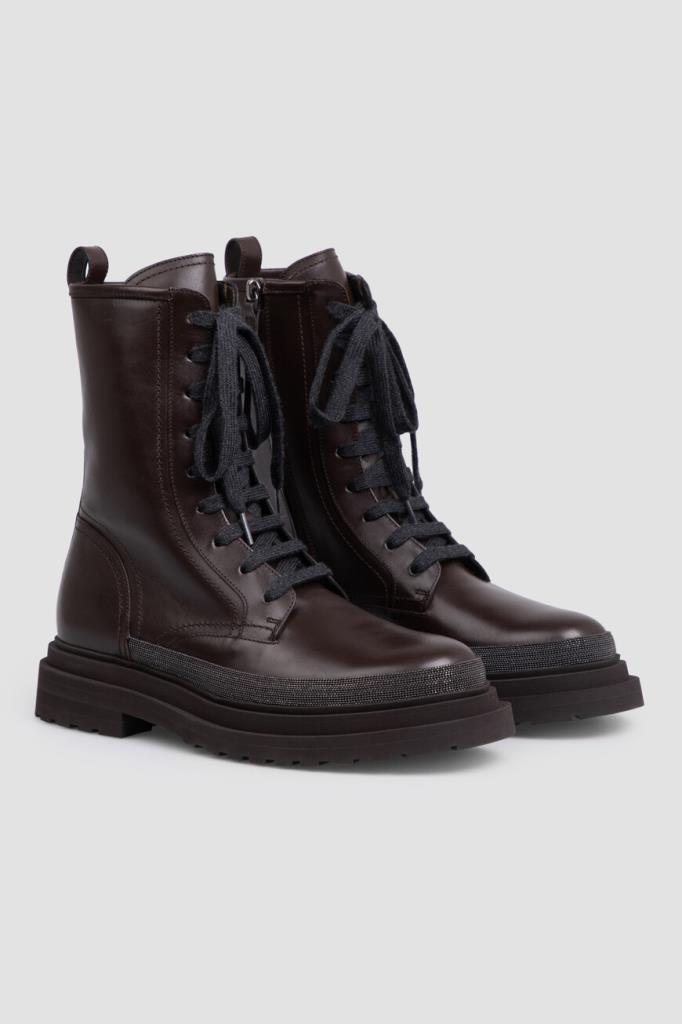 Высокие кожаные ботинки тёмно-коричневого цвета от BRUNELLO CUCINELLI. Изделие выполнено из гладкой телячьей кожи, отполированной до деликатного блеска. Для удобства надевания предусмотрены застёжка-молния сбоку и лента-петля в задней части. Конструкция модели предполагает открытую тёмно-серую шнуровку для надёжной фиксации на ноге и объёмную резиновую подошву с широким каблуком и крупным протектором для дополнительной устойчивости. Атрибутом Дома стала вставка-полоса из рядов блестящей серебристой цепочки Мониль спереди по краю.