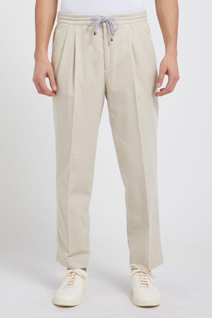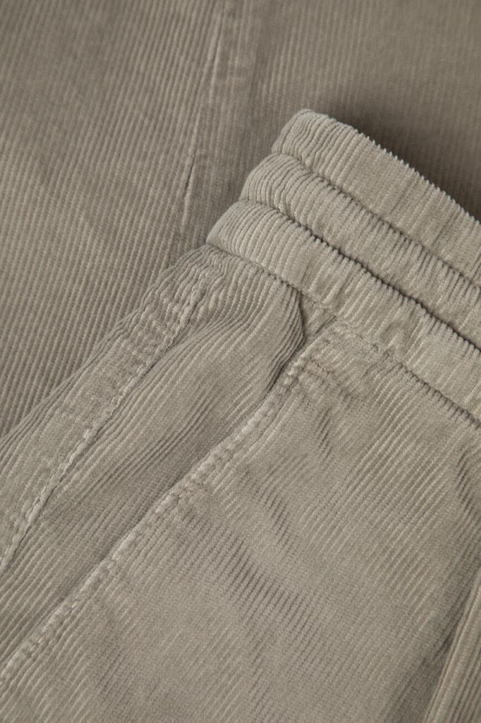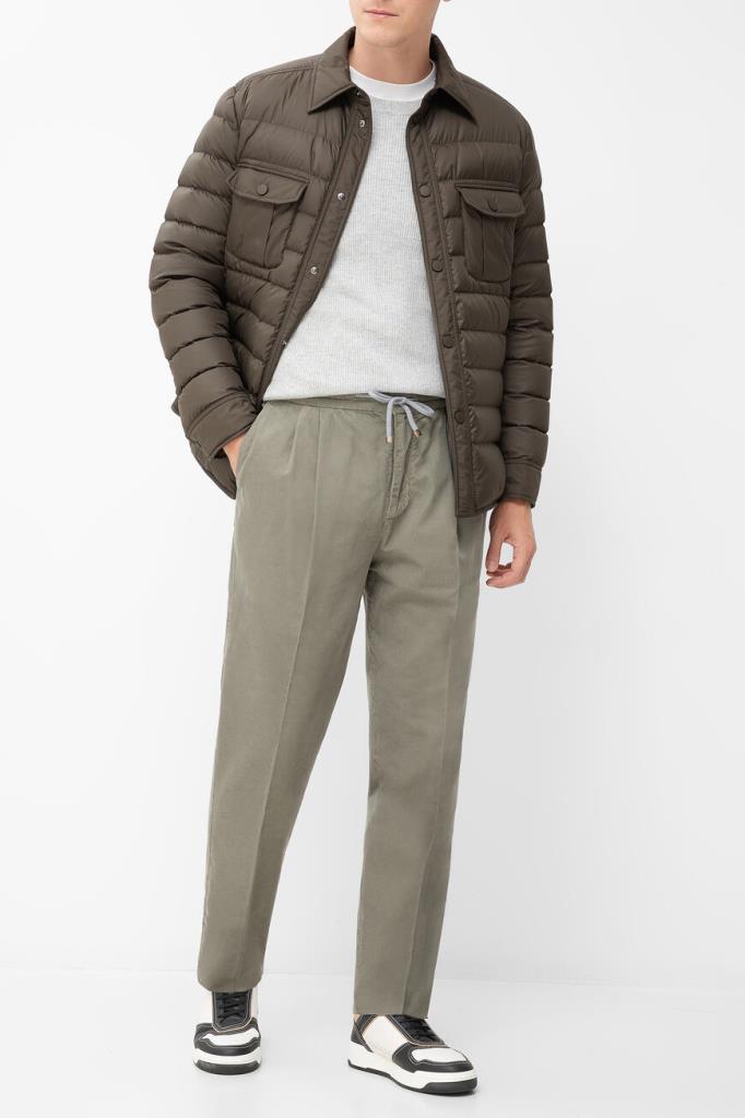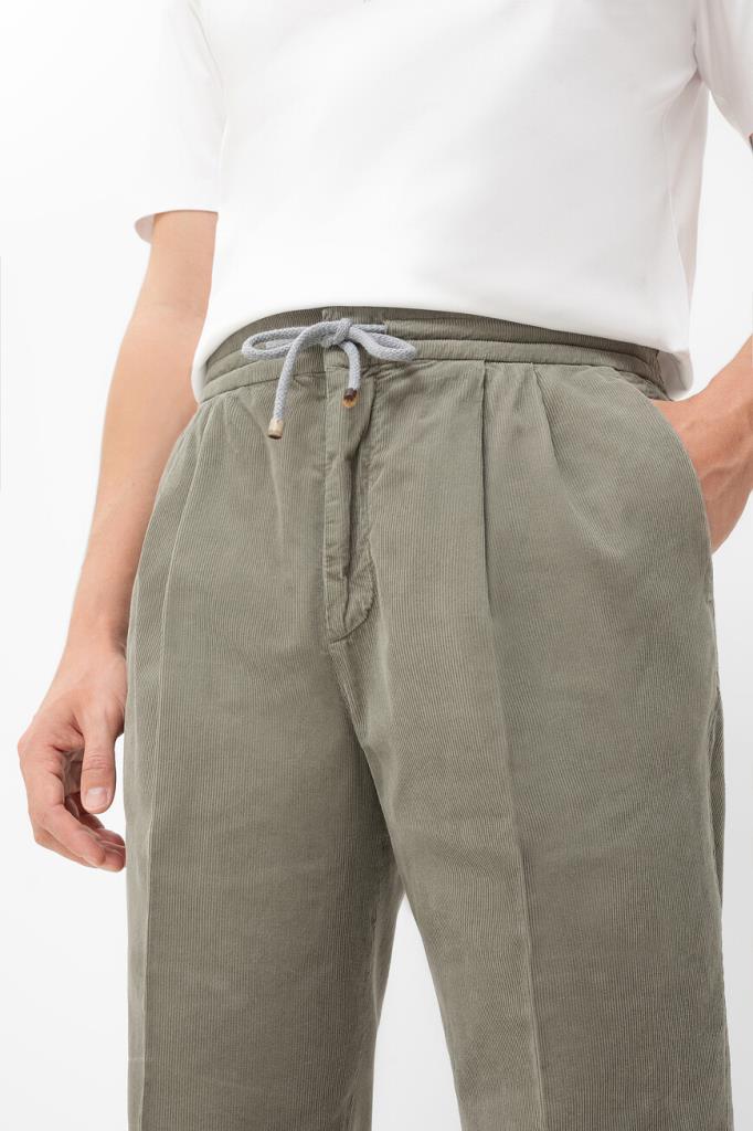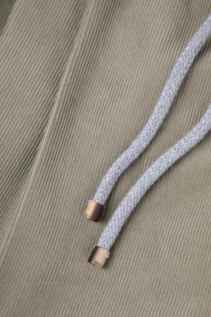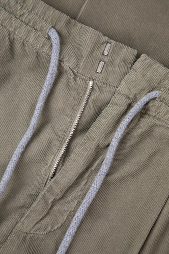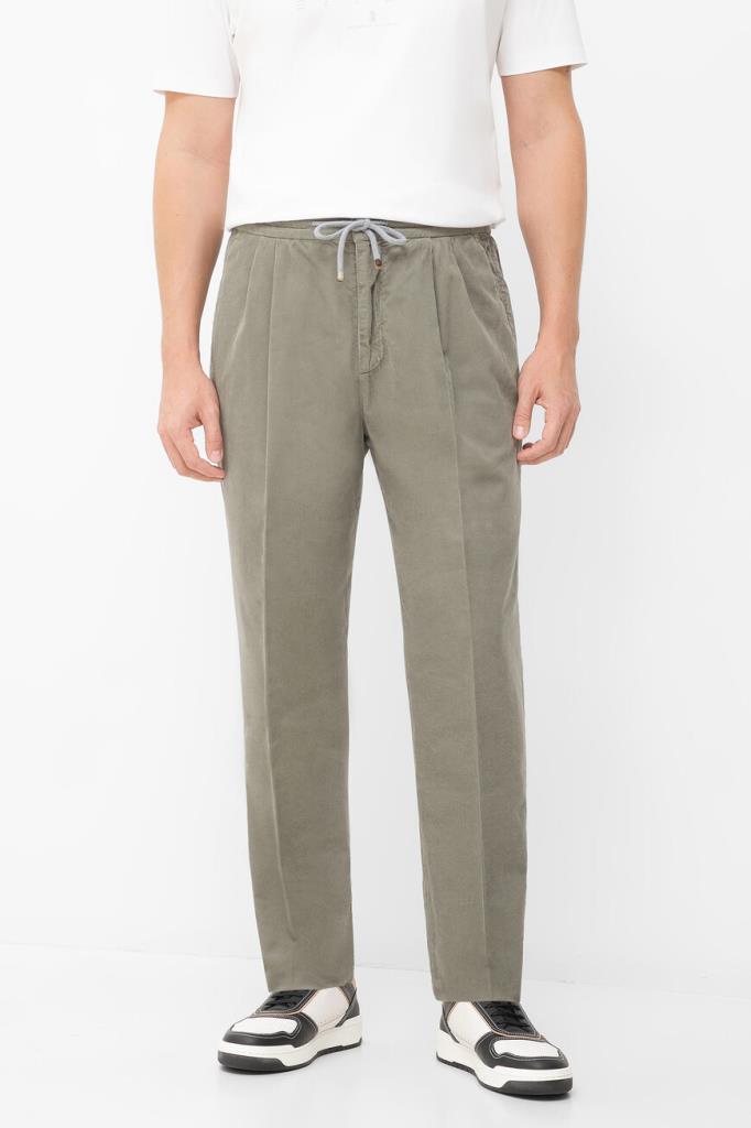 Прямые брюки оливкового оттенка от BRUNELLO CUCINELLI. Для изготовления модели в спортивном стиле выбран мягкий хлопковый вельвет с текстурой в тонкую полоску. Объём изделия с четырьмя прорезными карманами регулируется широким эластичным поясом на серых завязках, обеспечивающим комфорт и удобство в носке.