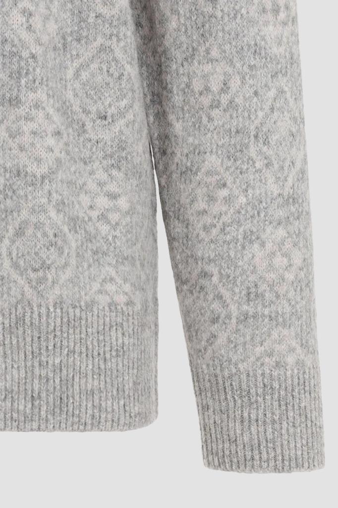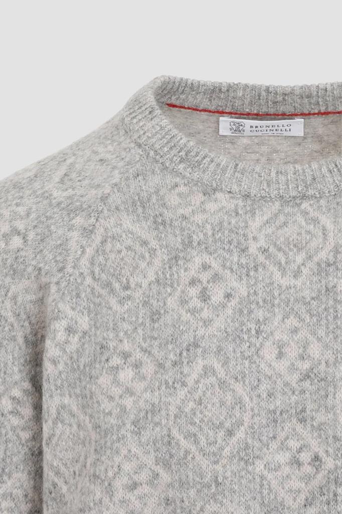 Вязаный свитер прямого силуэта от BRUNELLO CUCINELLI. Изделие выполнено из мягкого трикотажа на основе шерсти, хлопка, прочного нейлона и пряжи альпаки серого цвета. Натуральный состав пряжи требует присутствия небольшого процента синтетического волокна, которое сохраняет структуру модели. Поверхность свитера покрыта повторяющимся геометрическим мотивом ромбами в ретро-стиле. Горловина, манжеты рукавов и широкий пояс оформлены резинкой.