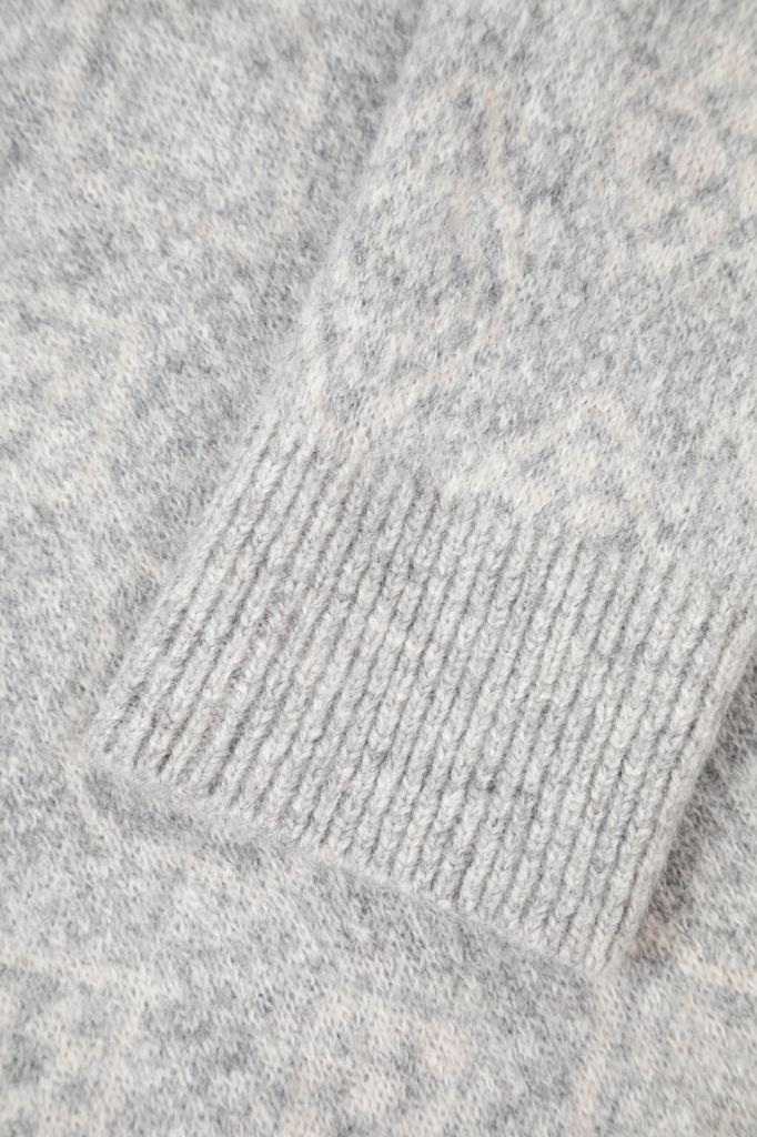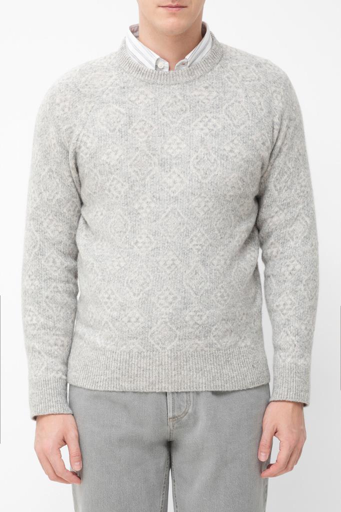 Вязаный свитер прямого силуэта от BRUNELLO CUCINELLI. Изделие выполнено из мягкого трикотажа на основе шерсти, хлопка, прочного нейлона и пряжи альпаки серого цвета. Натуральный состав пряжи требует присутствия небольшого процента синтетического волокна, которое сохраняет структуру модели. Поверхность свитера покрыта повторяющимся геометрическим мотивом ромбами в ретро-стиле. Горловина, манжеты рукавов и широкий пояс оформлены резинкой.