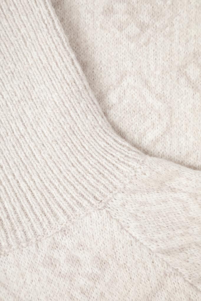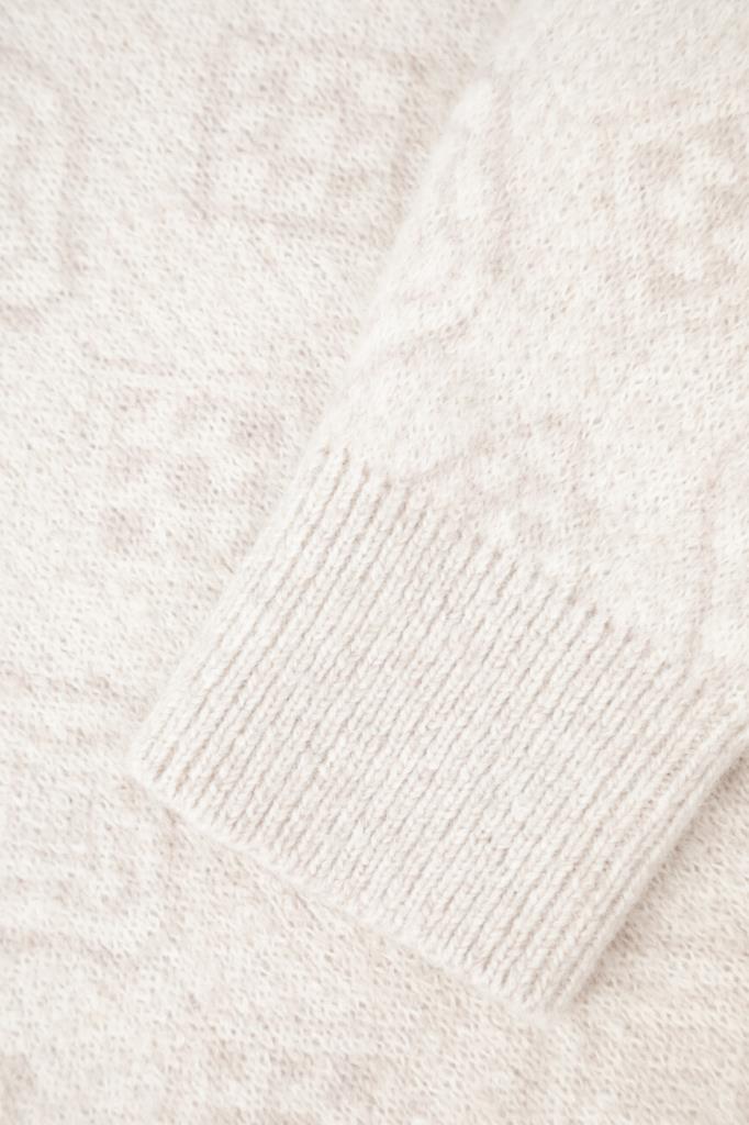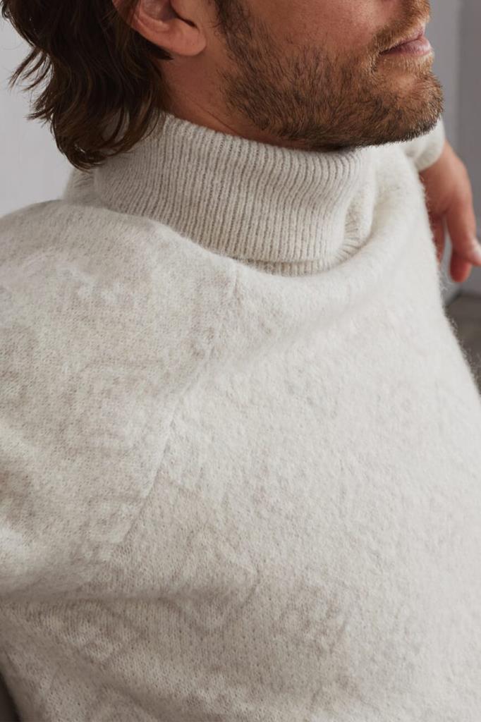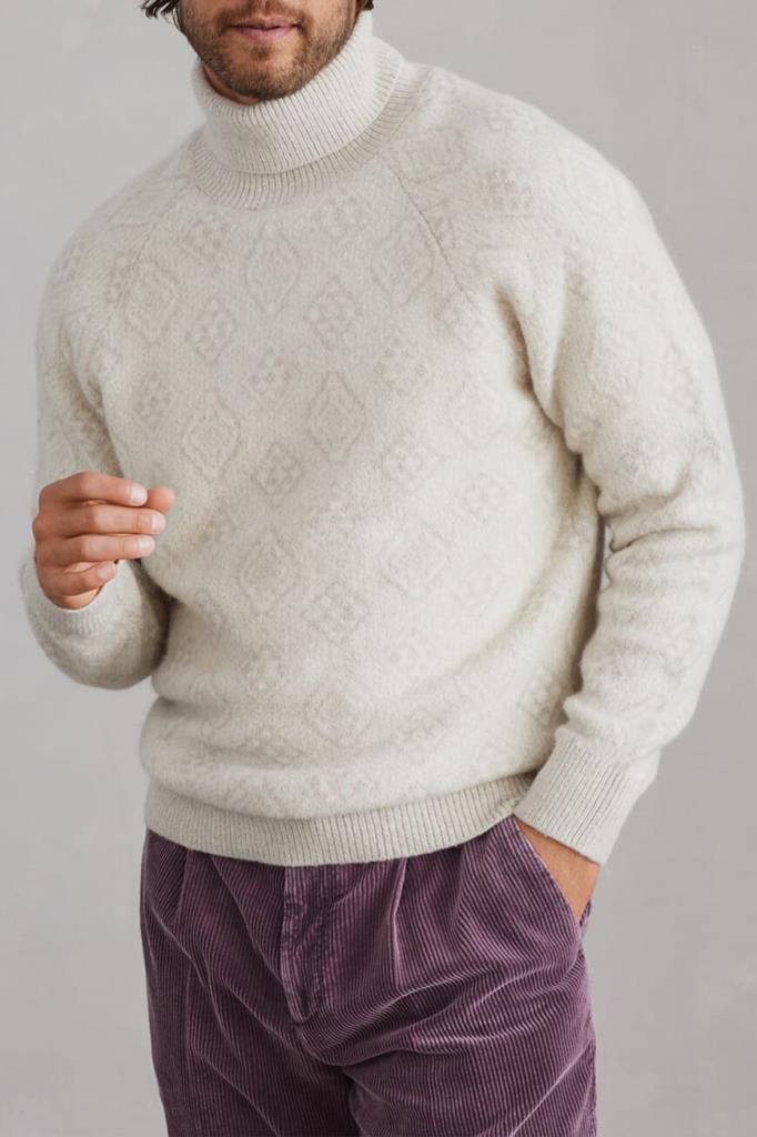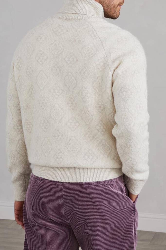 Водолазка Geometric Jacquard от BRUNELLO CUCINELLI. Модель изготовлена из мягкого трикотажа на основе шерсти, хлопка, прочного нейлона и пряжи альпаки с повторяющимся геометрическим мотивом ромбами, выполненном в ретро-стиле. Натуральный состав пряжи требует присутствия небольшого процента синтетического волокна, которое сохраняет структуру изделия. Пряжа придаёт кремовому рисунку приглушенный и изящный вид. Водолазка свободного силуэта характеризуется ручной жаккардовой отделкой на ткацком станке и высоким воротником фасона «гольф».