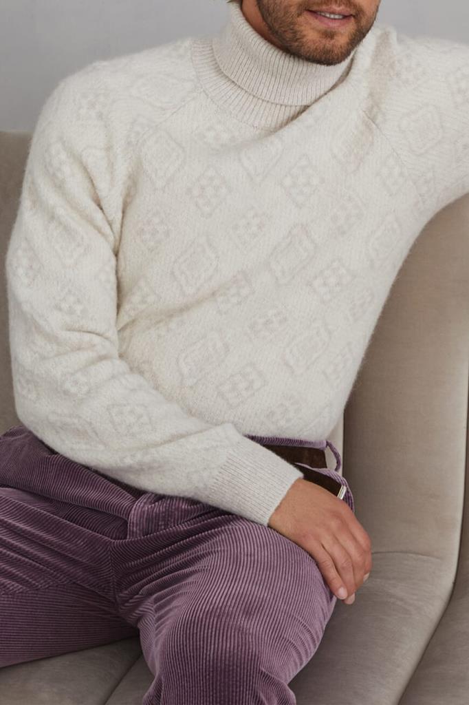 Водолазка Geometric Jacquard от BRUNELLO CUCINELLI. Модель изготовлена из мягкого трикотажа на основе шерсти, хлопка, прочного нейлона и пряжи альпаки с повторяющимся геометрическим мотивом ромбами, выполненном в ретро-стиле. Натуральный состав пряжи требует присутствия небольшого процента синтетического волокна, которое сохраняет структуру изделия. Пряжа придаёт кремовому рисунку приглушенный и изящный вид. Водолазка свободного силуэта характеризуется ручной жаккардовой отделкой на ткацком станке и высоким воротником фасона «гольф».