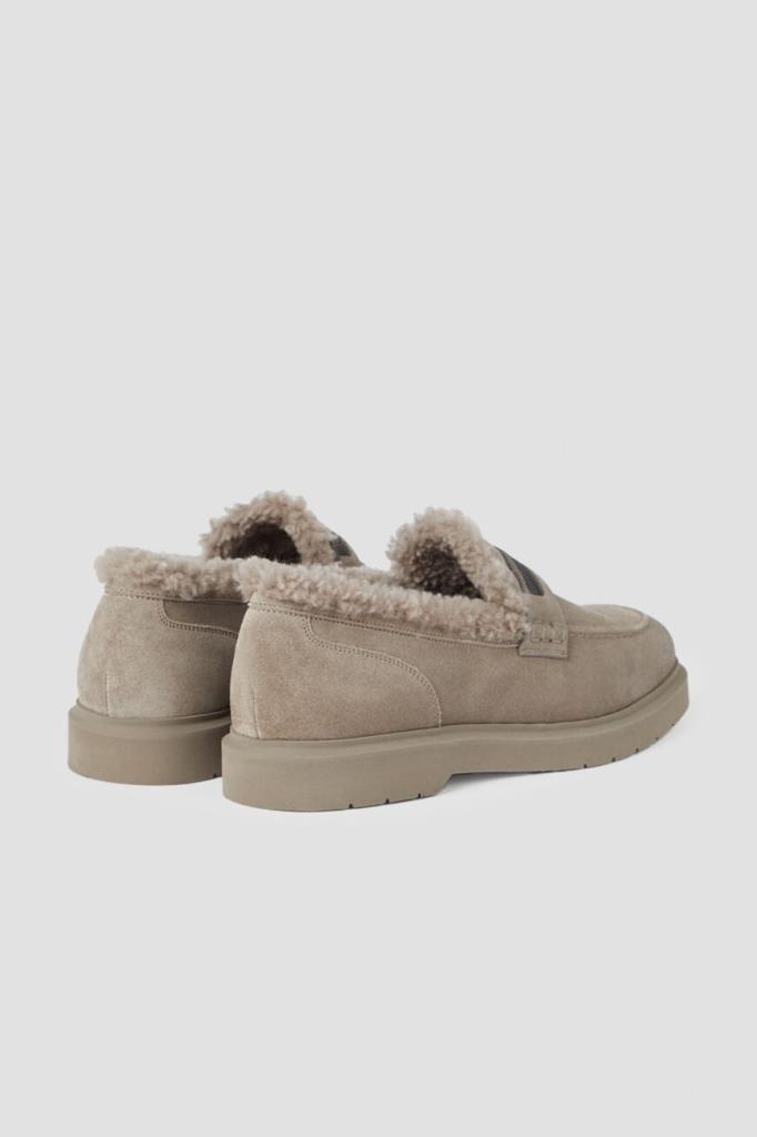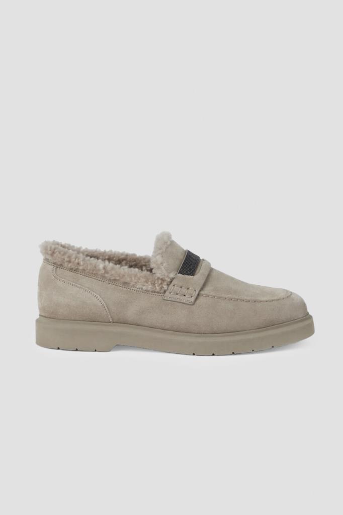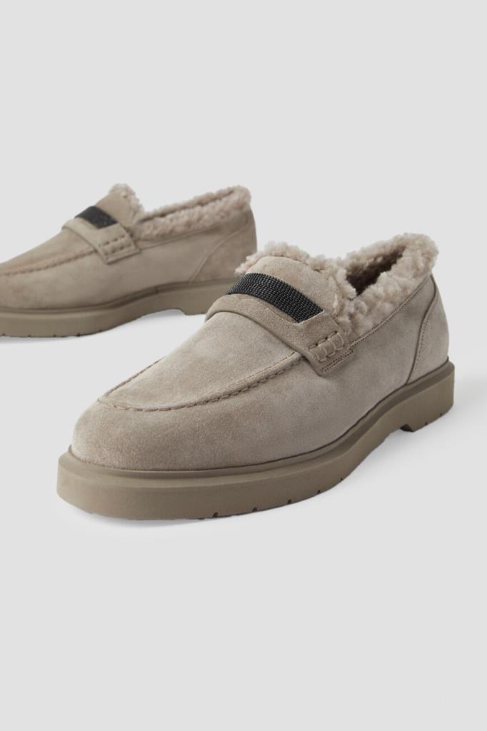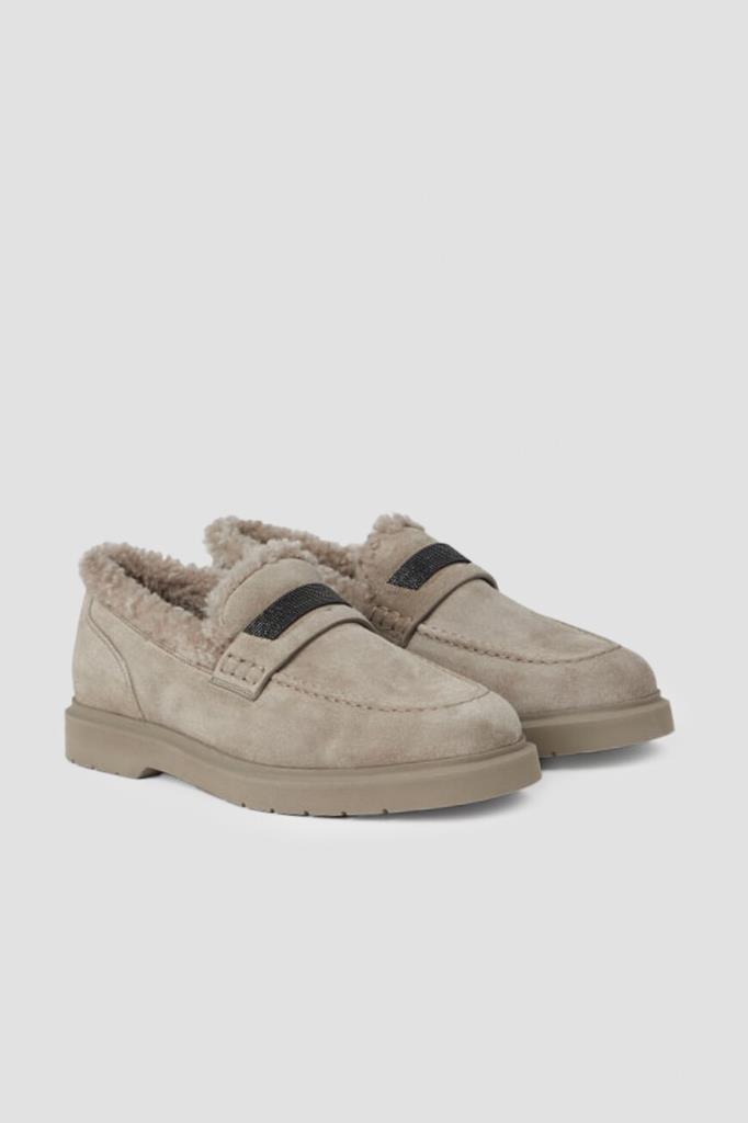 Серые пенни-лоферы Brunello Cucinelli с ворсистой внутренней отделкой из овчины. Для создания утеплённой модели выбрана мягкая замша. Лёгкая бархатистая текстура придаёт обуви утончённую ноту, а подкладка из меха ширлинга обеспечивает тепло и комфорт при носке. Классический поперечный ремешок оснащён фигурным вырезом и украшен сияющей вышивкой их рядов ценной цепочки Мониль - легендарным декором коллекций Дома.