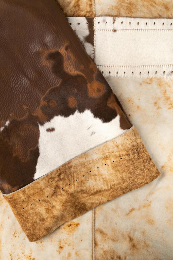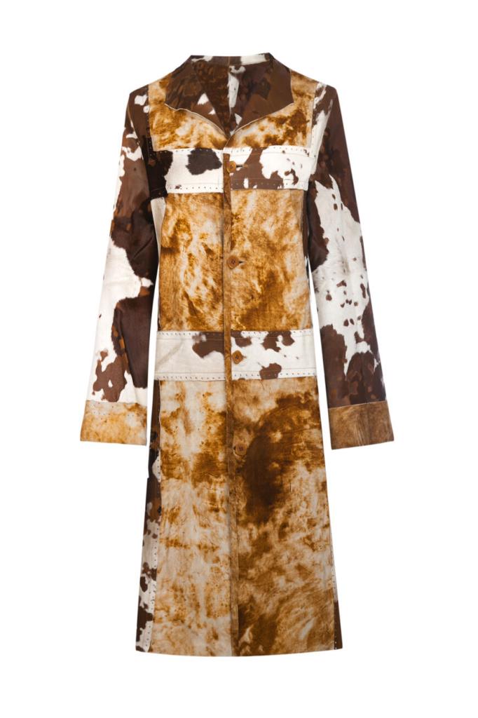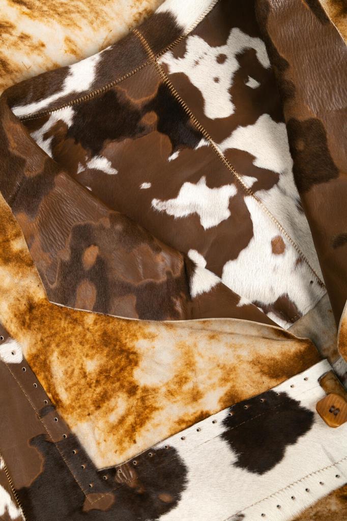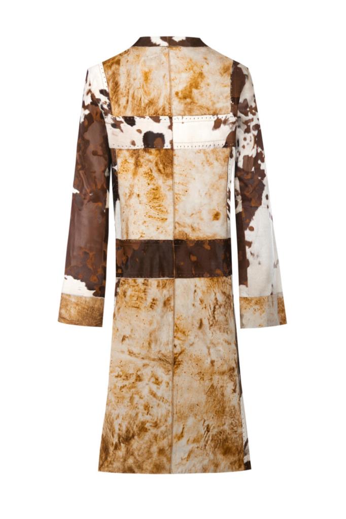 Роскошная женская куртка Podium выполнена из натуральной мягкой телячьей кожи коричневого оттенка с эффектным неоднородным контрастным узором и и разноцветными пятнистыми вставками по всей поверхности изделия.