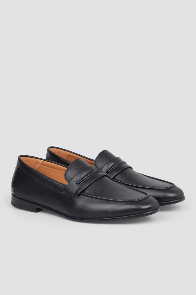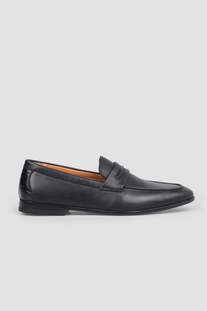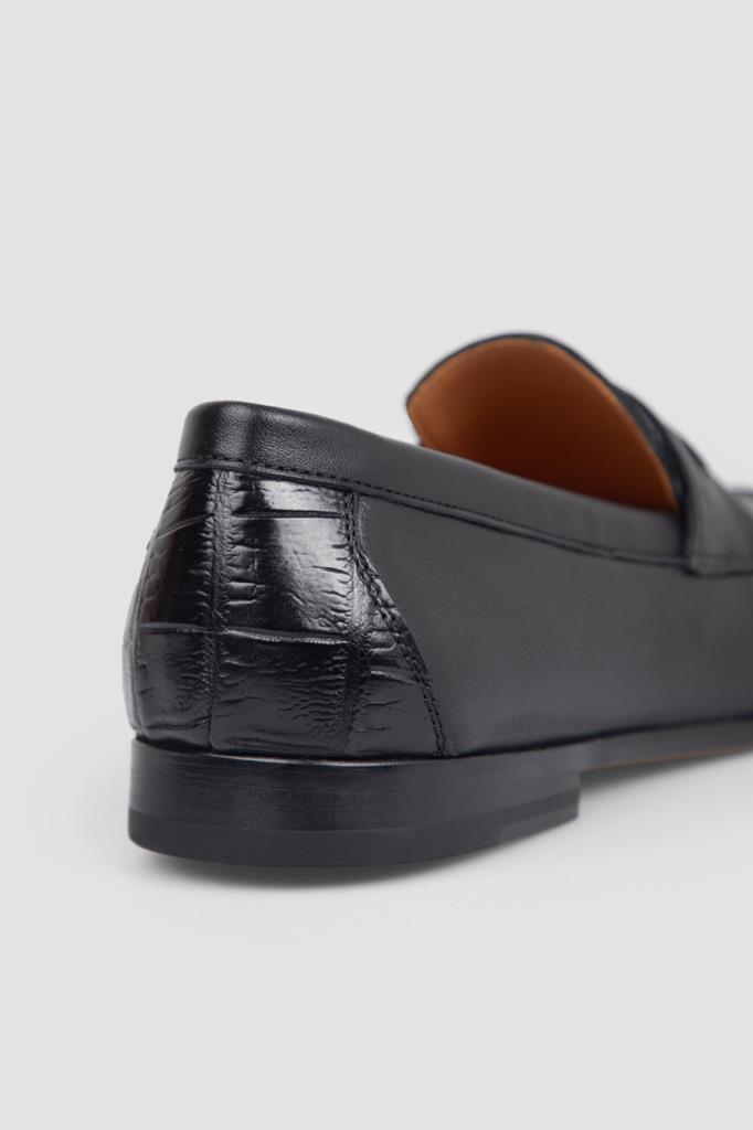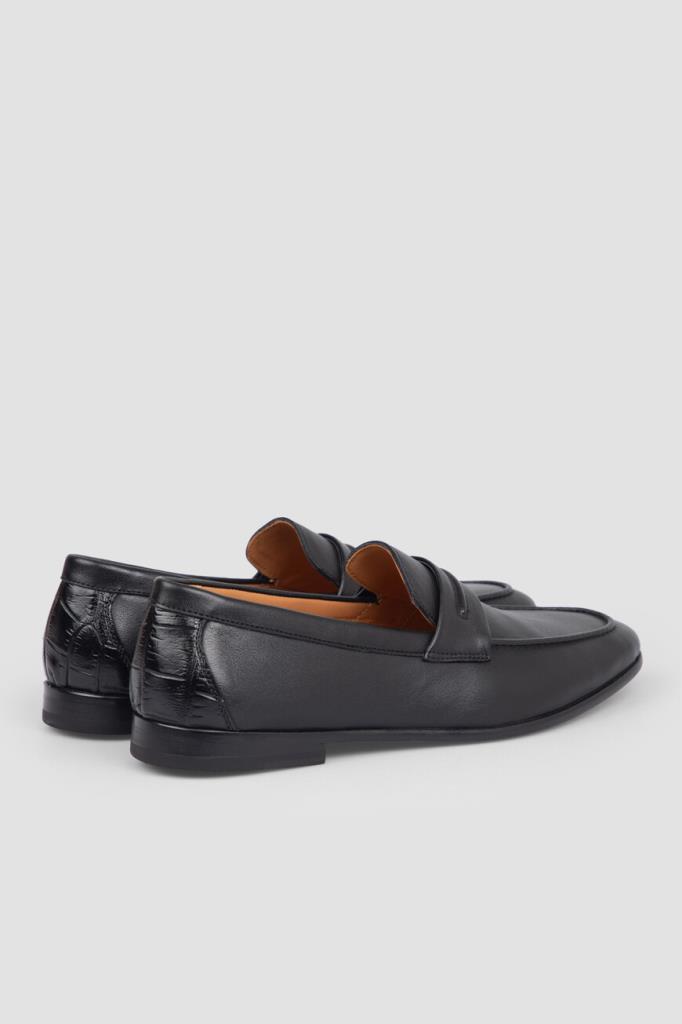 Чёрные лоферы FARGONI с широкой колодкой. Изделие выполнено из гладкой телячьей кожи тонкой выделки, которая сделала материал особенно мягким и пластичным. Декором выступают вставка из фактурной кожи крокодила на заднике в тон и классический поперечный ремешок с рельефной деталью. Пару сделали лаконичной, поэтому она гармонично сочетается как с классическими брюками, так и с джинсами.