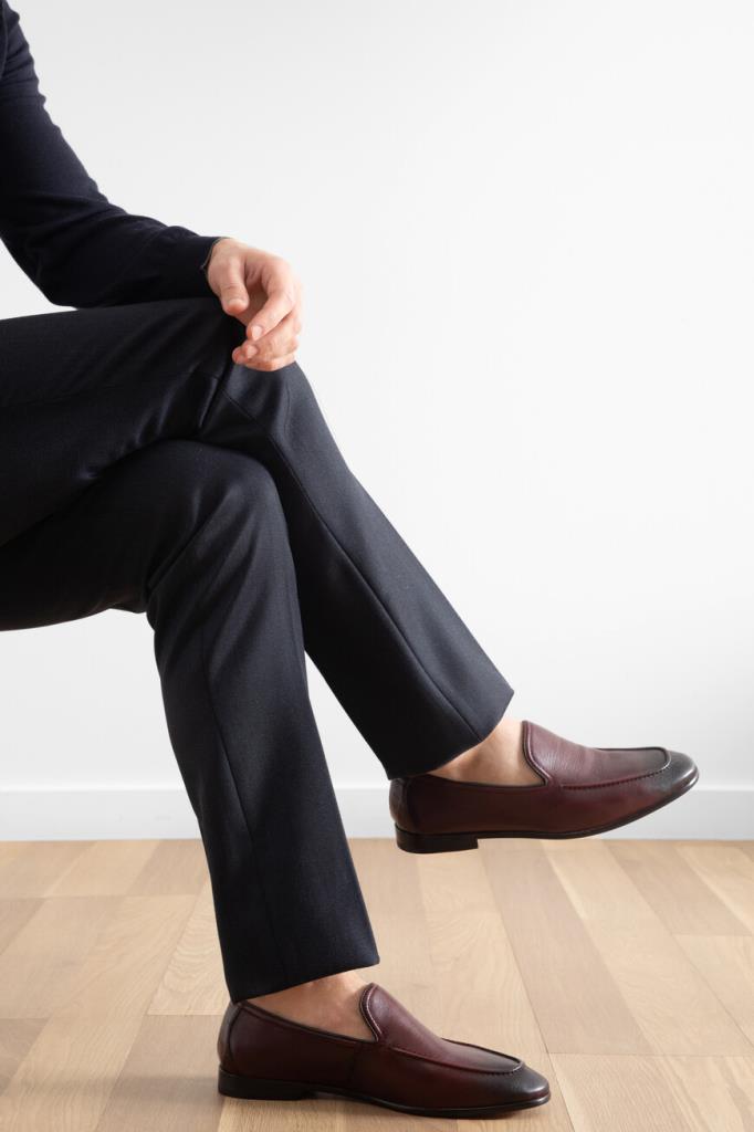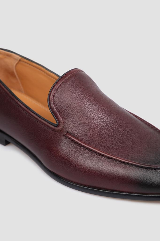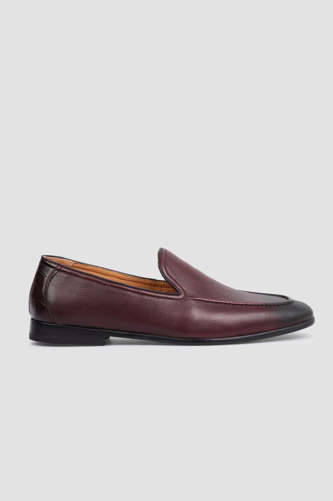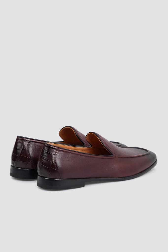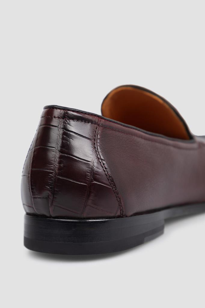 Бордовые лоферы FARGONI из натуральной зернистой кожи телёнка с патиной. Пара на чёрной кожаной подошве дополнена вставкой из крокодиловой кожи на заднике в тон. Изделие станет элегантным дополнением повседневного или делового ансамбля.