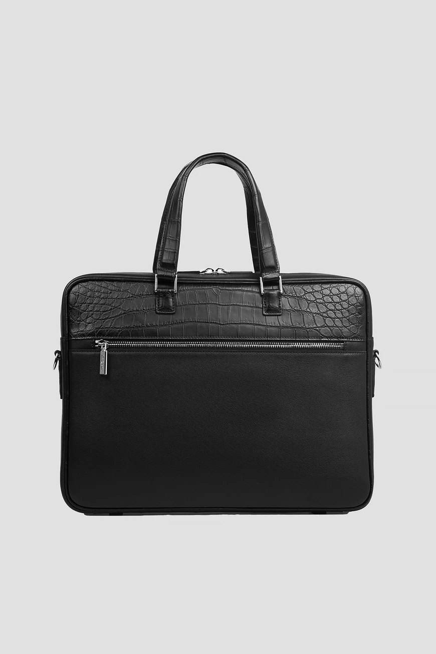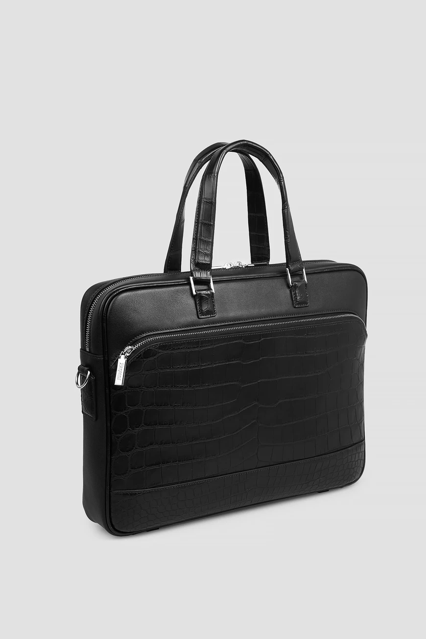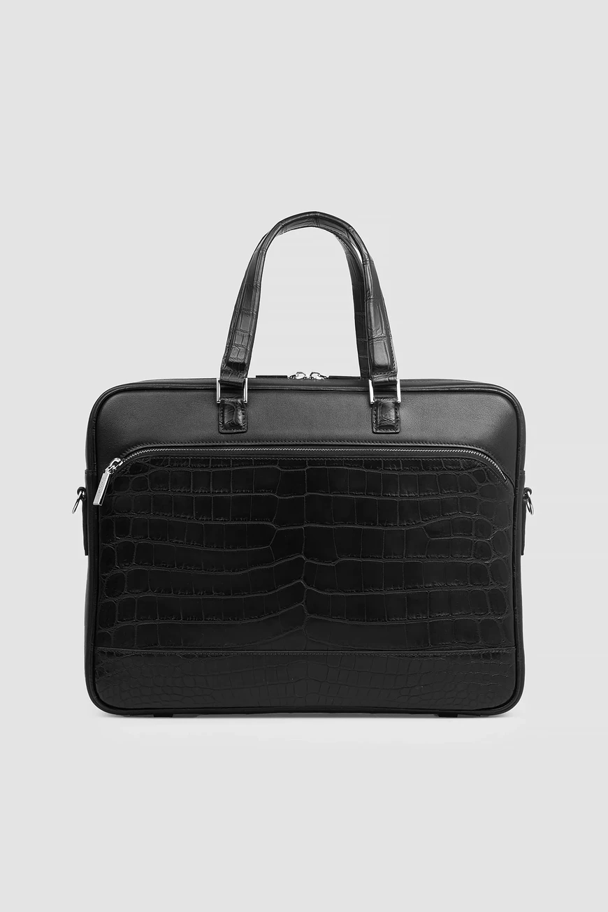 Комбинированная сумка чёрного цвета от Fargoni. Изделие ручной работы выполнено из двух видов материалов: мягкой телячьей кожи и фактурной кожи крокодила. Модель застёгивается на молнию с двумя брендированными бегунками. Для удобства переноски предусмотрены округлые кожаные ручки и D-образные кольца для крепления плечевого ремня.