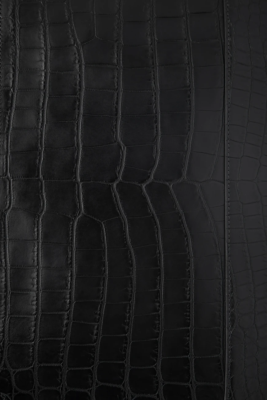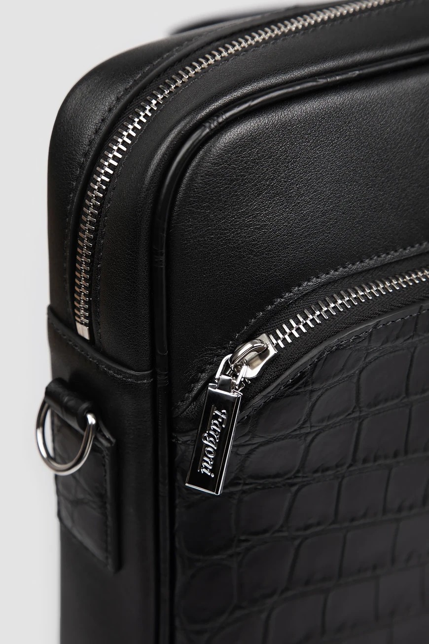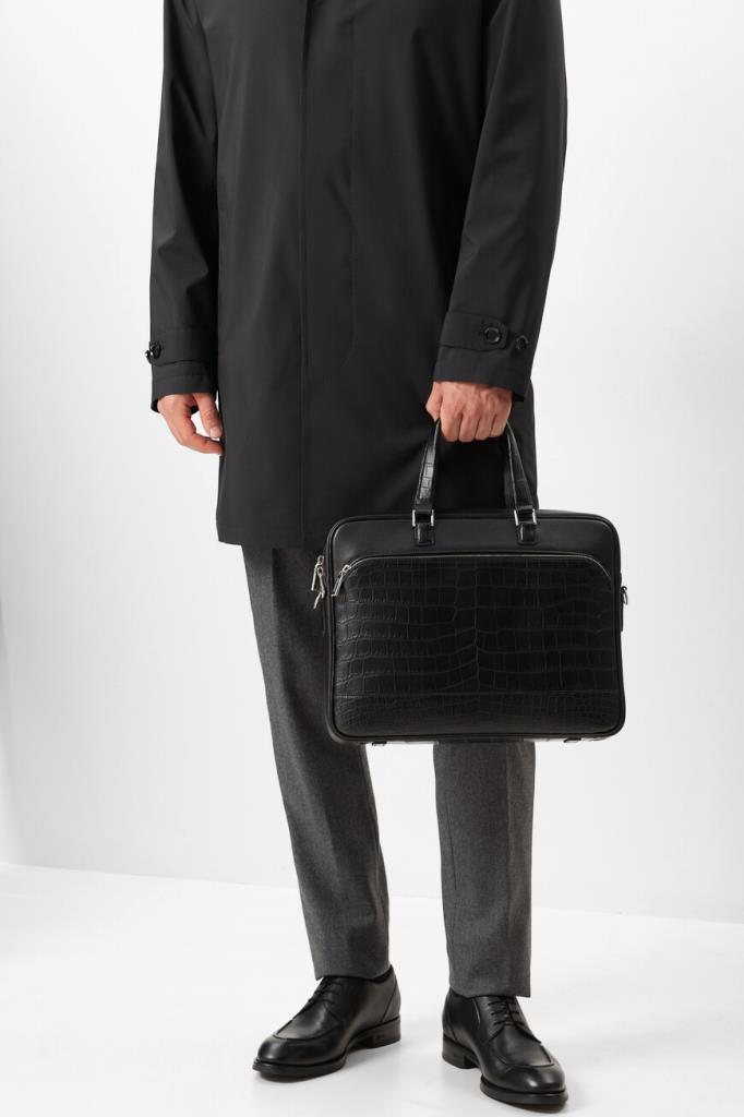 Комбинированная сумка чёрного цвета от Fargoni. Изделие ручной работы выполнено из двух видов материалов: мягкой телячьей кожи и фактурной кожи крокодила. Модель застёгивается на молнию с двумя брендированными бегунками. Для удобства переноски предусмотрены округлые кожаные ручки и D-образные кольца для крепления плечевого ремня.