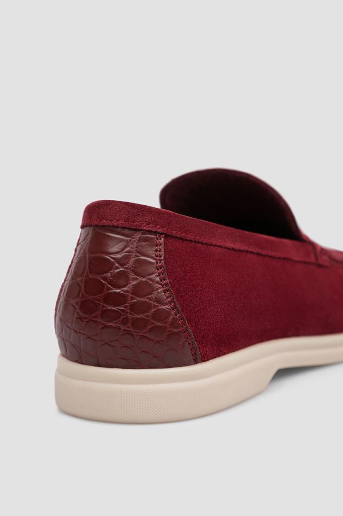 Лоферы FARGONI с исключительным уровнем конструирования и обработки деталей. Изделие с овальным миндалевидным мысом и гибкой резиновой подошвой выполнено из прочной бархатистой замши бордового оттенка. Материал тщательно выделали, чтобы сделать его ещё мягче и эластичнее. Задник декорирован вставкой из фактурной кожи крокодила в тон. Такая пара гармонично дополнит и повседневный образ, и комплект в стиле smart casual.