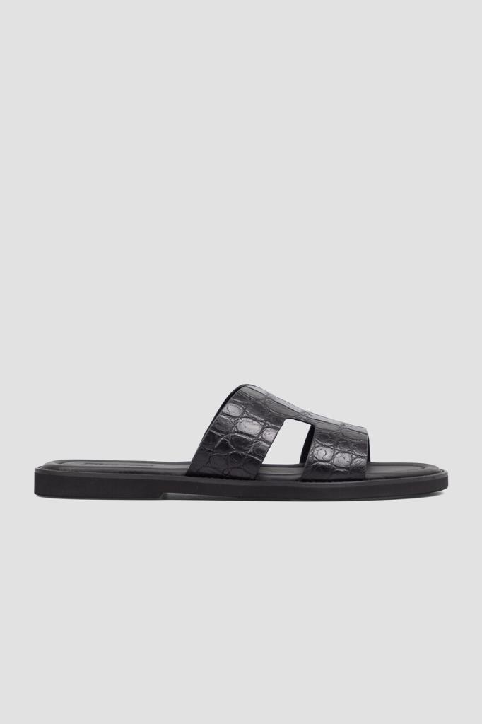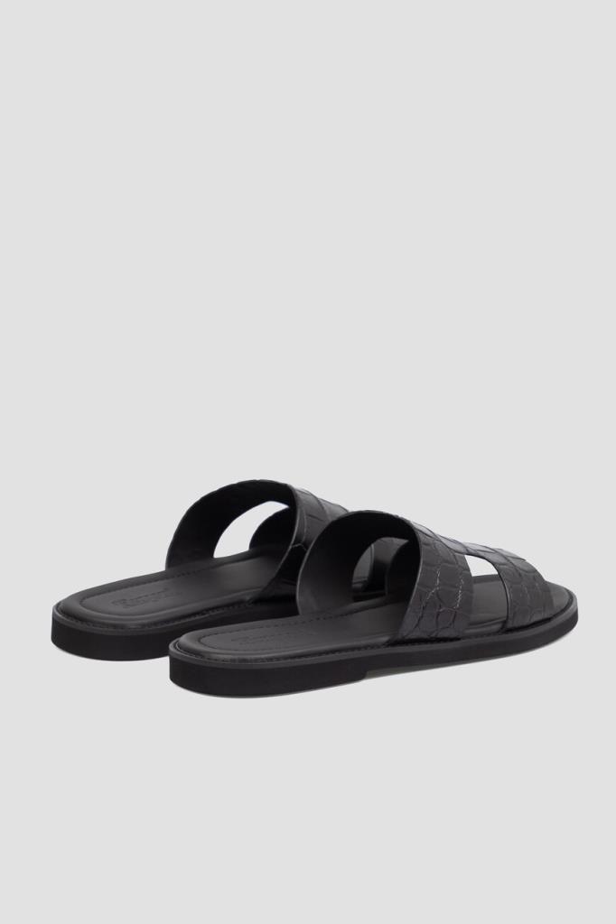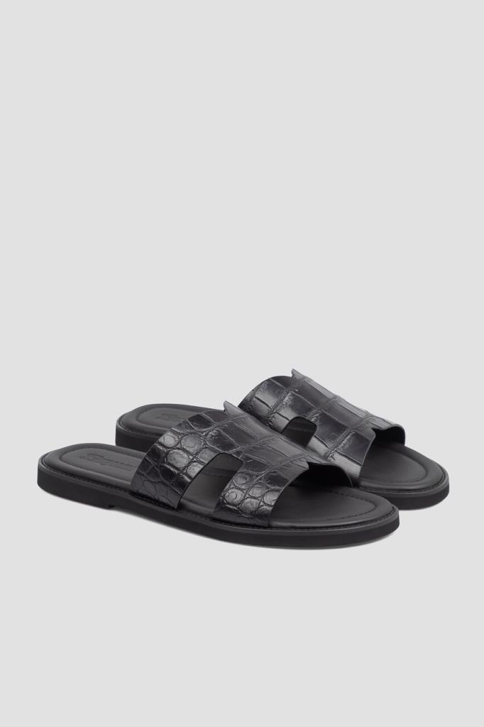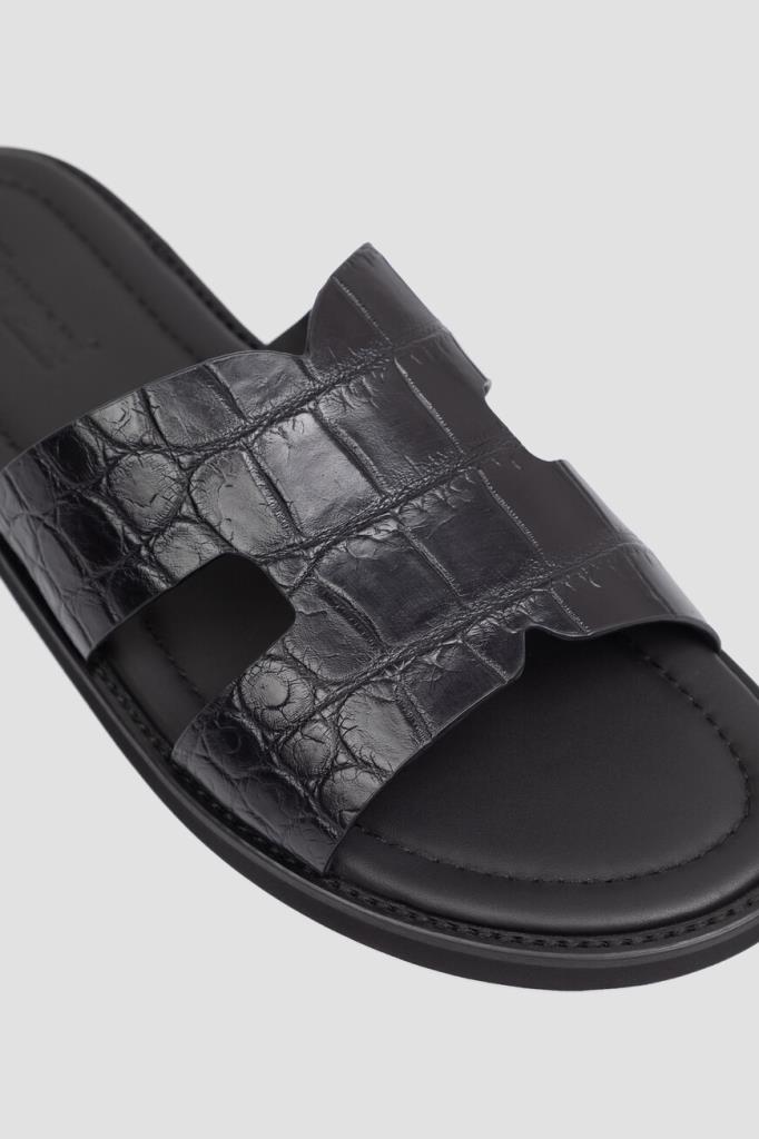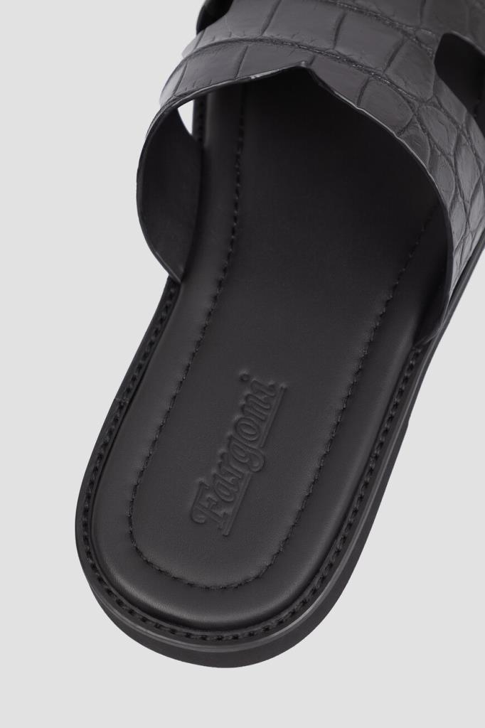 Кожаные шлёпанцы ручной работы от Fargoni. Комбинированная модель отличается широким мыском из мягкой фактурной кожи крокодила с прорезями по бокам, стельками из прочной телячьей кожи и резиновой подошвой с невысоким устойчивым каблуком в тон. Атрибутом Дома стал крупный тиснёный логотип на стельках.