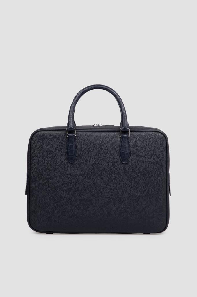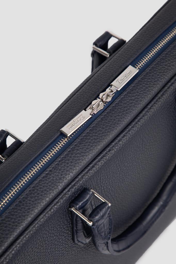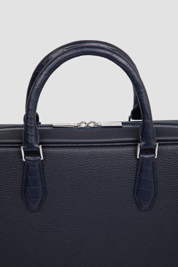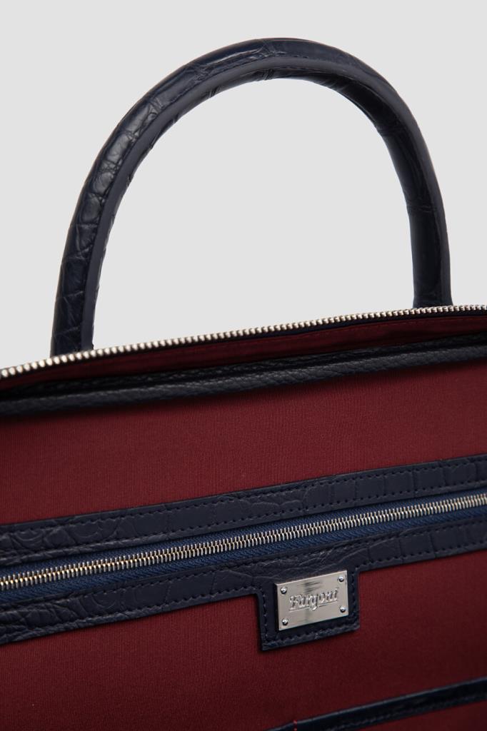 Деловая сумка с объёмным внутренним отделением от Fargoni. Конструкция модели из мягкой зернистой кожи телёнка тёмно-синего цвета предполагает прямоугольную форму и рёбра жёсткости, надёжно защищающие содержимое от ударов и повреждений. Особенностями изделия стали  вставки из экзотической кожи крокодила по бокам и на округлых ручках в тон и бордовая тканевая подкладка.