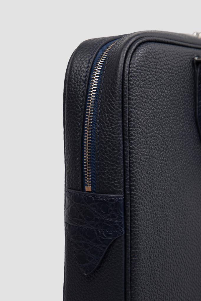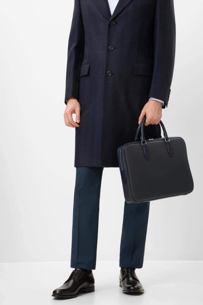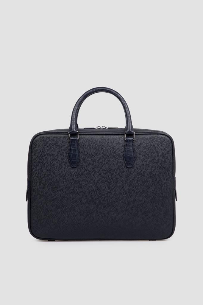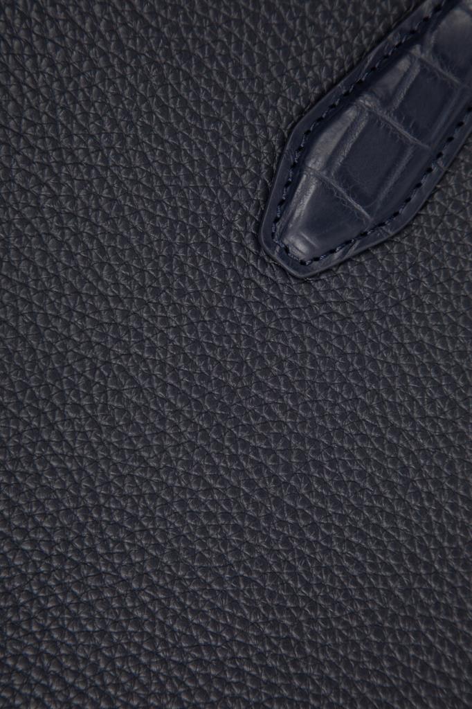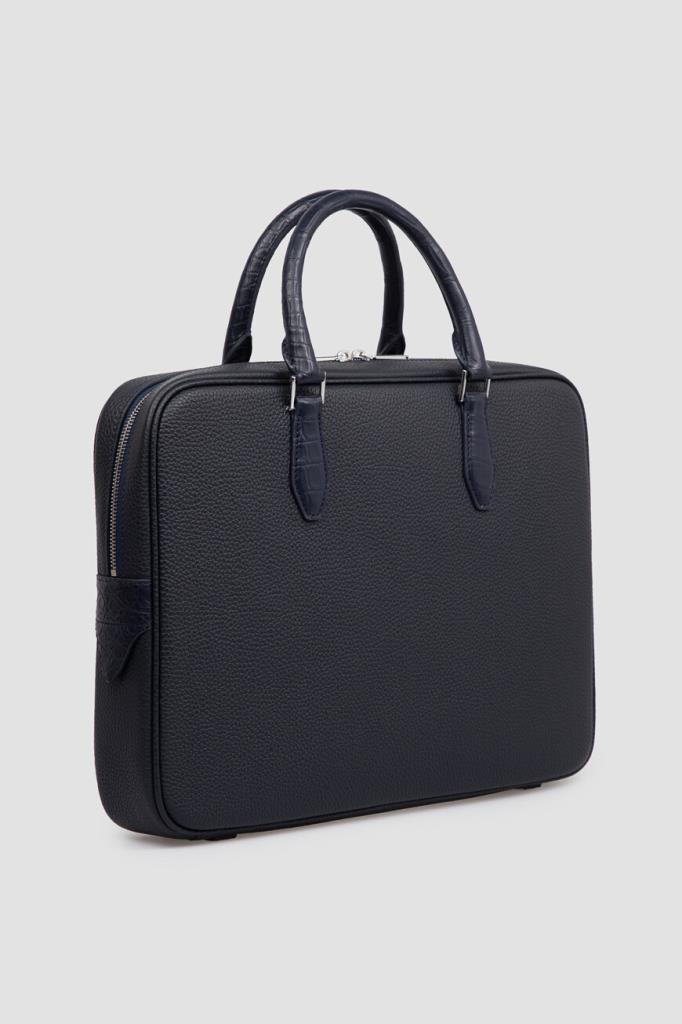 Деловая сумка с объёмным внутренним отделением от Fargoni. Конструкция модели из мягкой зернистой кожи телёнка тёмно-синего цвета предполагает прямоугольную форму и рёбра жёсткости, надёжно защищающие содержимое от ударов и повреждений. Особенностями изделия стали  вставки из экзотической кожи крокодила по бокам и на округлых ручках в тон и бордовая тканевая подкладка.