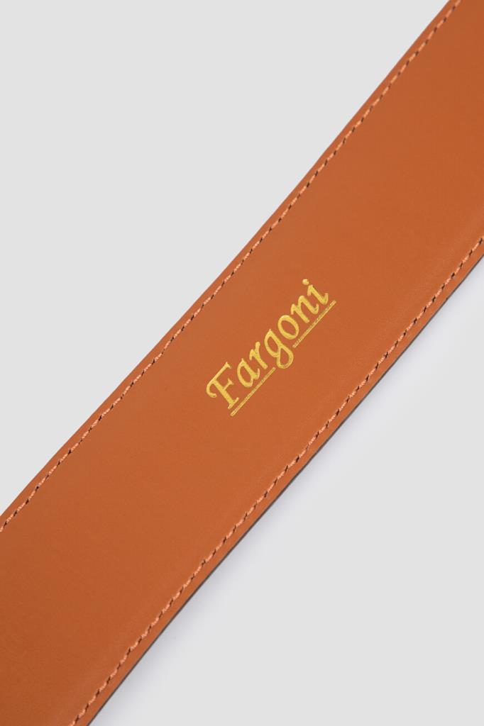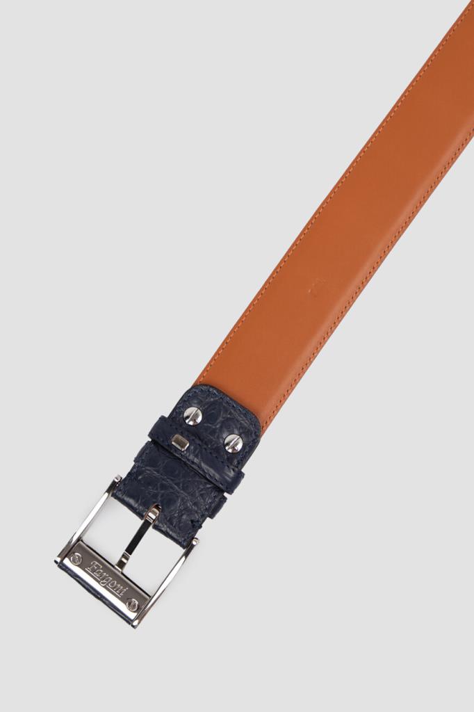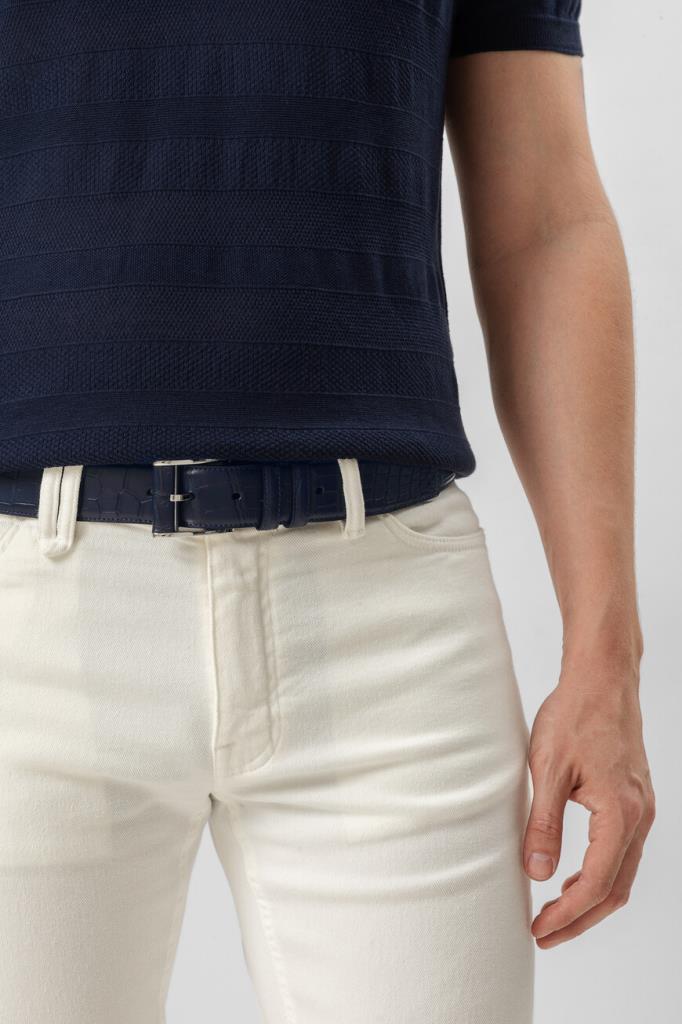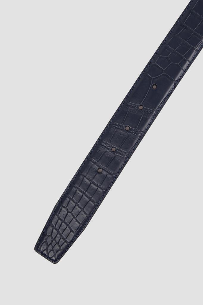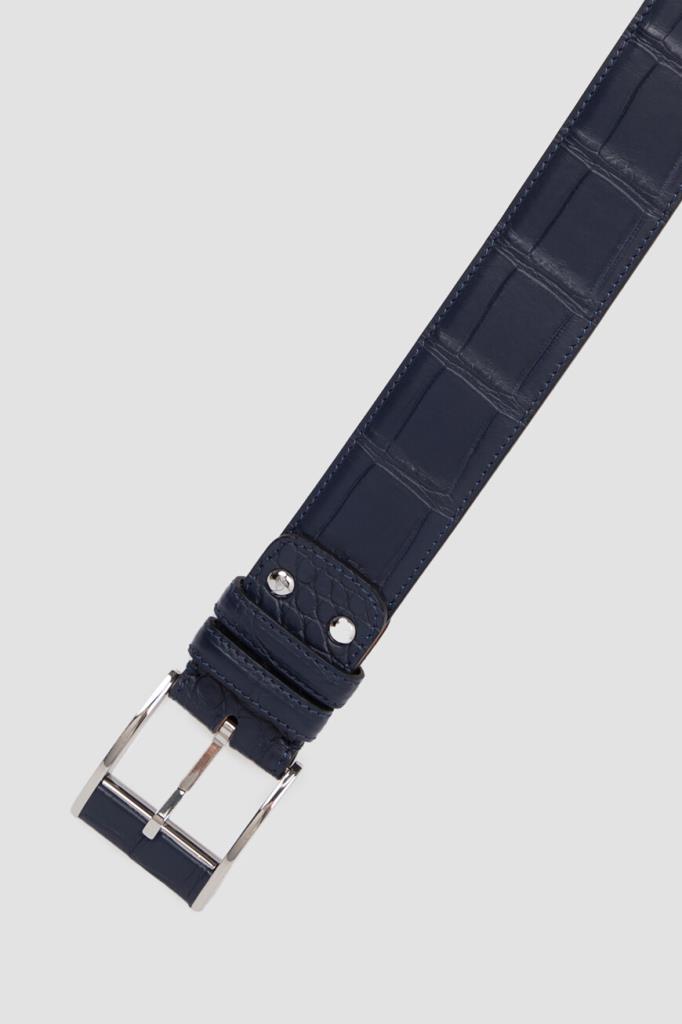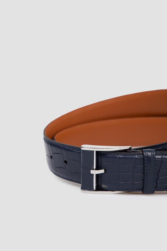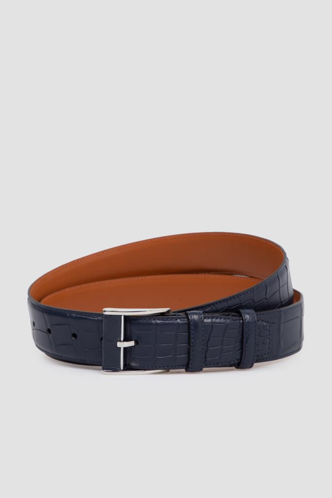 Кожаный ремень Fargoni с классической прямоугольной пряжкой. Изделие выполнено из мягкой фактурной кожи крокодила тёмно-синего цвета с уникальным природным узором. Аксессуар прошит по краю и дополнен двумя подвижными тренчиками для фиксации наконечника.