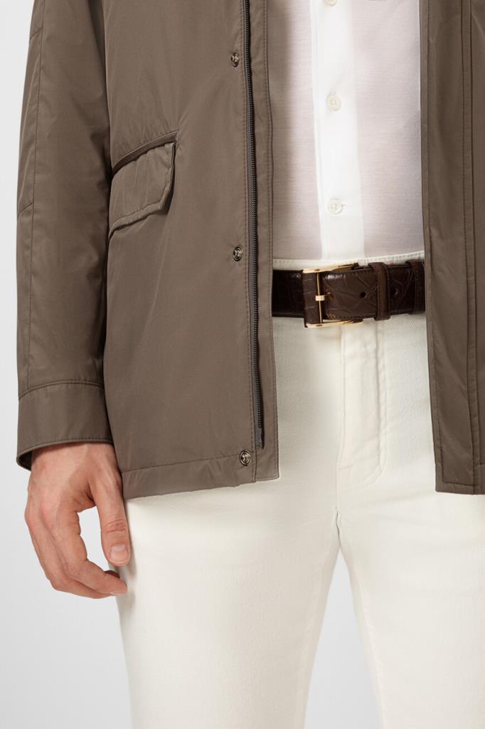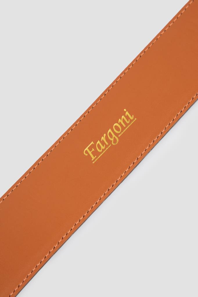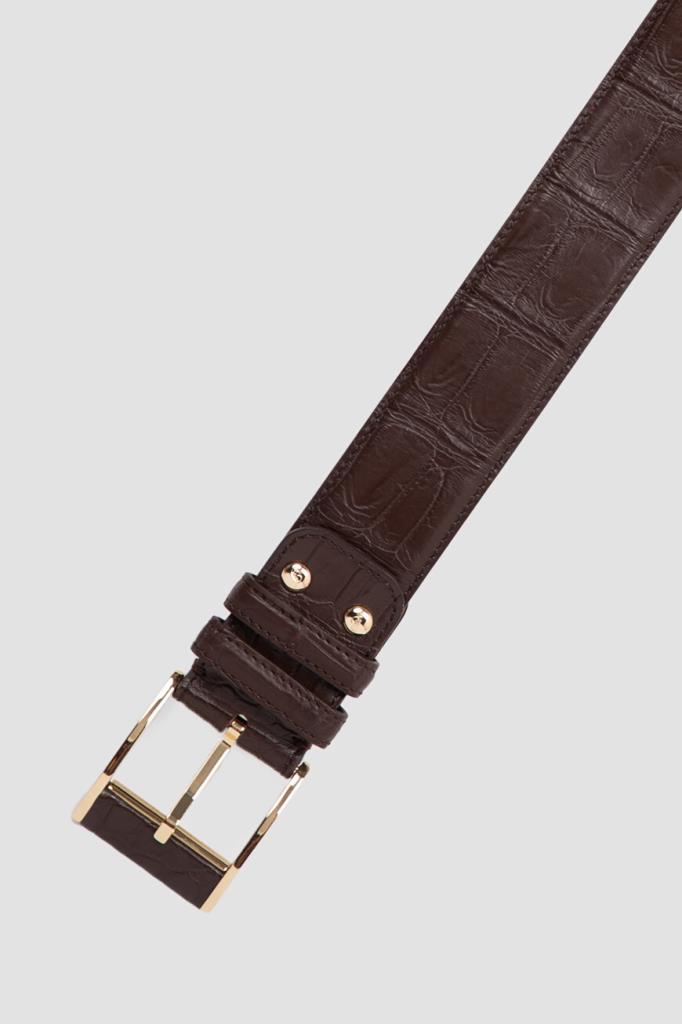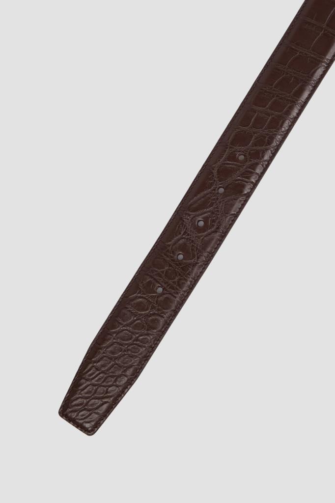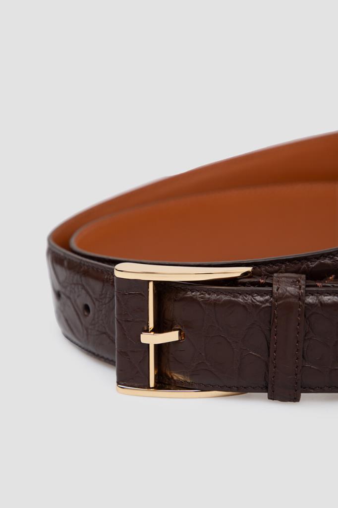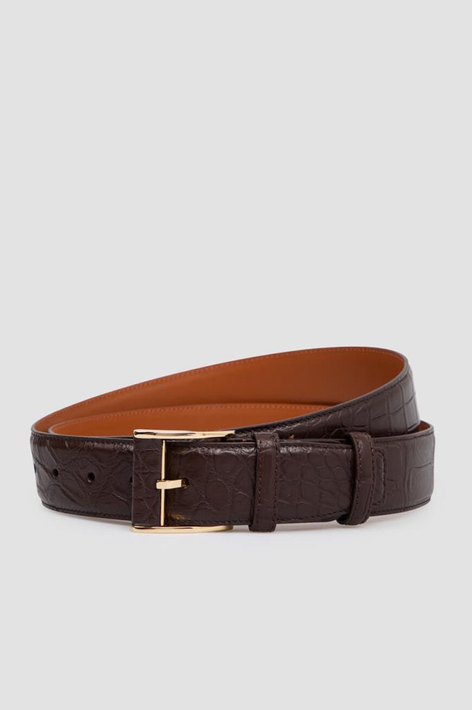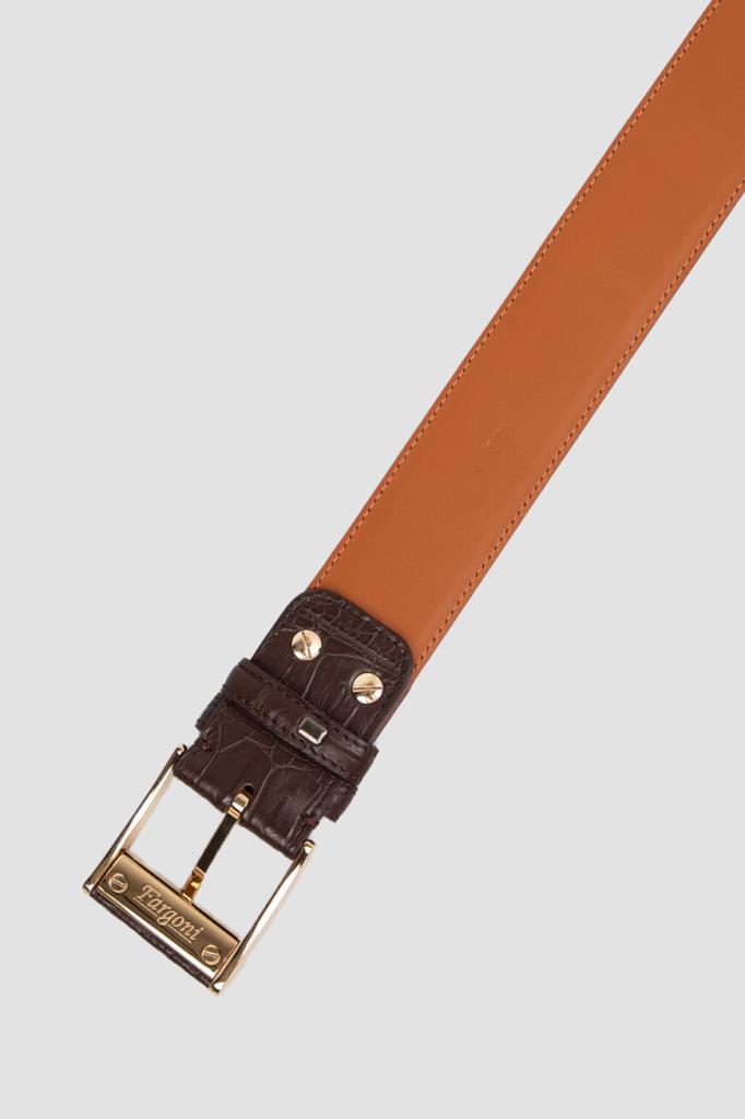 Ремень с уникальным экзотическим узором от Fargoni. Для создания классического аксессуара с квадратной пряжкой используется мягкая фактурная кожа крокодила коричневого цвета. Для фиксации наконечника предусмотрены два подвижных тренчика. Изделие отличается светло-коричневой подкладкой из натуральной кожи телёнка и станет неотъемлемой частью Вашего образа.