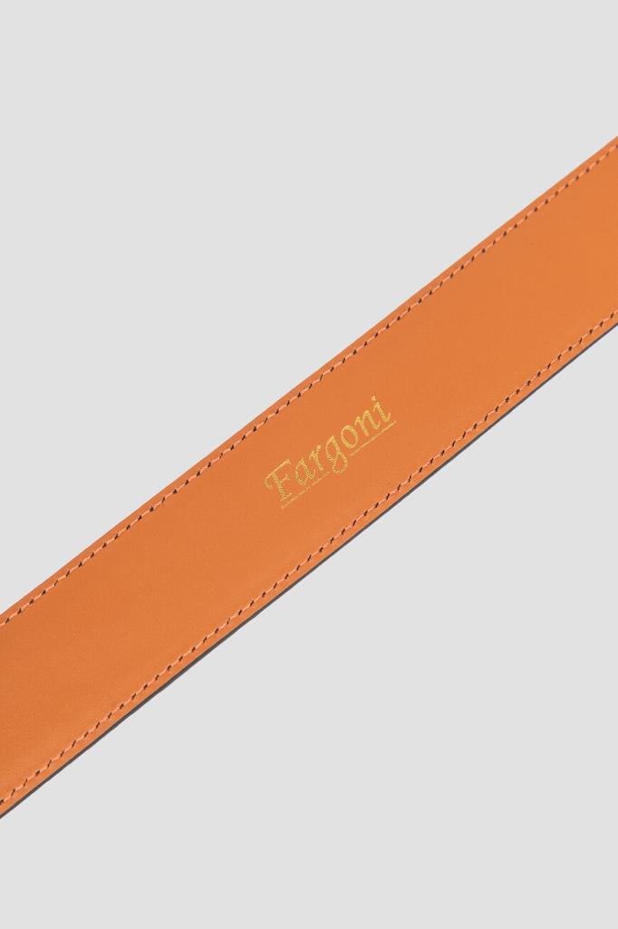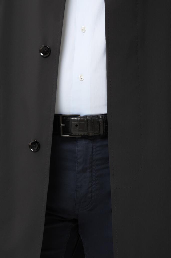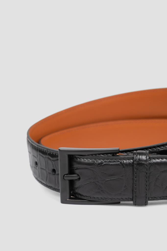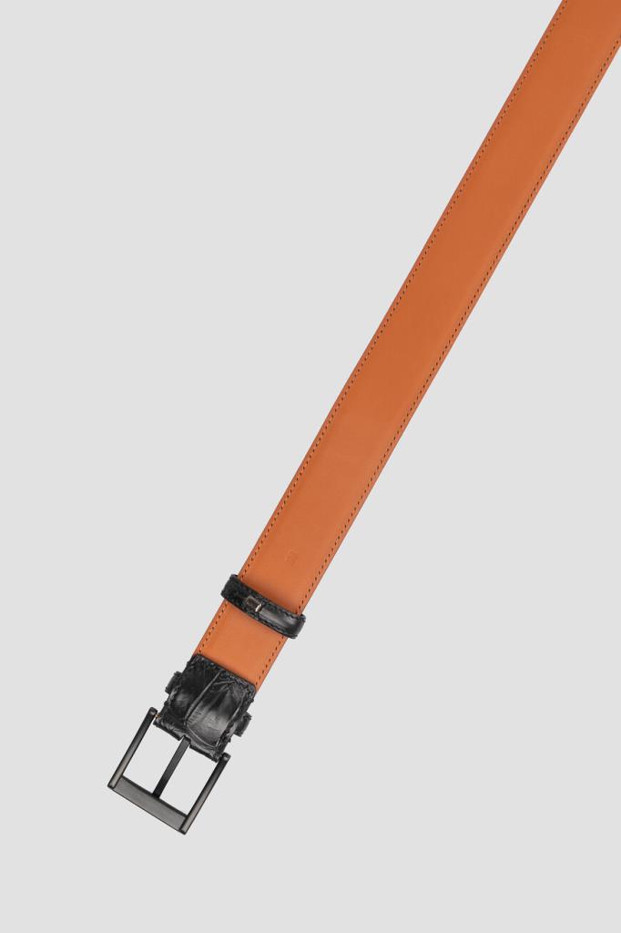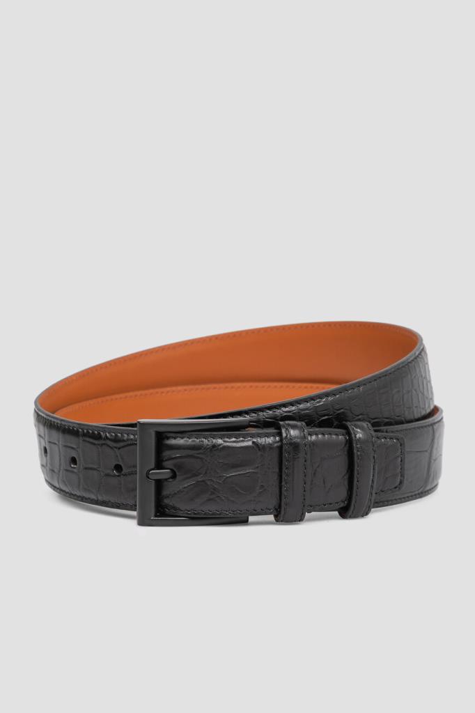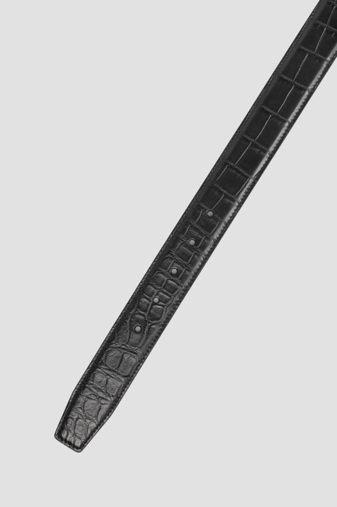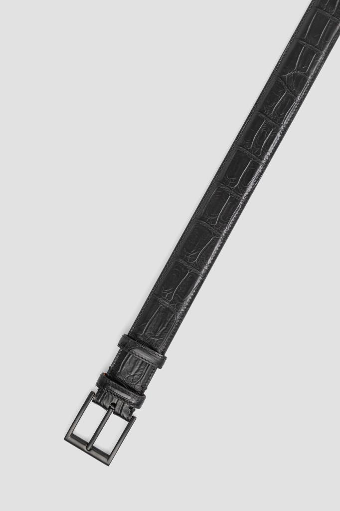 Чёрный ремень ручной работы от Fargoni. Для изготовления модели с классической прямоугольной пряжкой выбрана натуральная фактурная кожа крокодила с уникальным экзотическим узором. Аксессуар оснащён двумя подвижными тренчиками и светло-коричневой подкладкой из мягкой телячьей кожи.