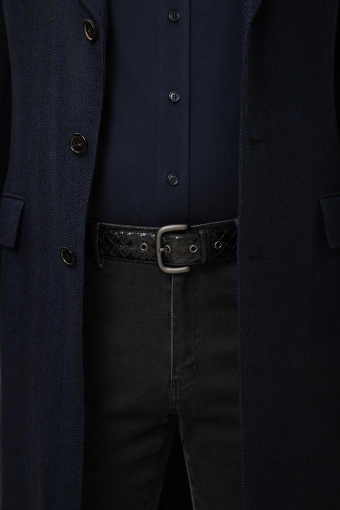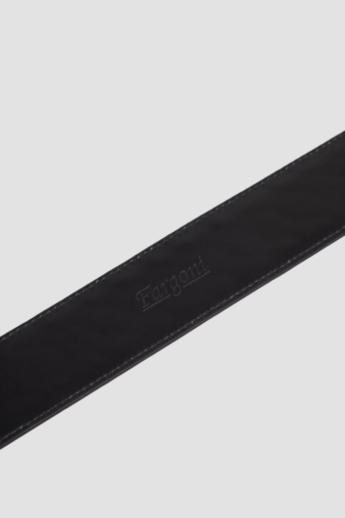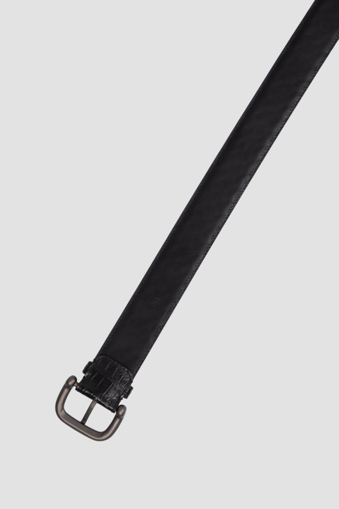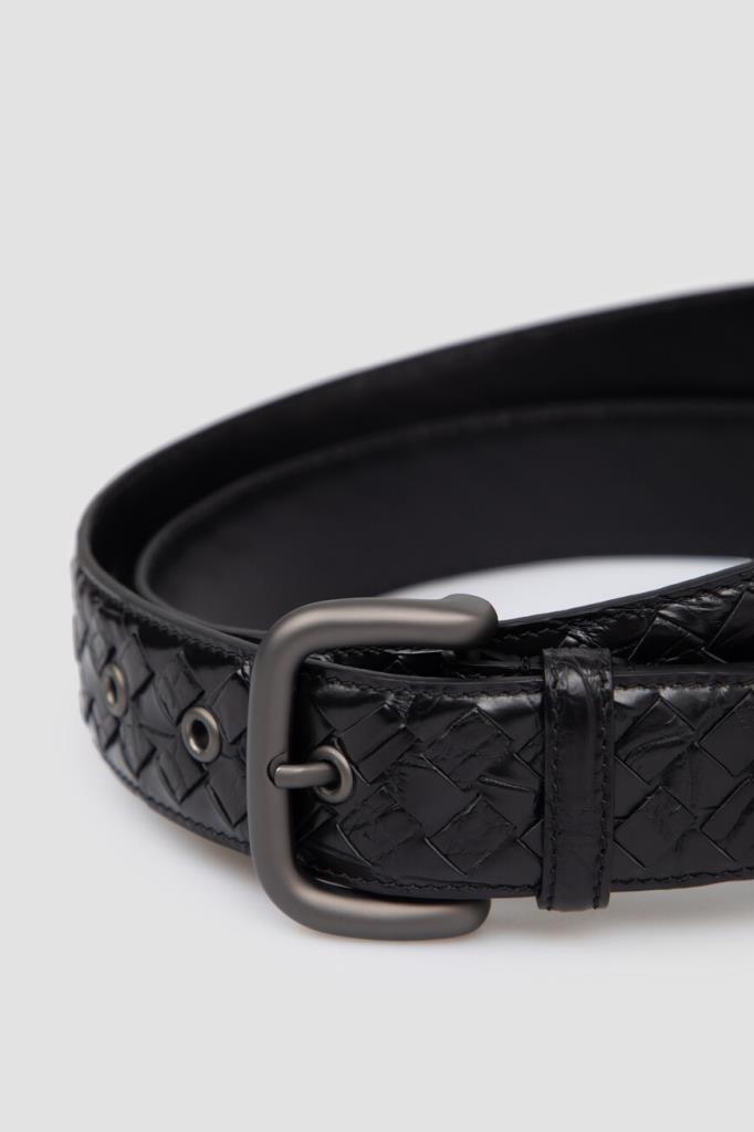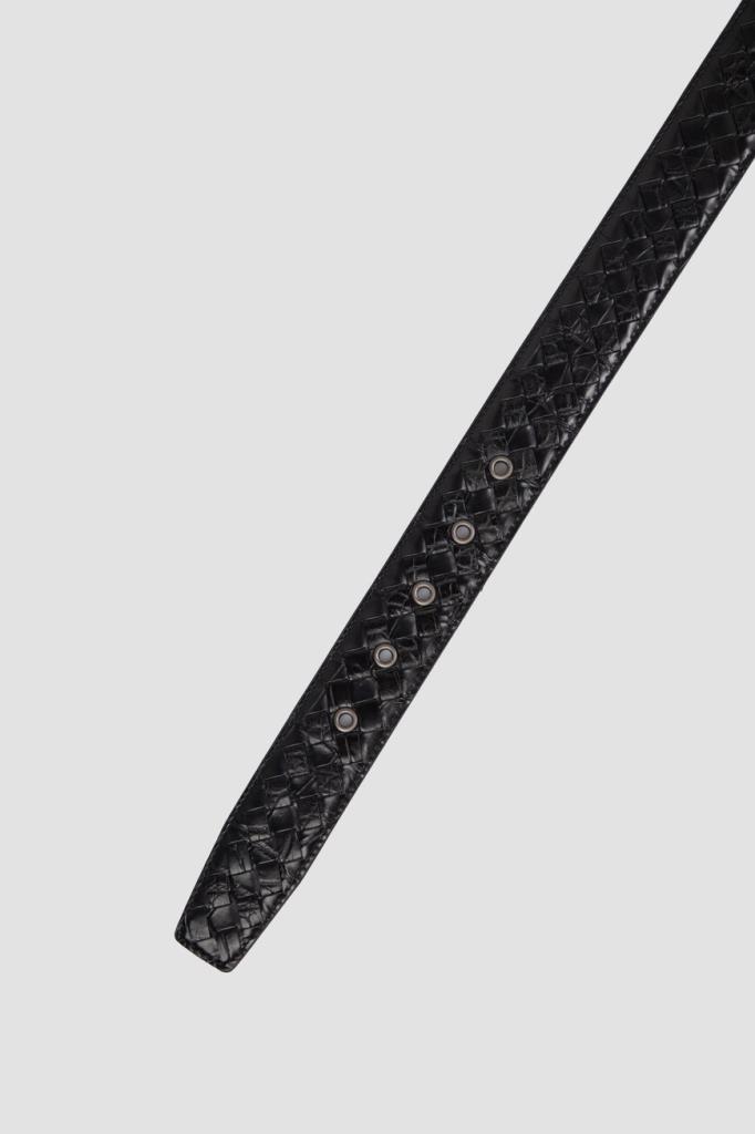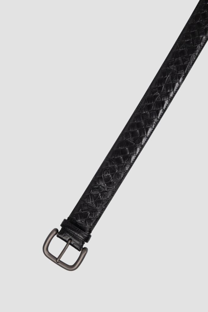 Широкий кожаный ремень Fargoni с деликатным блеском. Плетёный аксессуар выполнен из натуральной кожи крокодила чёрного цвета и дополнен серой матовой пряжкой. Отличительными особенностями изделия стали прострочка по краю и подкладка из мягкой телячьей кожи в тон.