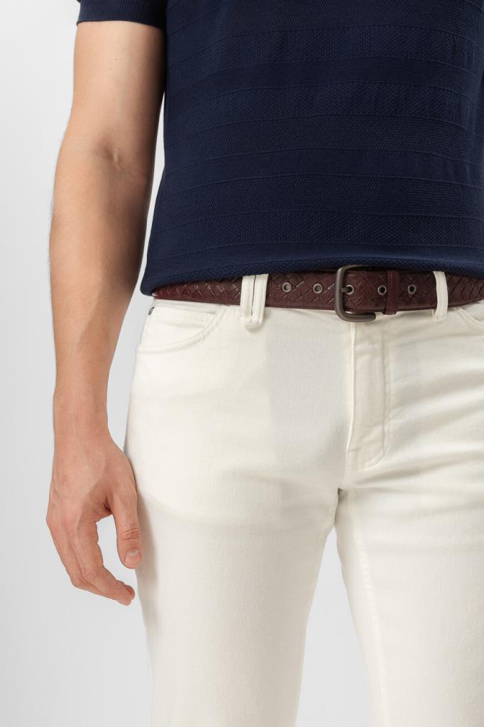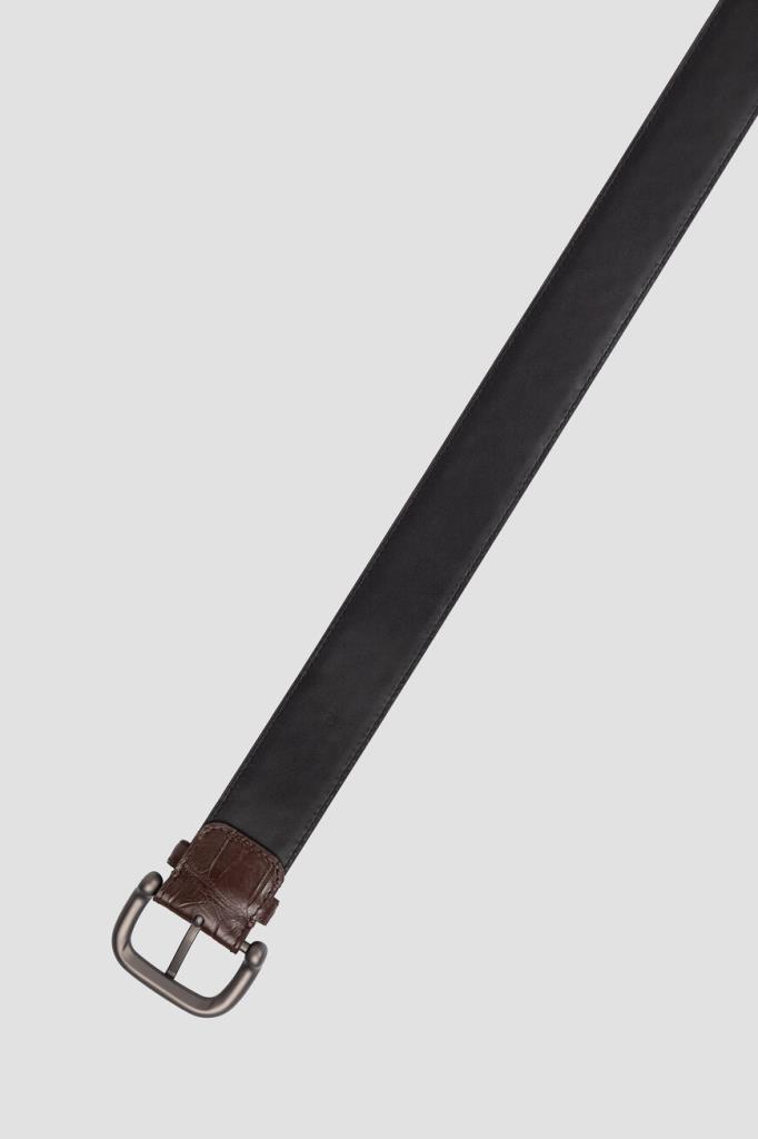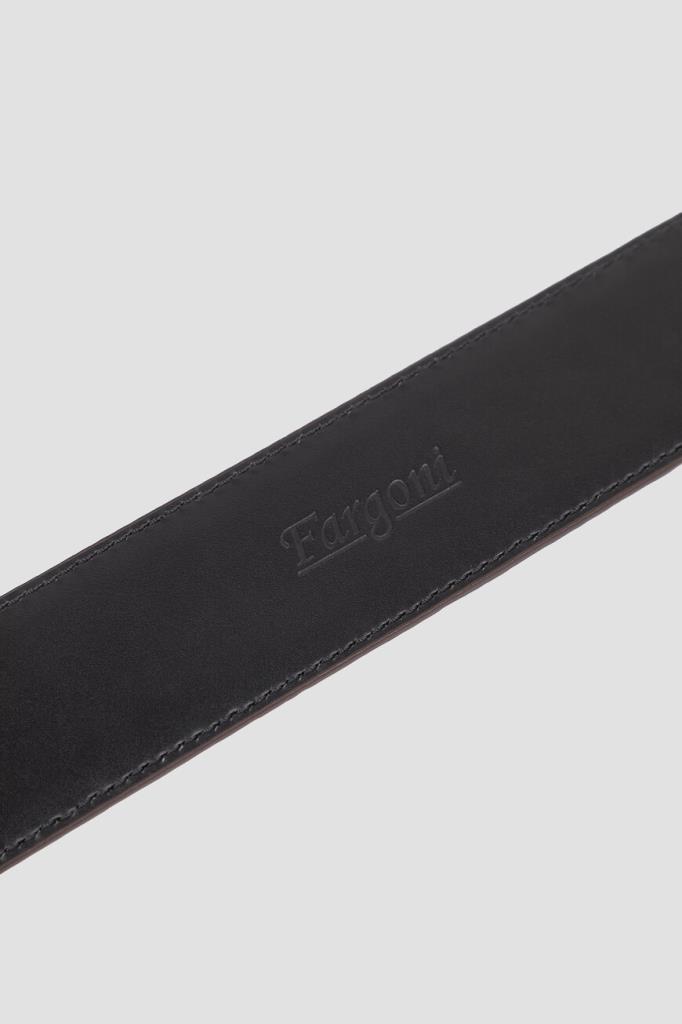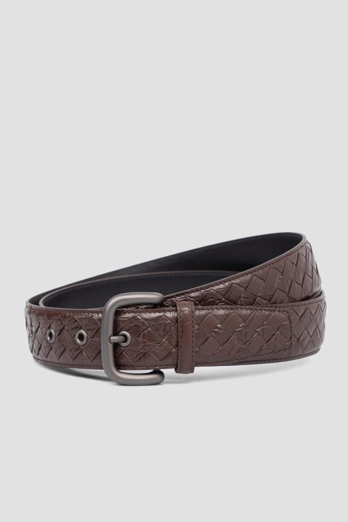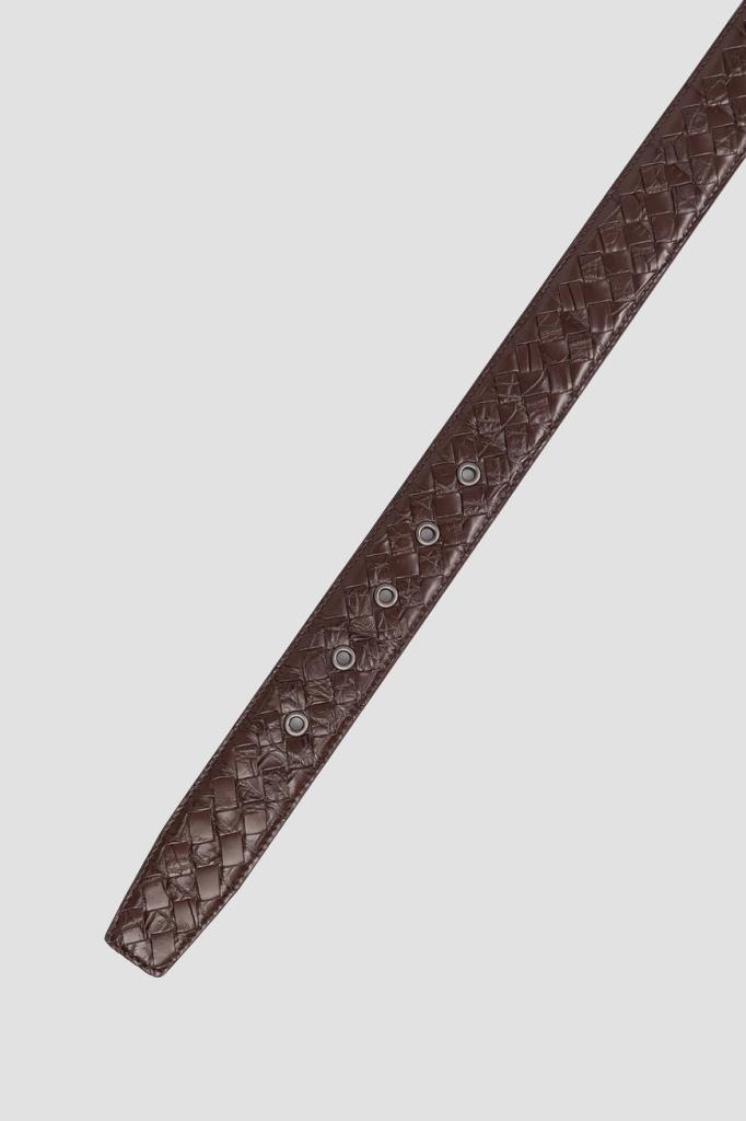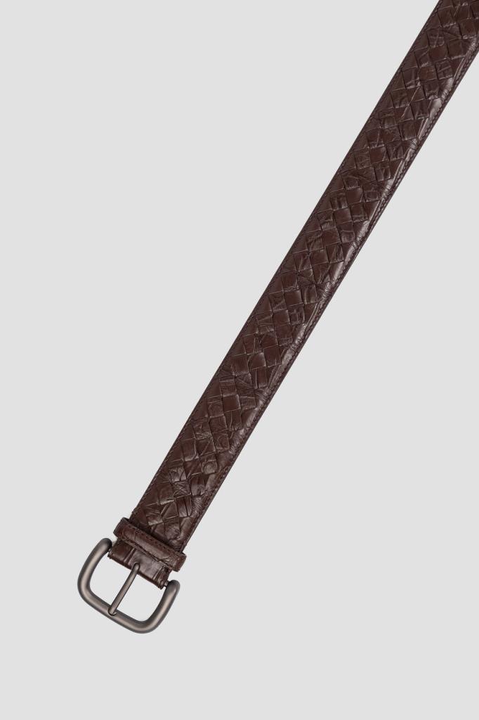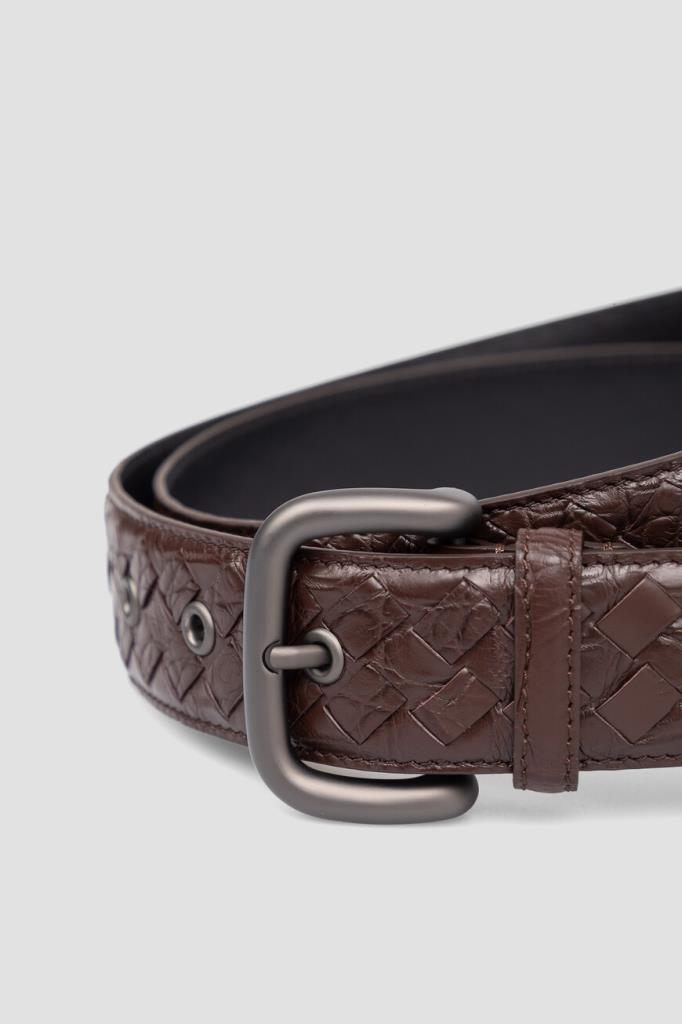 Тёмно-коричневый ремень Fargoni выполнен вручную из мягкого фактурного материала. Поверхность изделия покрыта плетёным узором и природным экзотическим рисунком крокодиловой кожи. Элегантный аксессуар нейтрального оттенка гармонично дополнит и классические брюки, и джинсы.
