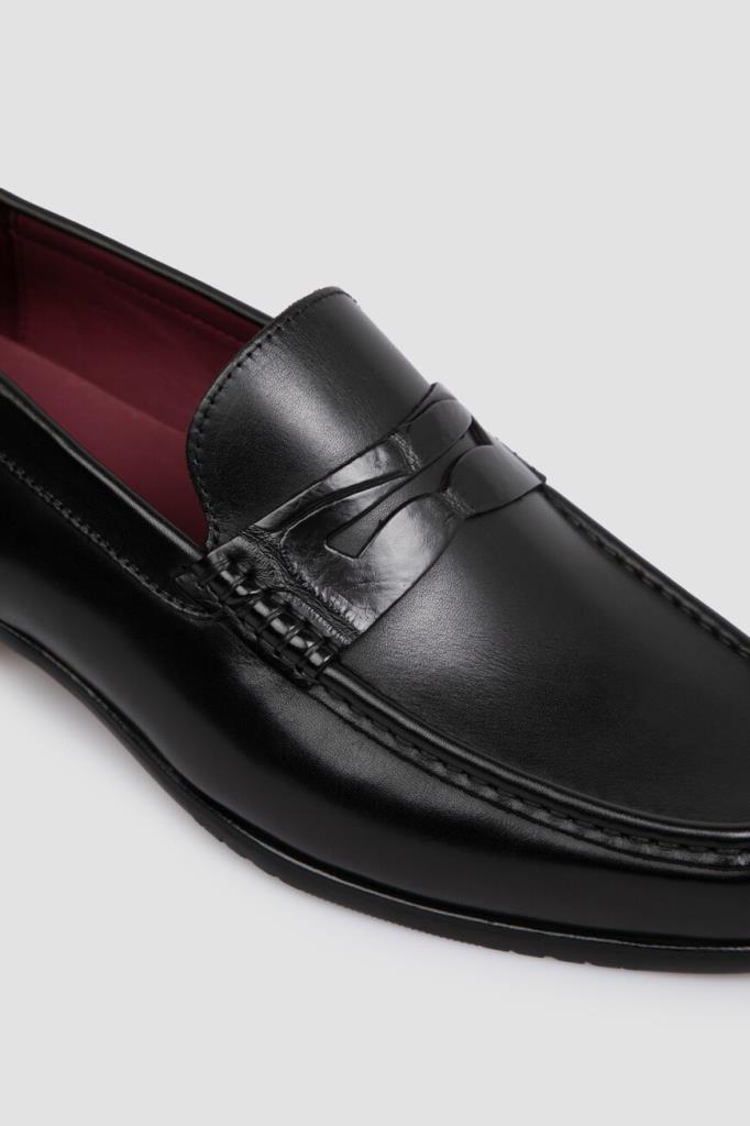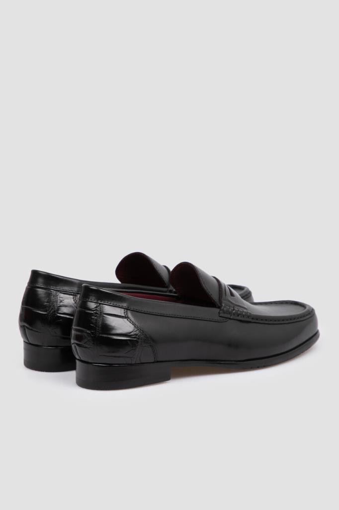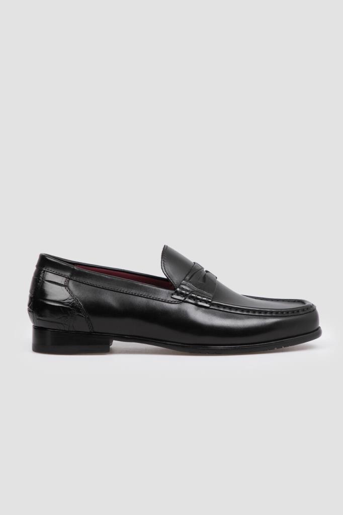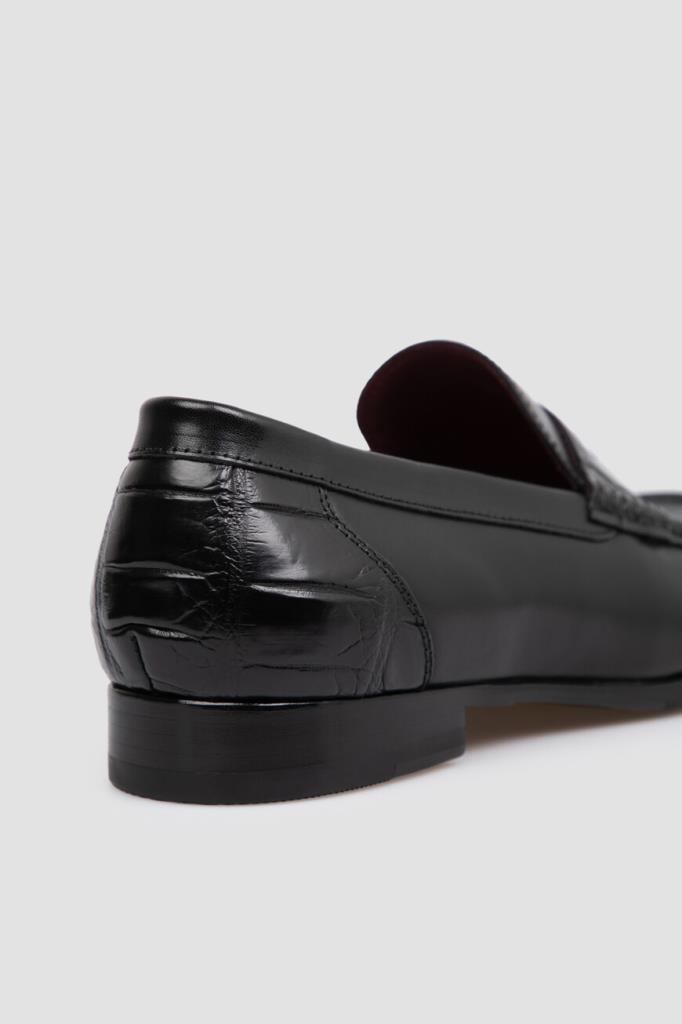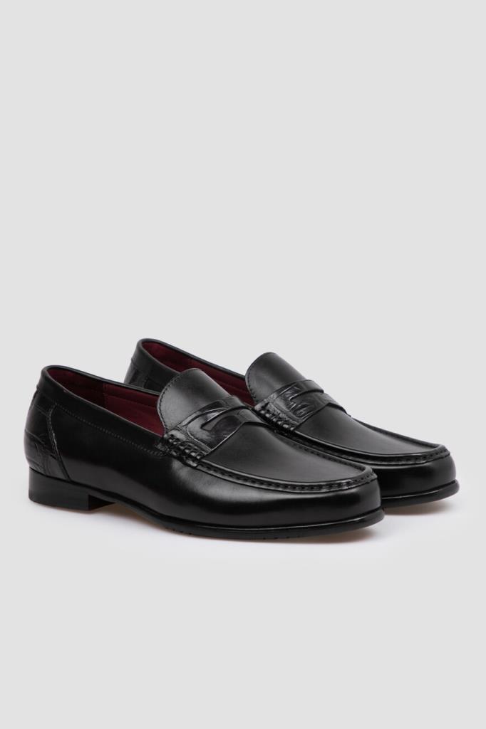 Гладкие кожаные пенни-лоферы от FARGONI. Изделие базового чёрного цвета отличается вставками из фактурной кожи крокодила на мыске и заднике в тон. Пара с традиционным для лоферов рельефным округлым швом, повторяющим форму мыса, удобно облегает стопу, не сдавливая и не натирая. Атрибутом бренда стал тиснёный логотип на бордовых стельках.