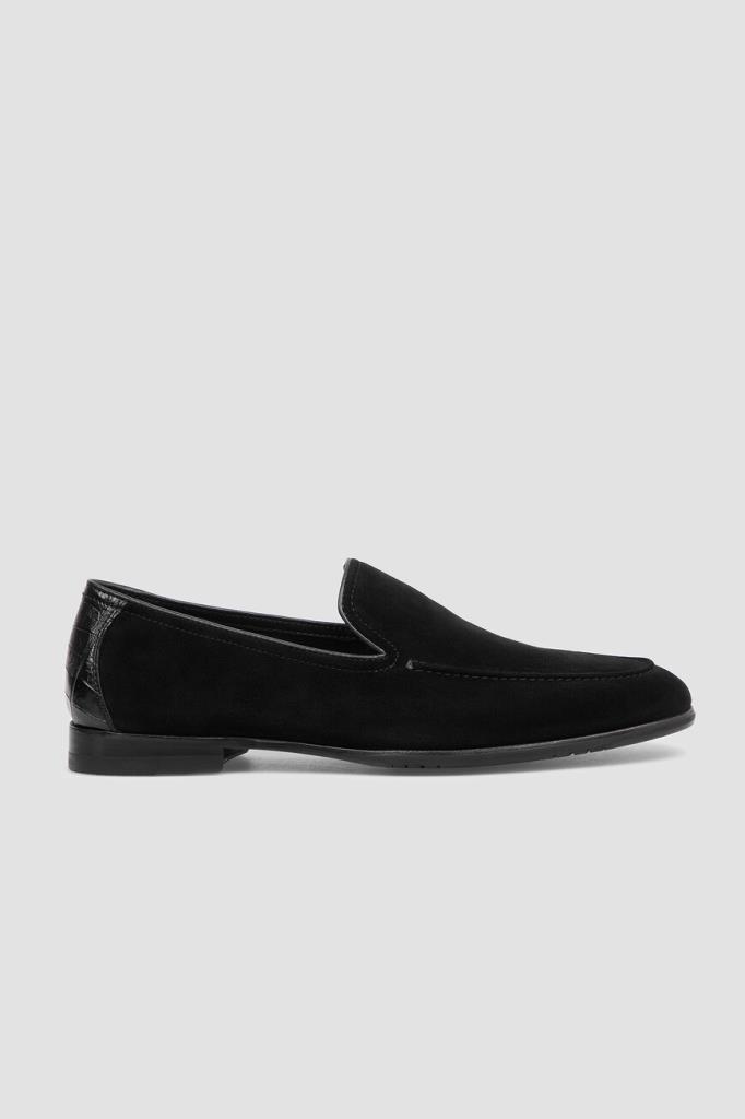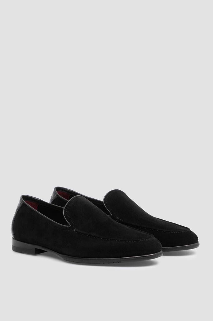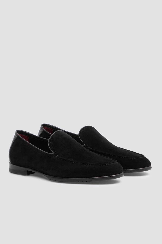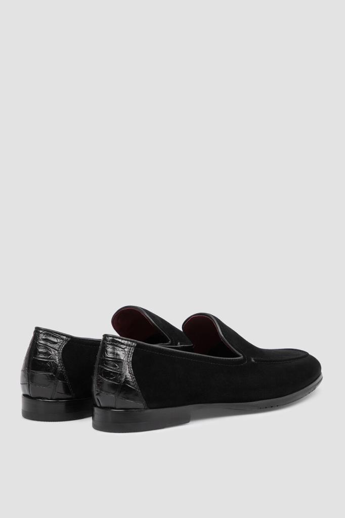 Чёрные лоферы FARGONI с прострочкой на швах. Модель с овальным миндалевидным носком изготовлена из мягкой бархатистой замши, быстро принимающей форму стопы. Форма мыса подчёркнута традиционным рельефным швом. Задник украшен вставкой из фактурной кожи крокодила в тон, а верх изделия обрамлён кожаной полосой-кантом. Пара на кожаной подошве с невысоким наборным каблуком станет эффектным завершающим штрихом Вашего образа.
