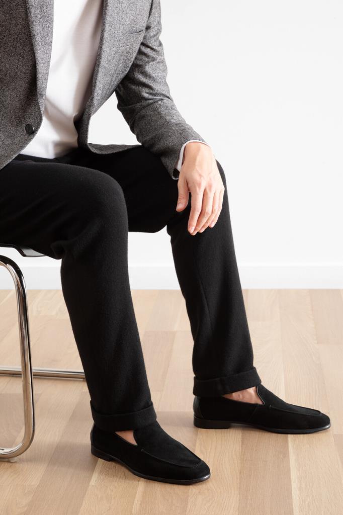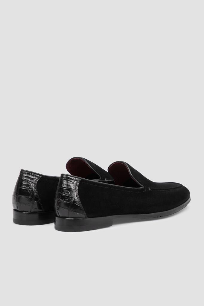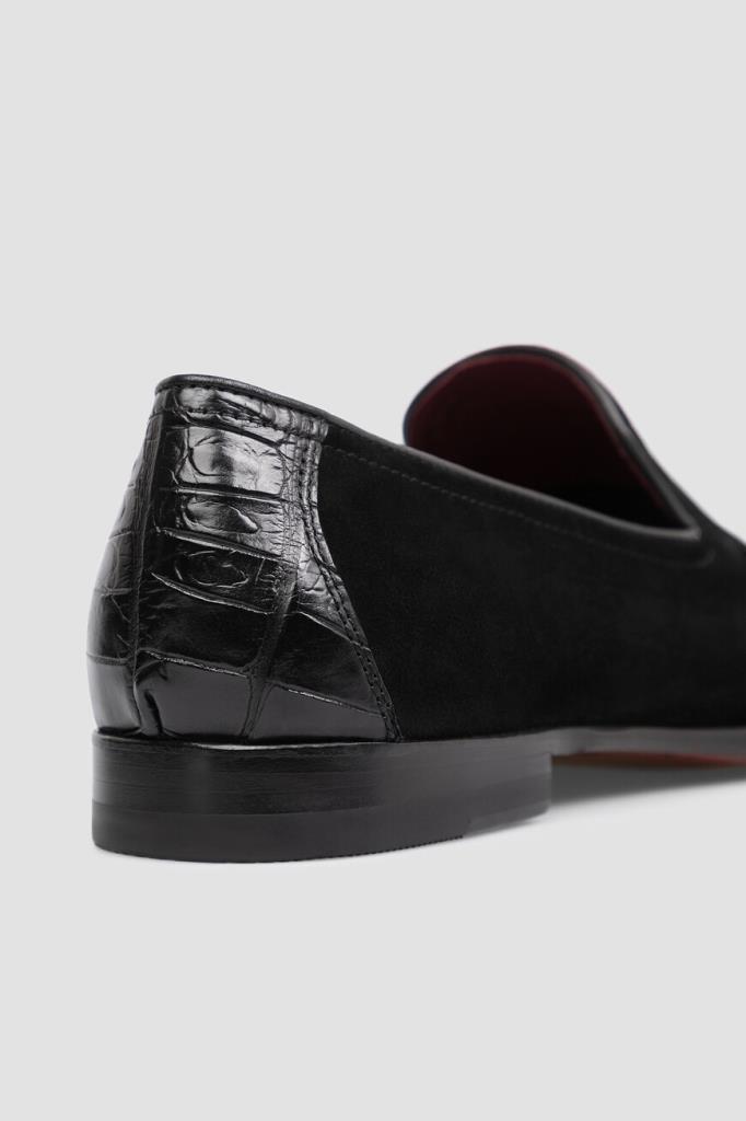 Чёрные лоферы FARGONI с прострочкой на швах. Модель с овальным миндалевидным носком изготовлена из мягкой бархатистой замши, быстро принимающей форму стопы. Форма мыса подчёркнута традиционным рельефным швом. Задник украшен вставкой из фактурной кожи крокодила в тон, а верх изделия обрамлён кожаной полосой-кантом. Пара на кожаной подошве с невысоким наборным каблуком станет эффектным завершающим штрихом Вашего образа.