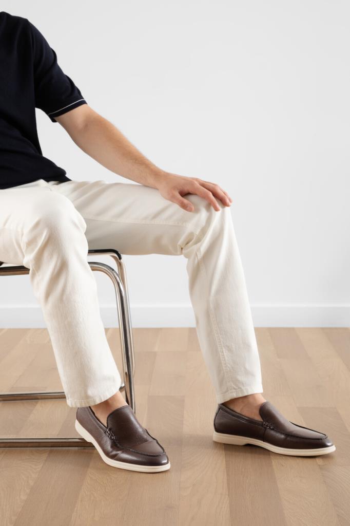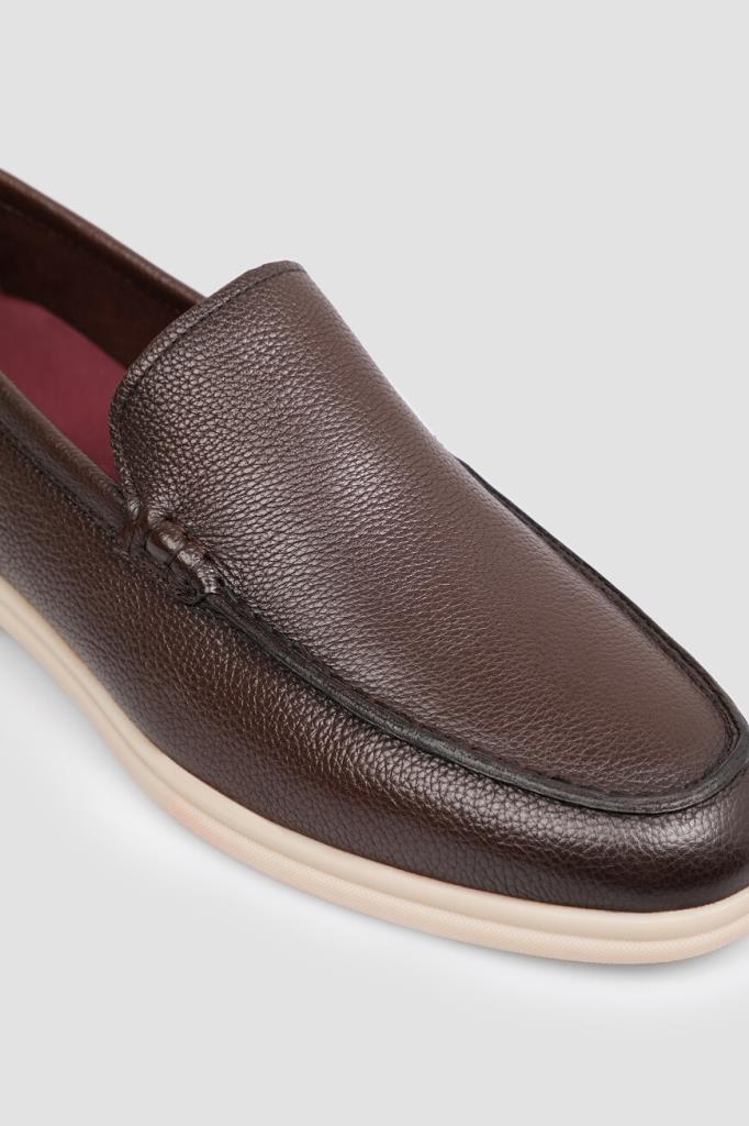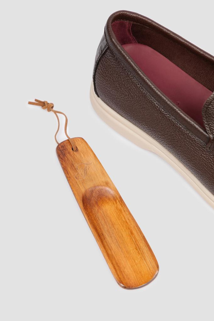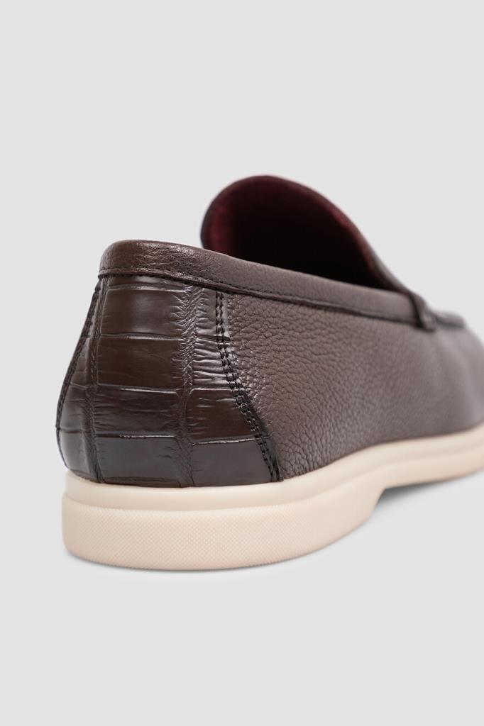 Тёмно-коричневые лоферы FARGONI с брендированными бордовыми стельками. Конструкция повседневной модели из мягкой зернистой кожи телёнка предполагает традиционный рельефный шов и гибкую резиновую подошву с небольшим утолщением в области устойчивого каблука. Декором выступает вставка из фактурной кожи крокодила на заднике в тон. В комплекте - коричневый деревянный рожок с брендированием.