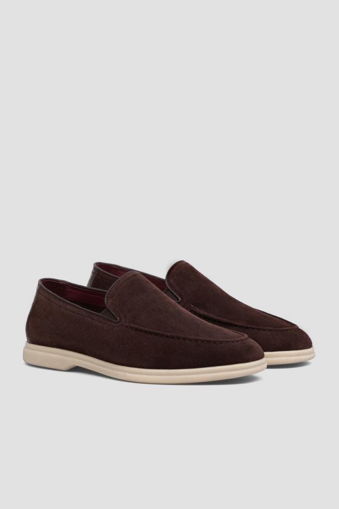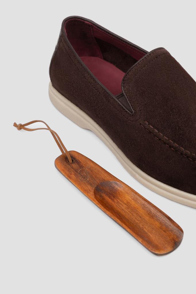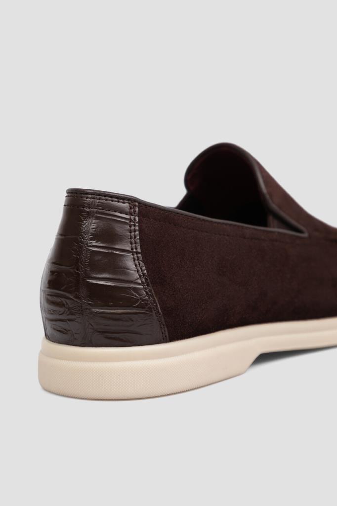 Лоферы FARGONI с традиционным рельефным швом. Модель изготовлена из мягкой бархатистой замши тёмно-коричневого цвета и оснащена вставкой из фактурной кожи крокодила на заднике в тон. Пару удобно надевать и снимать благодаря эластичным боковым вставкам под язычком и коричневому деревянному рожку для обуви, идущему в комплекте.