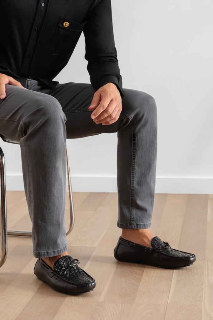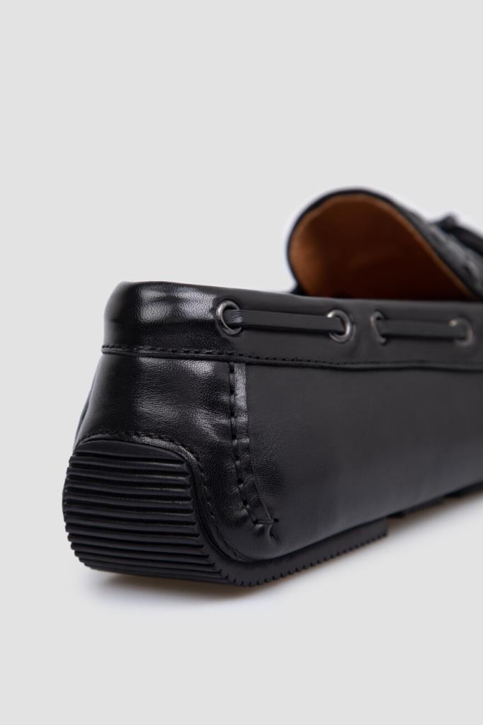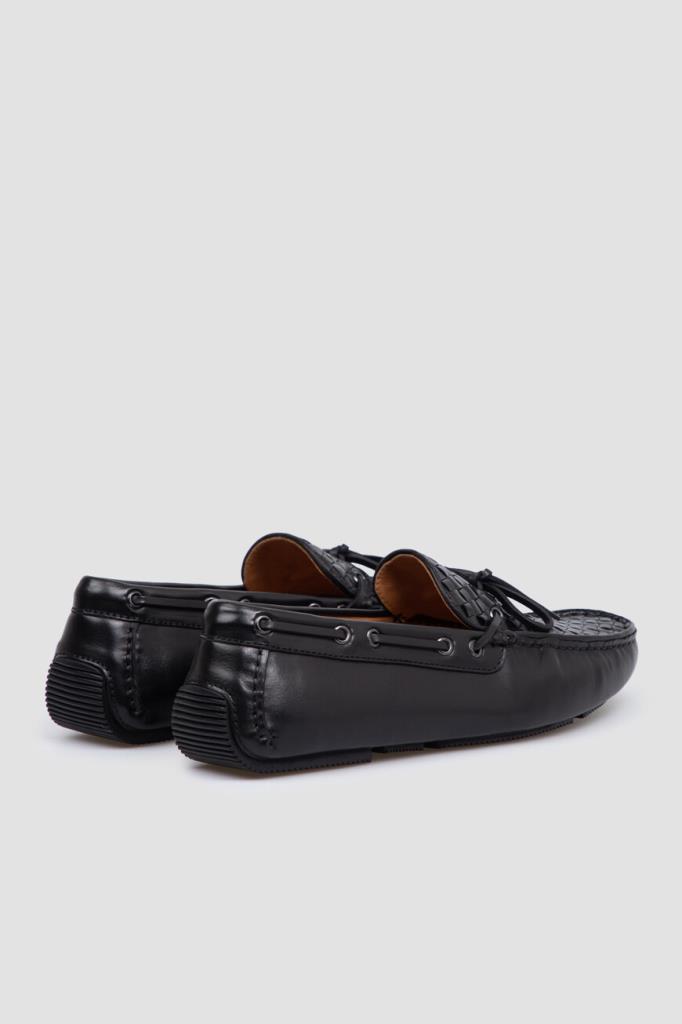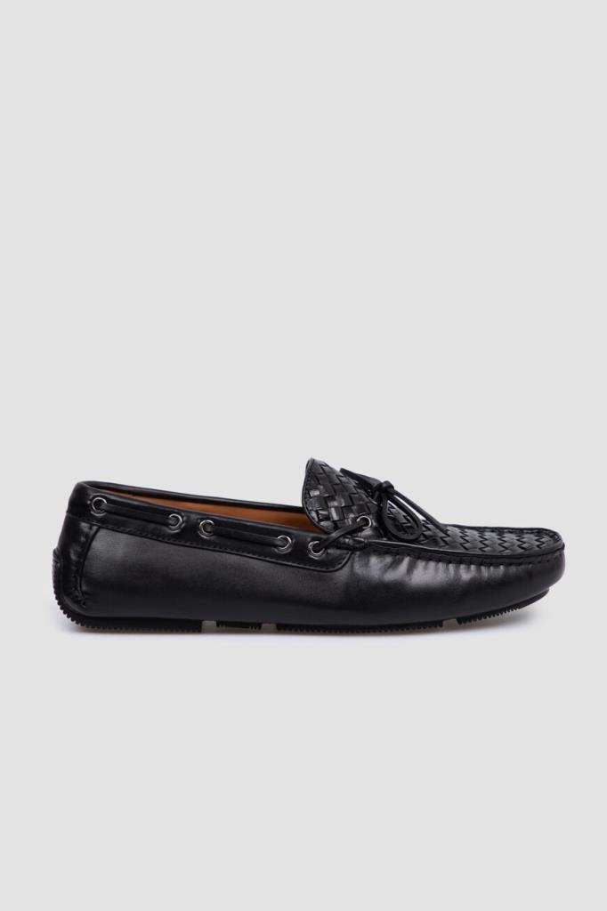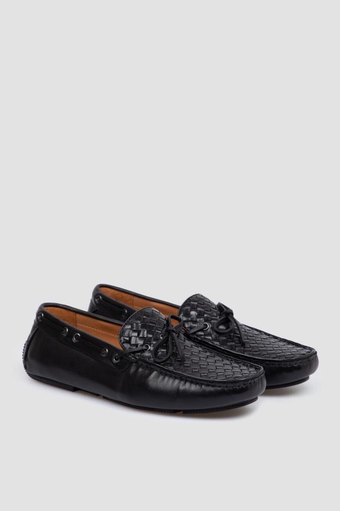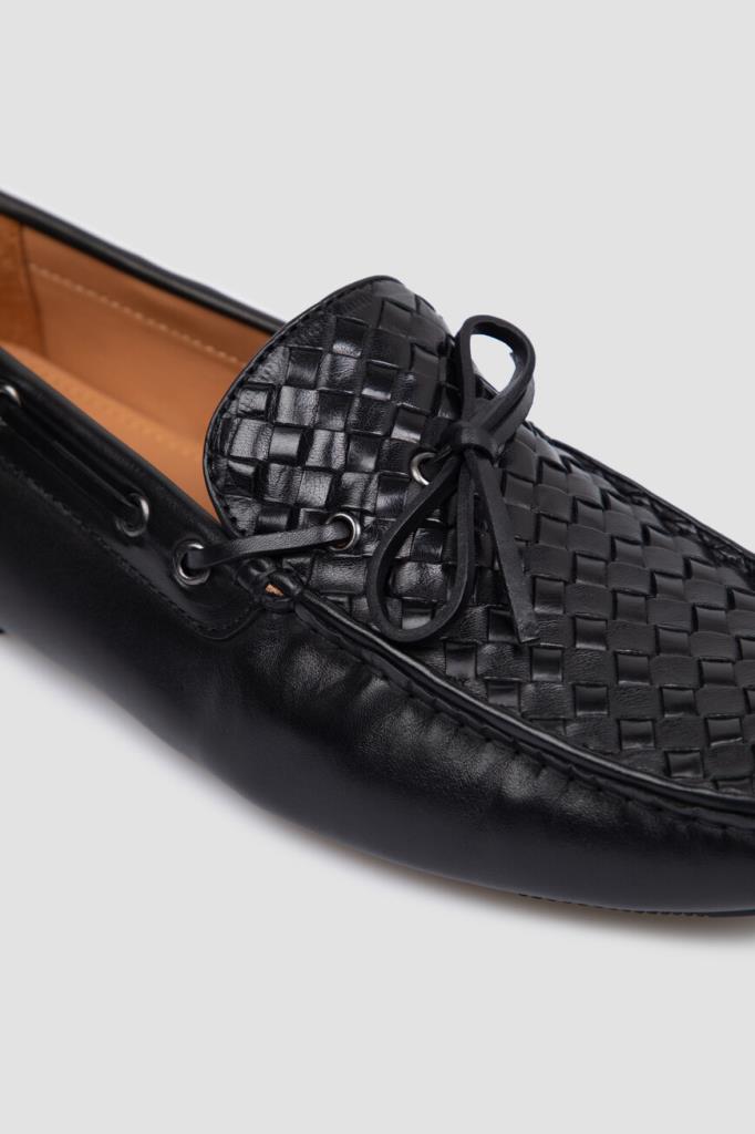 Мокасины FARGONI с декоративным кожаным шнуром в тон. Пара из гладкой натуральной кожи телёнка выполнена в чёрном цвете и оснащена коричневой внутренней отделкой из кожи и замши. Отличительными деталями являются шнур, продетый в люверсы вдоль верхней части изделия и завязанный узлом на союзке, и плетёный фактурный узор спереди.