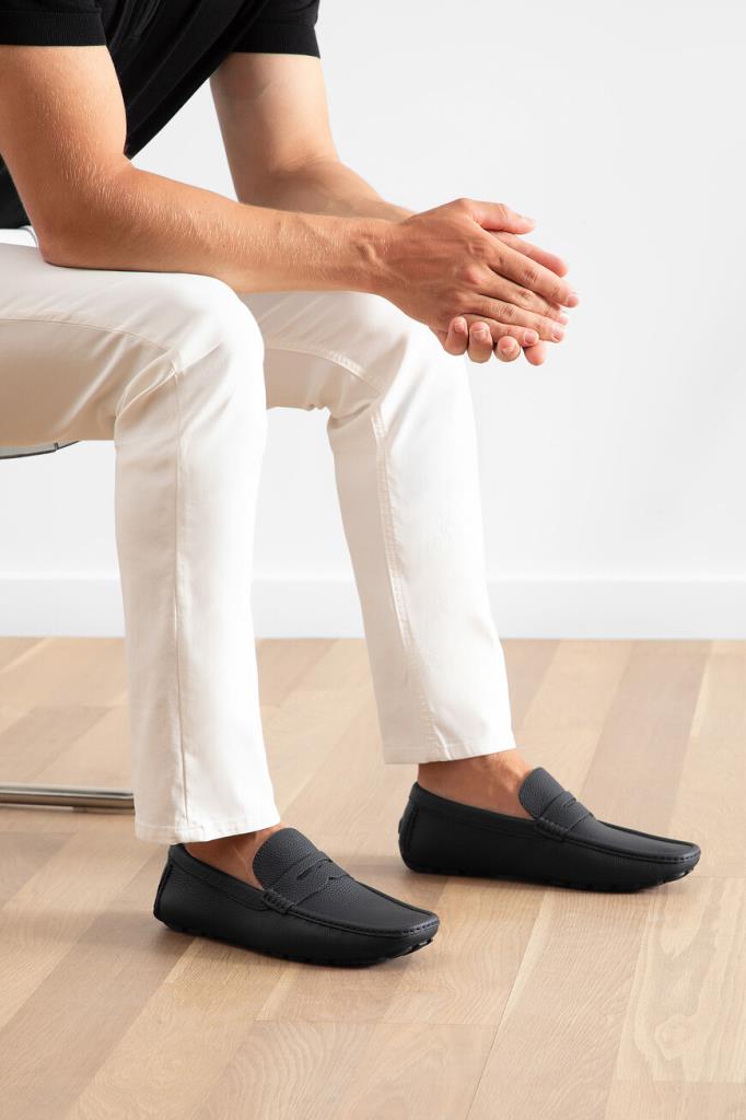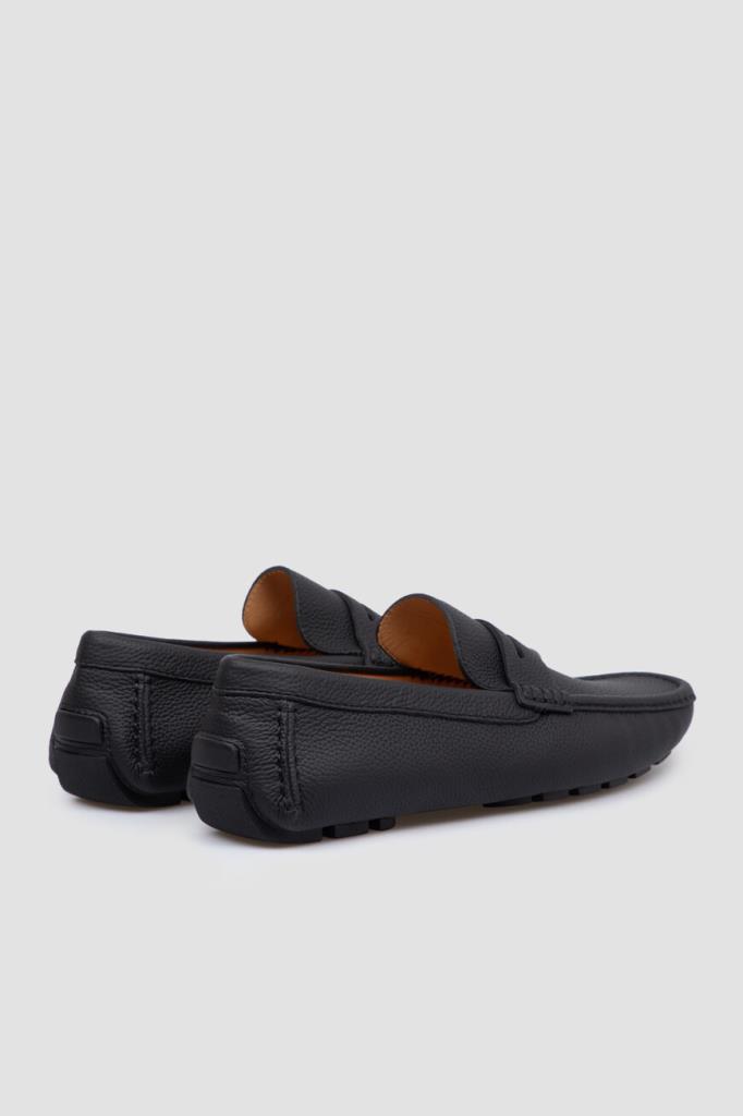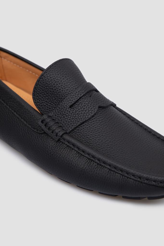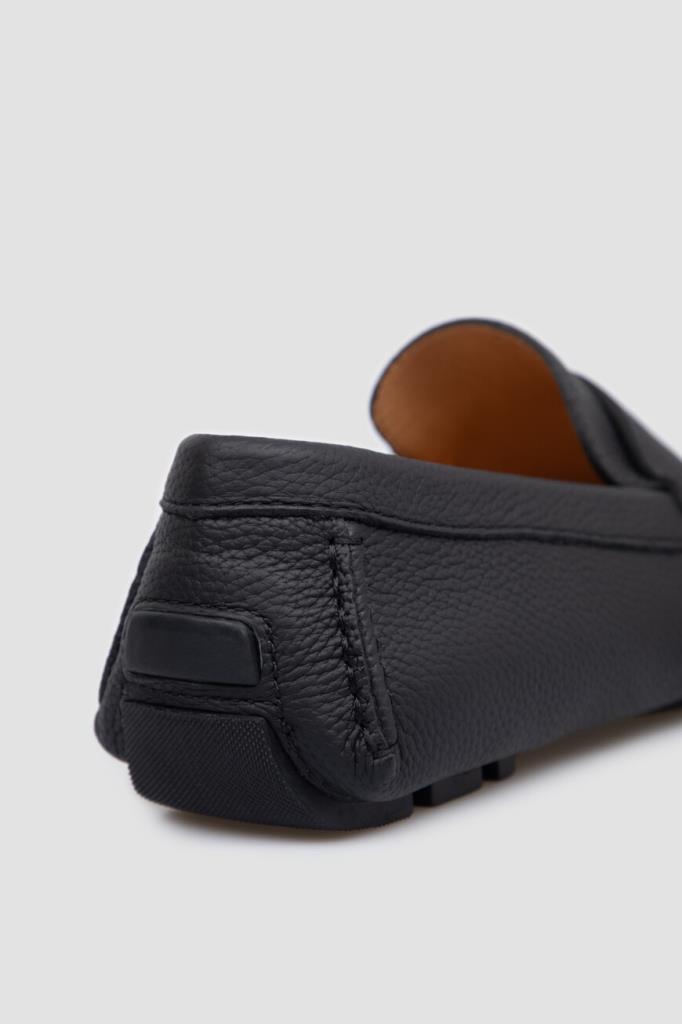 Кожаные мокасины FARGONI с удлинённым квадратным носком. Для изготовления модели с широкой колодкой выбрана зернистая телячья кожа чёрного цвета. Изделие оснащено классическим поперечным ремешком с прорезью в тон и плоской рельефной подошвой для дополнительной устойчивости и надёжного сцепления с дорогой.