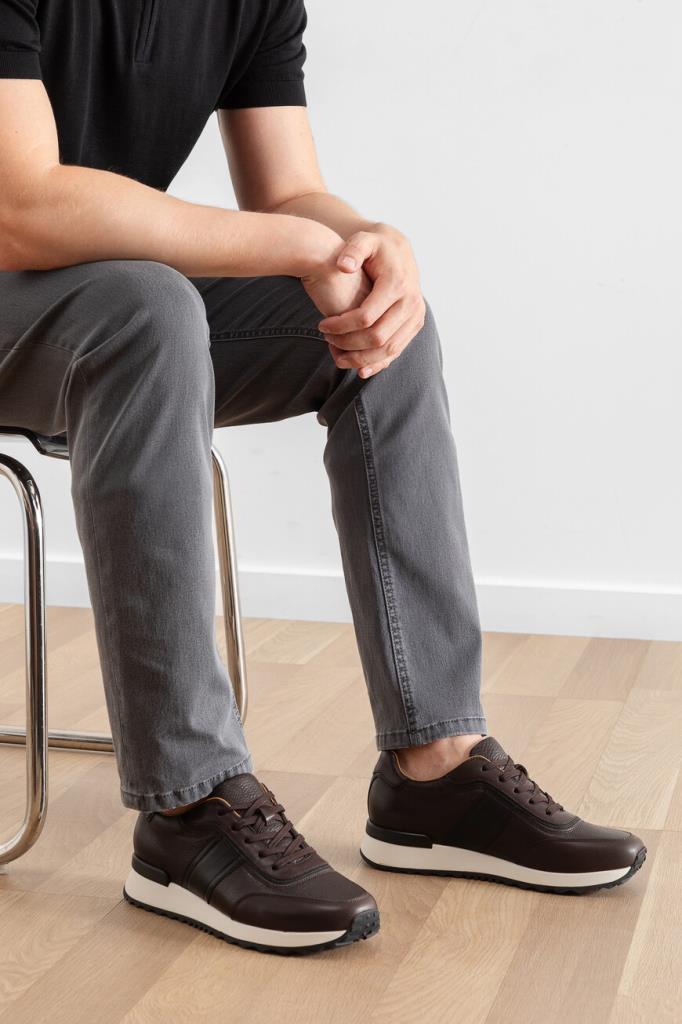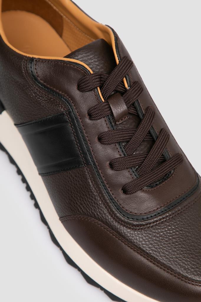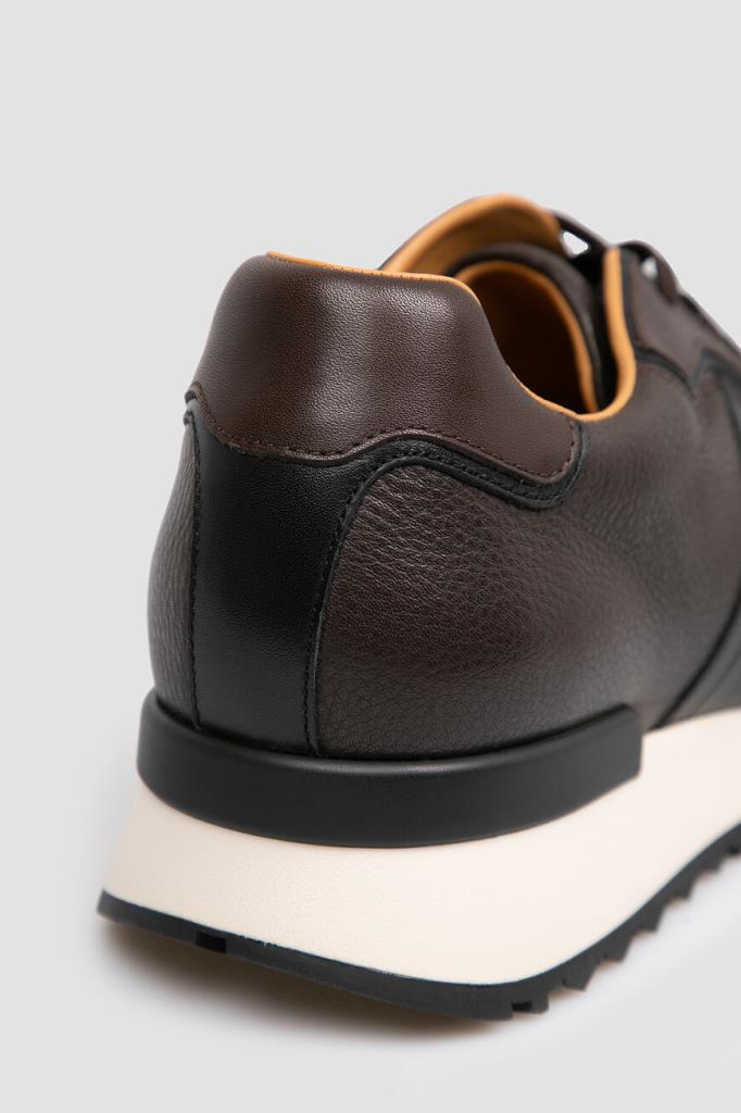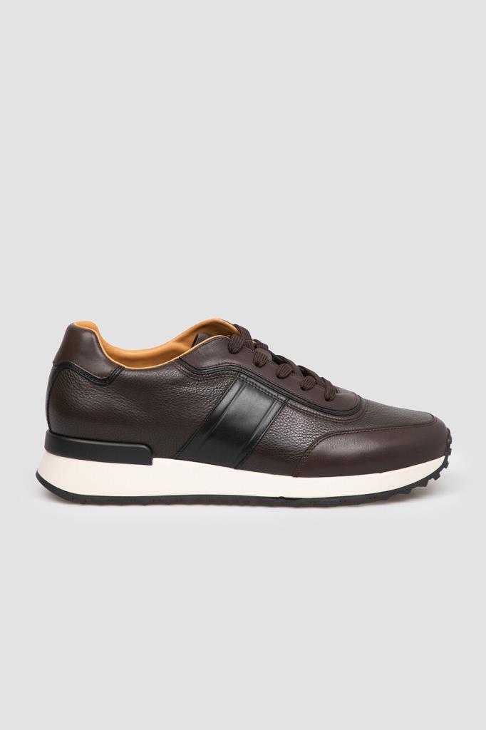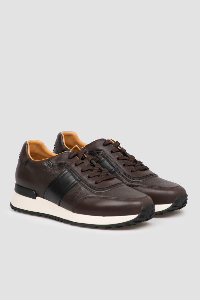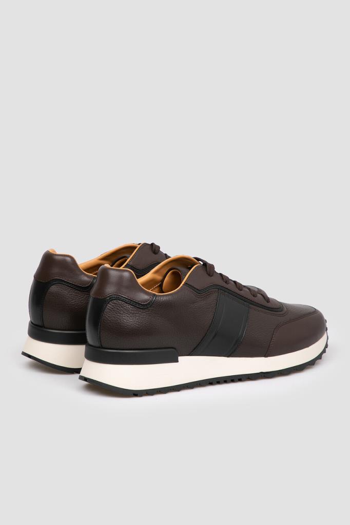 Тёмно-коричневые кроссовки с широкой колодкой от FARGONI. Модель изготовлена из мягкой зернистой кожи телёнка, устойчивой к появлению царапин, и дополнена чёрными и тёмно-коричневыми вставками с гладкой текстурой на носке, уровне планки шнуровки, заднике и полосами на боковинах. Внутри - брендированные стельки и подкладка из натуральной телячьей кожи.