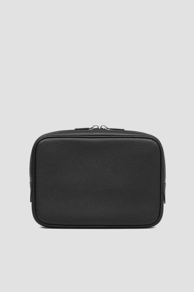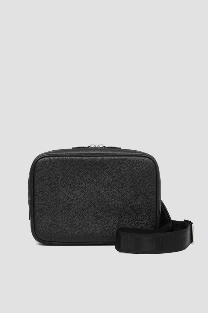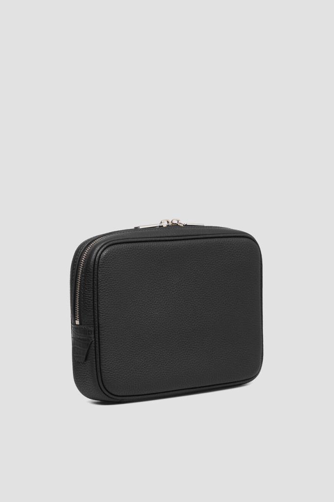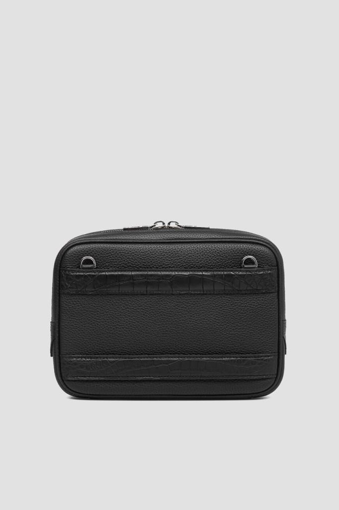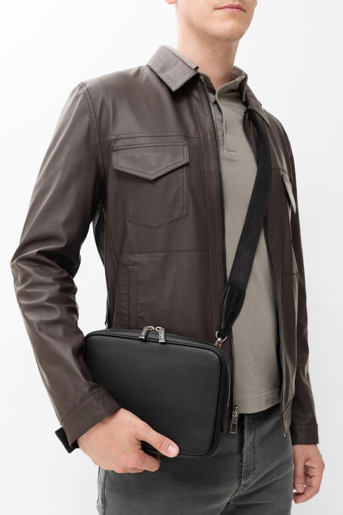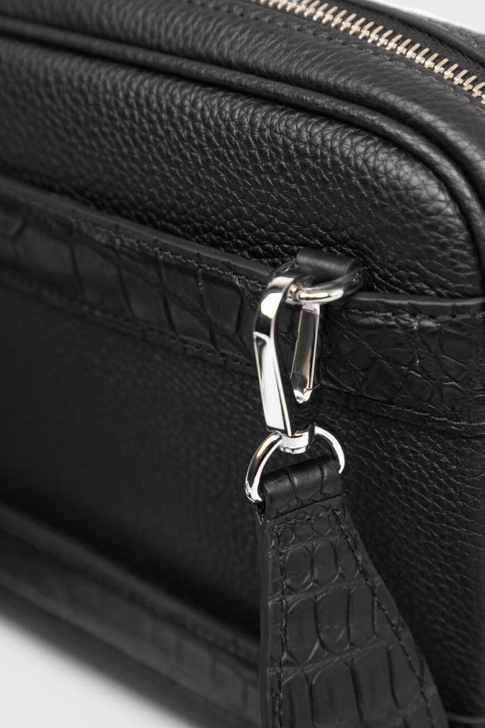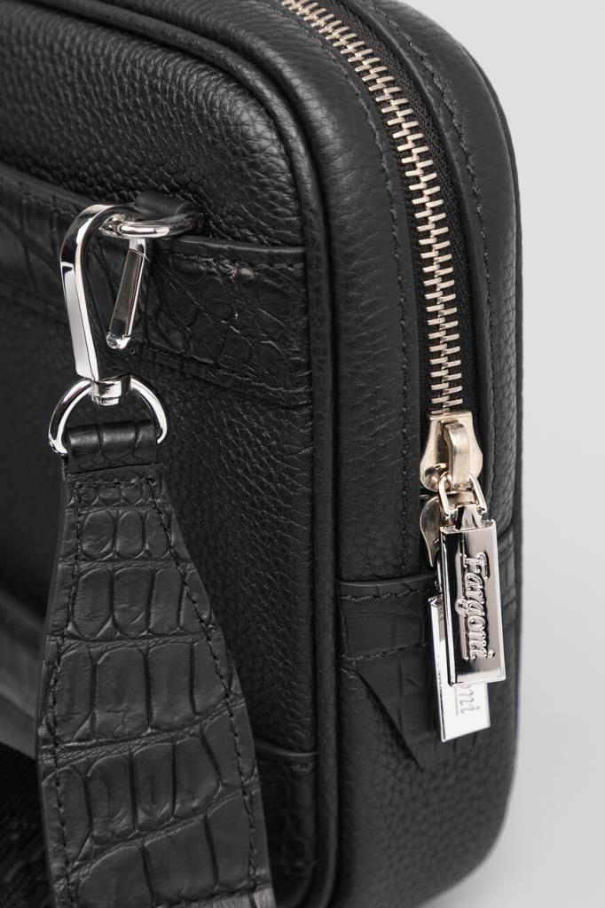 Небольшая сумка с ремешками-креплениями на чемодан сзади от FARGONI. Модель изготовлена из зернистой телячьей кожи чёрного цвета и дополнена деталями из мягкой фактурной кожи крокодила в тон. Изделие удобно носить в руке, на плече или через плечо благодаря регулируемому брендированному ремню из плотного текстиля с серебристыми карабинами.