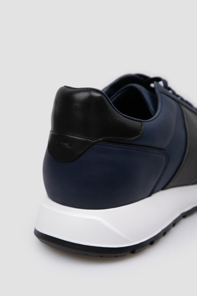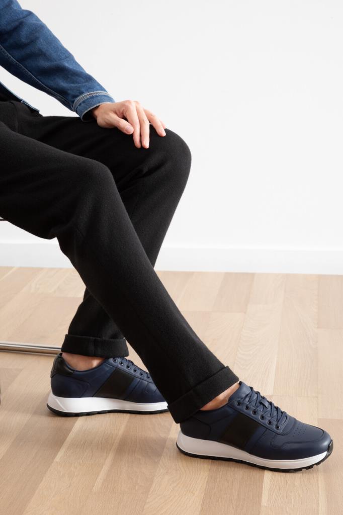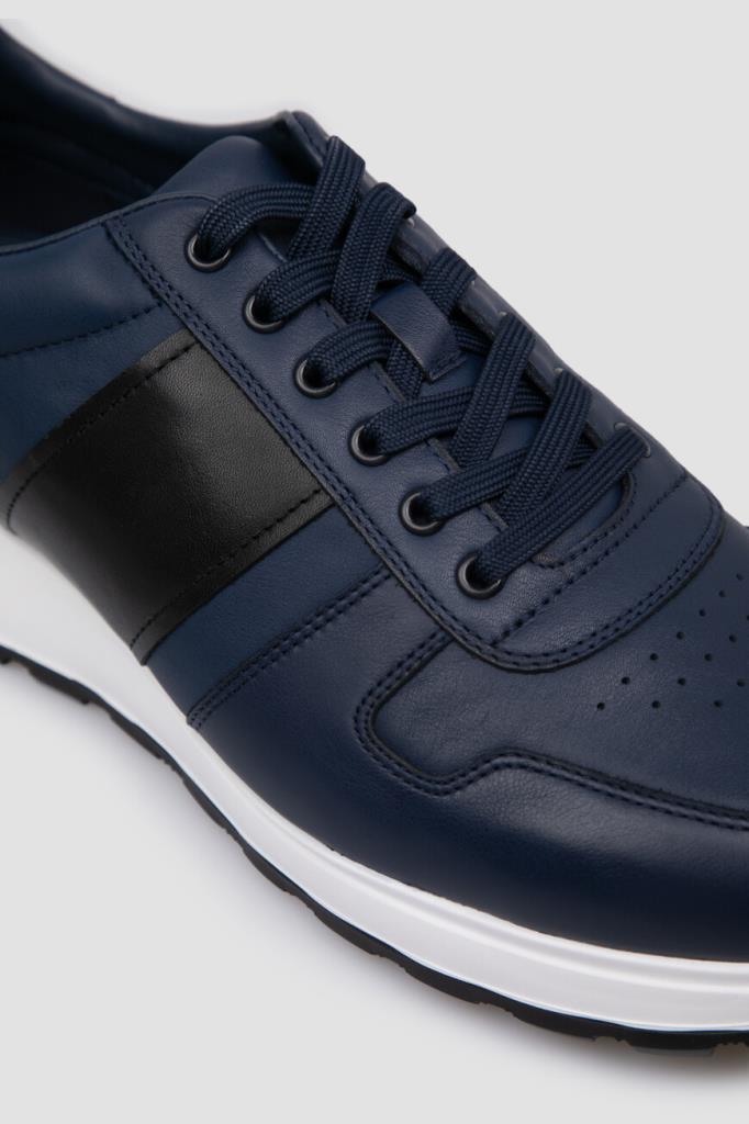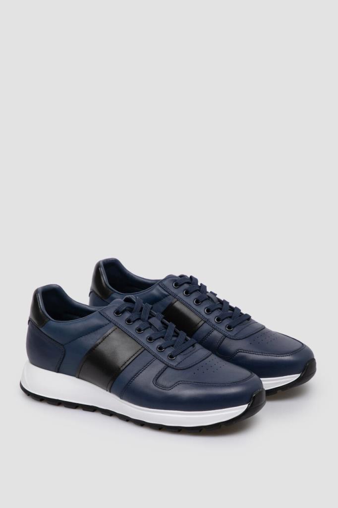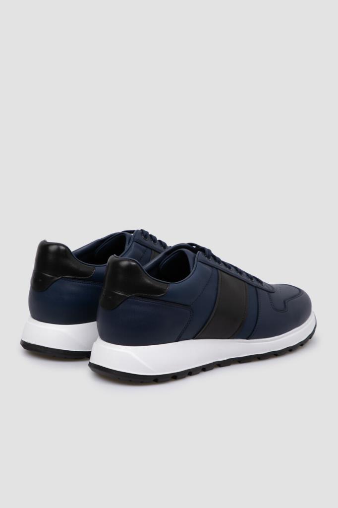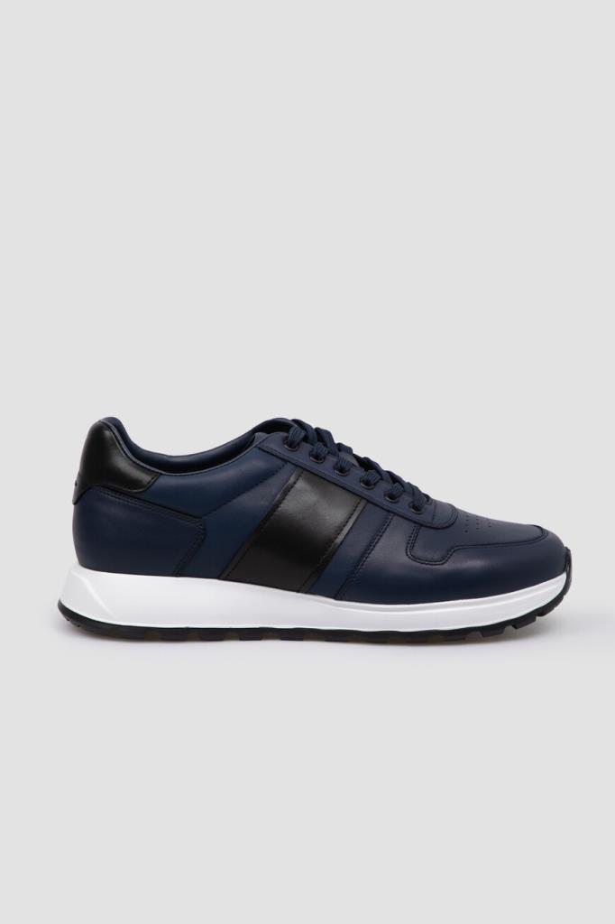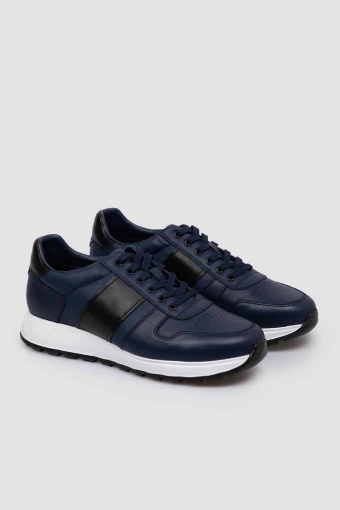 Кроссовки FARGONI с перфорацией на носке и широкой колодкой. Для создания удобной пары выбрана мягкая телячья кожа тёмно-синего цвета с гладкой текстурой. Отличительными особенностями изделия являются чёрные вставки по бокам (полосы) и на заднике, а также чёрно-белая резиновая подошва с протектором для надёжного сцепления с дорогой.